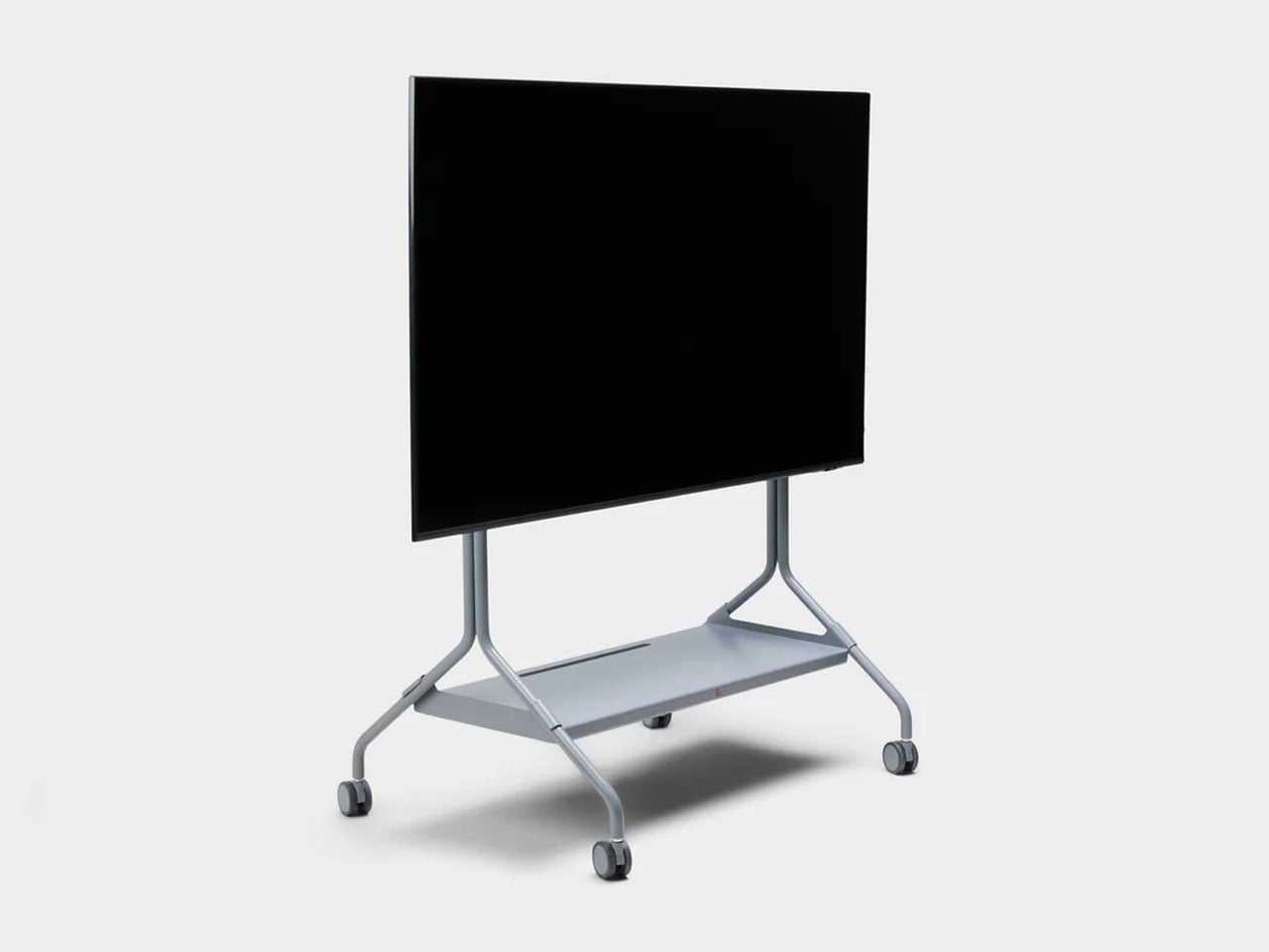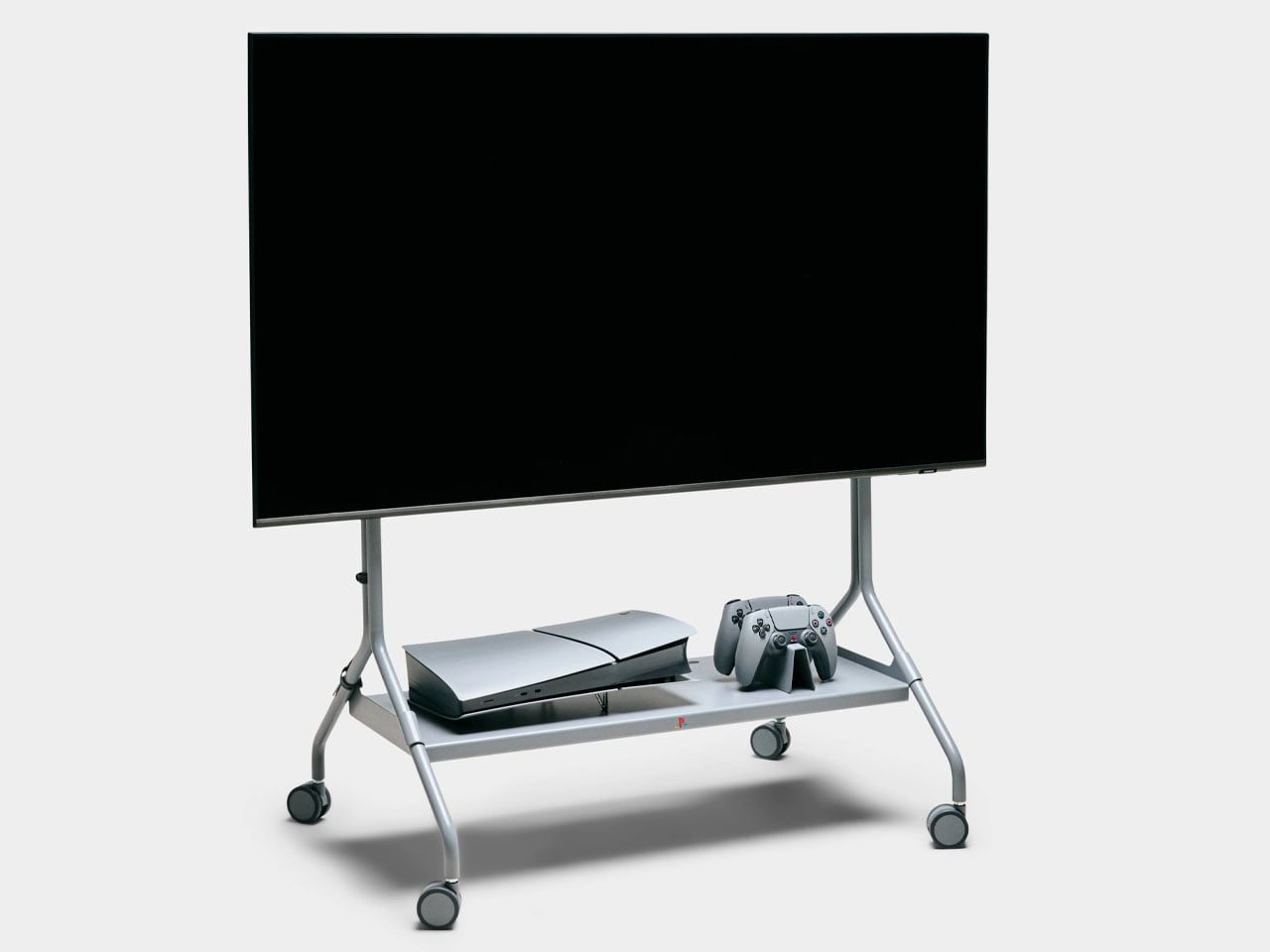 Beyond the nostalgic color palette, the stand follows Pedestal’s minimalist Scandinavian design philosophy. The frame is constructed from powder-coated steel with a satin finish, giving the structure a sturdy and refined appearance while maintaining a relatively lightweight build. Despite the industrial material choice, the design remains clean and understated, allowing the console and TV setup to remain the visual focus. The stand measures roughly 42 inches high, 31 inches wide, and 21 inches deep, and weighs just under 33 pounds, making it substantial enough for stability without feeling overly bulky. It supports flat-screen televisions between 40 and 70 inches and can handle loads of up to about 110 pounds, which comfortably covers most modern TVs and gaming setups.
