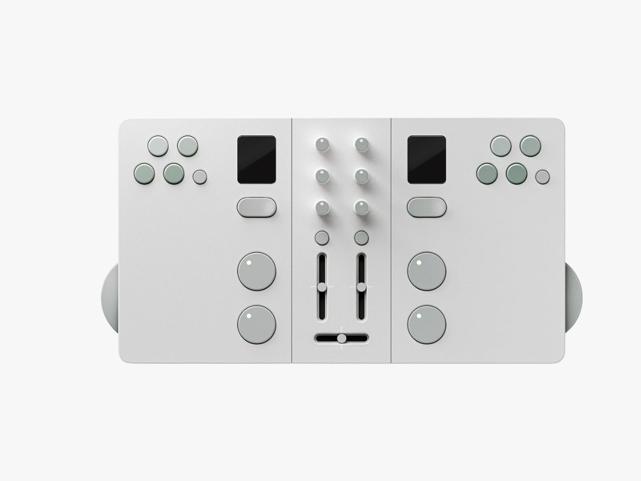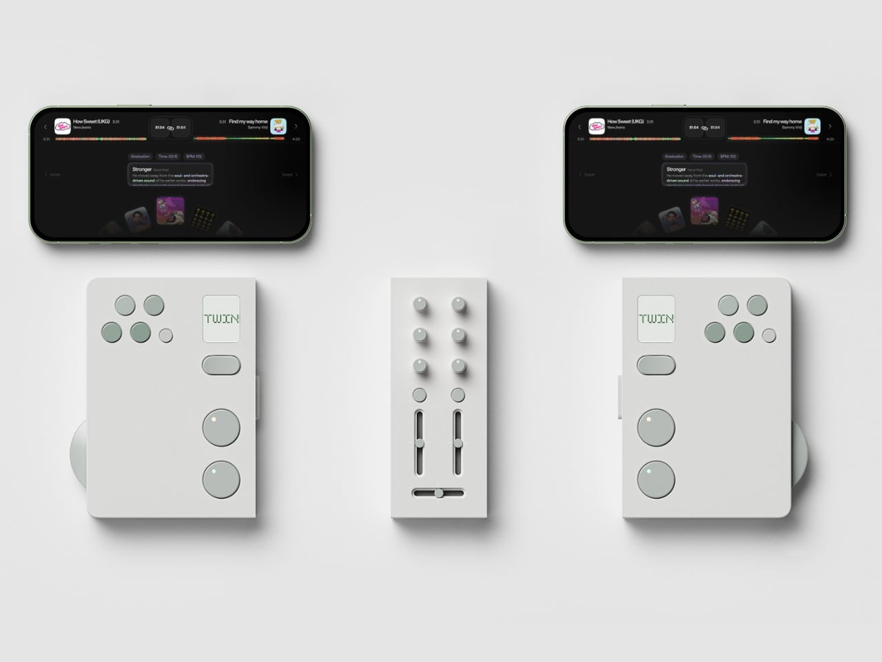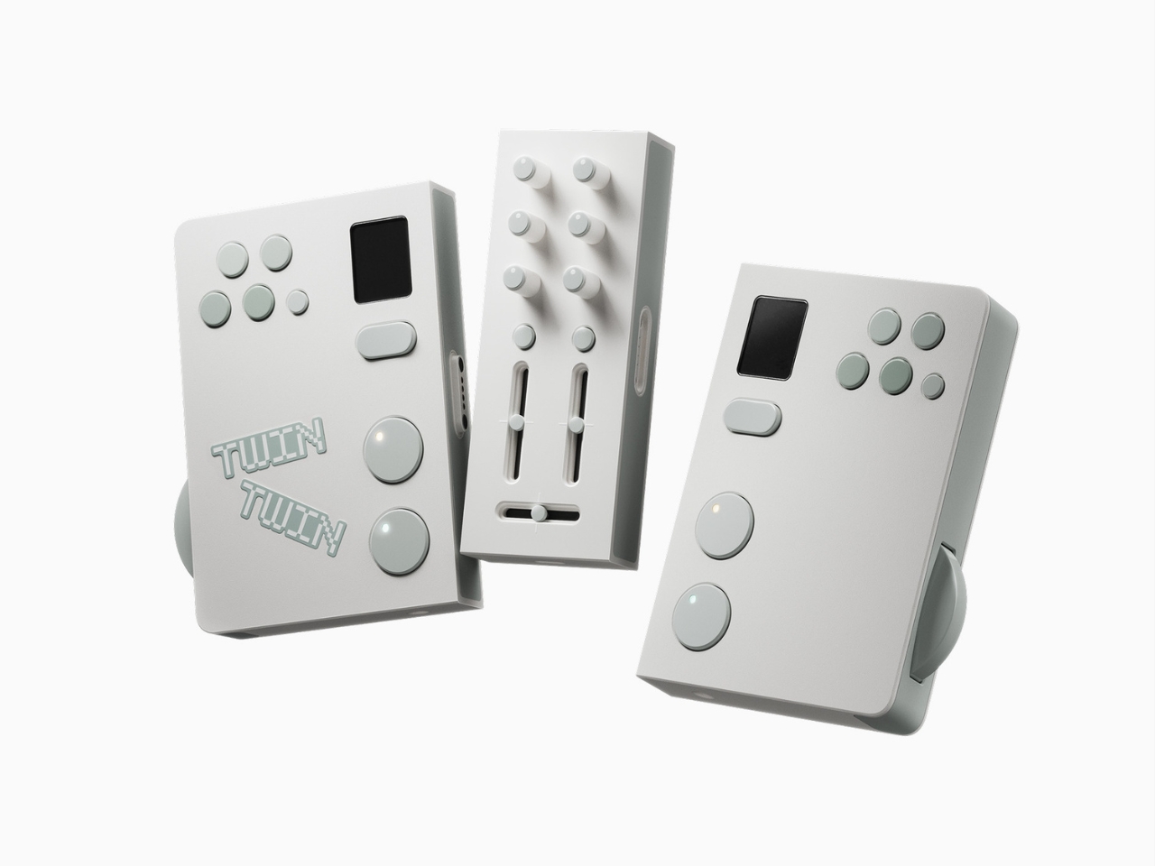 The premise is simple but kind of radical: two DJs, one device. Twin is a modular controller system made up of two mirrored player decks and a shared mixer at the center. Each player gets their own jog wheel, multi keys, sub display, tempo control, cue, play/pause, and hot cue functions. The mixer module in the middle gives both players access to EQ knobs, channel faders, and a crossfader. When connected, the whole system clicks together into one clean unit. When you want to go your separate ways, the modular sections split apart. The physical design of the hardware itself communicates the whole concept: together or apart, the choice is always yours.