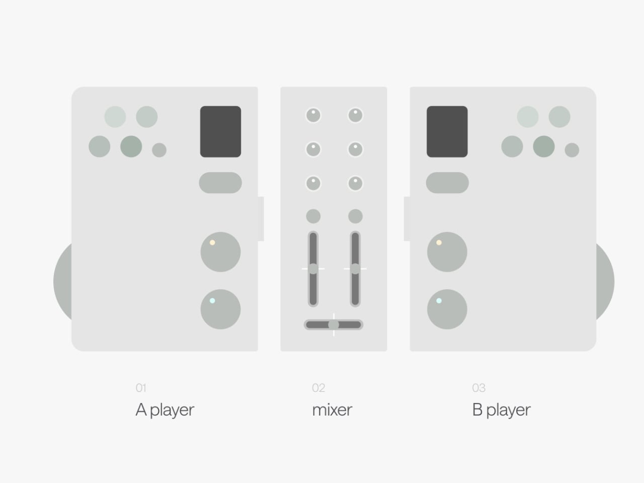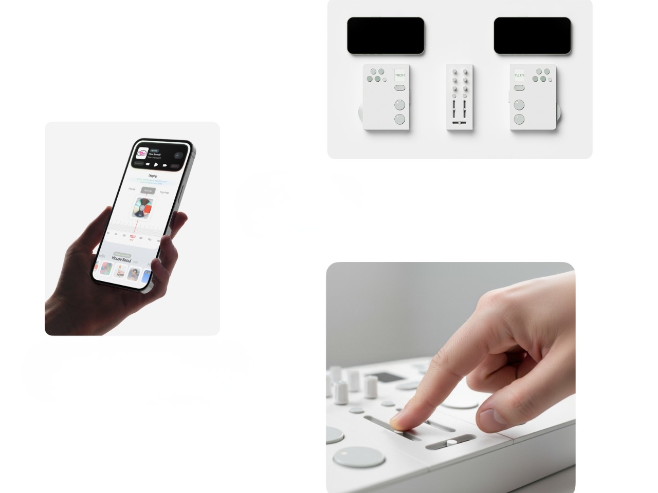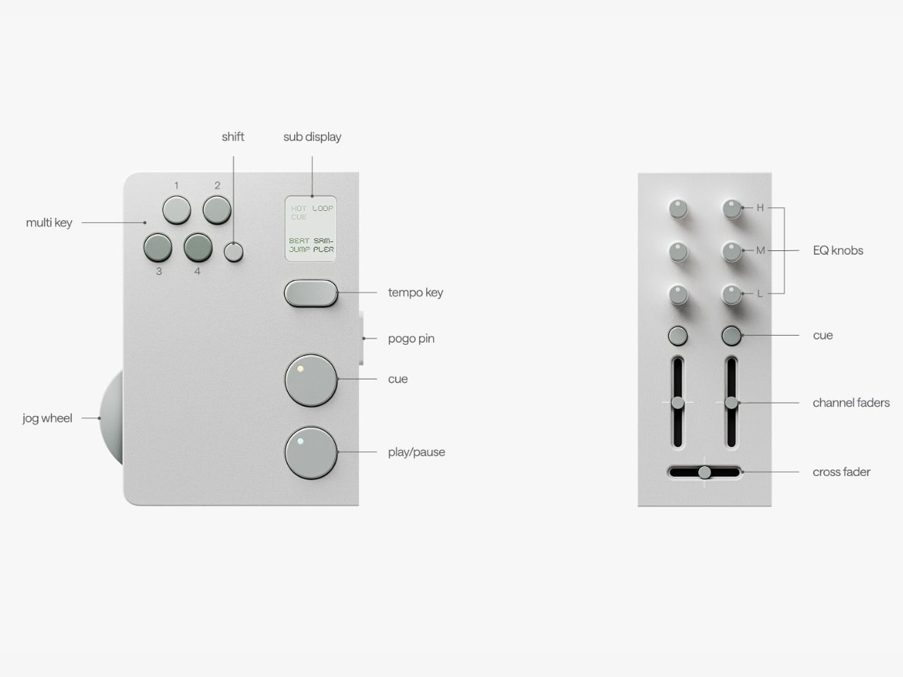 The premise is simple but kind of radical: two DJs, one device. Twin is a modular controller system made up of two mirrored player decks and a shared mixer at the center. Each player gets their own jog wheel, multi keys, sub display, tempo control, cue, play/pause, and hot cue functions. The mixer module in the middle gives both players access to EQ knobs, channel faders, and a crossfader. When connected, the whole system clicks together into one clean unit. When you want to go your separate ways, the modular sections split apart. The physical design of the hardware itself communicates the whole concept: together or apart, the choice is always yours.