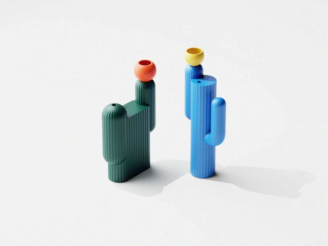 The design reads immediately as playful, but it holds up to closer inspection. The torso comes in two colors: a deep forest green and a vibrant cobalt blue. Both are rich, saturated tones that don’t feel trend-chasing. They feel considered. The rounded, ridged texture of the body mimics the natural ribbing of a real cactus without tipping into novelty gift shop territory, which is a harder balance to strike than it sounds. Too literal and it becomes a costume. Too abstract and the metaphor dissolves. Lee found the middle ground cleanly.