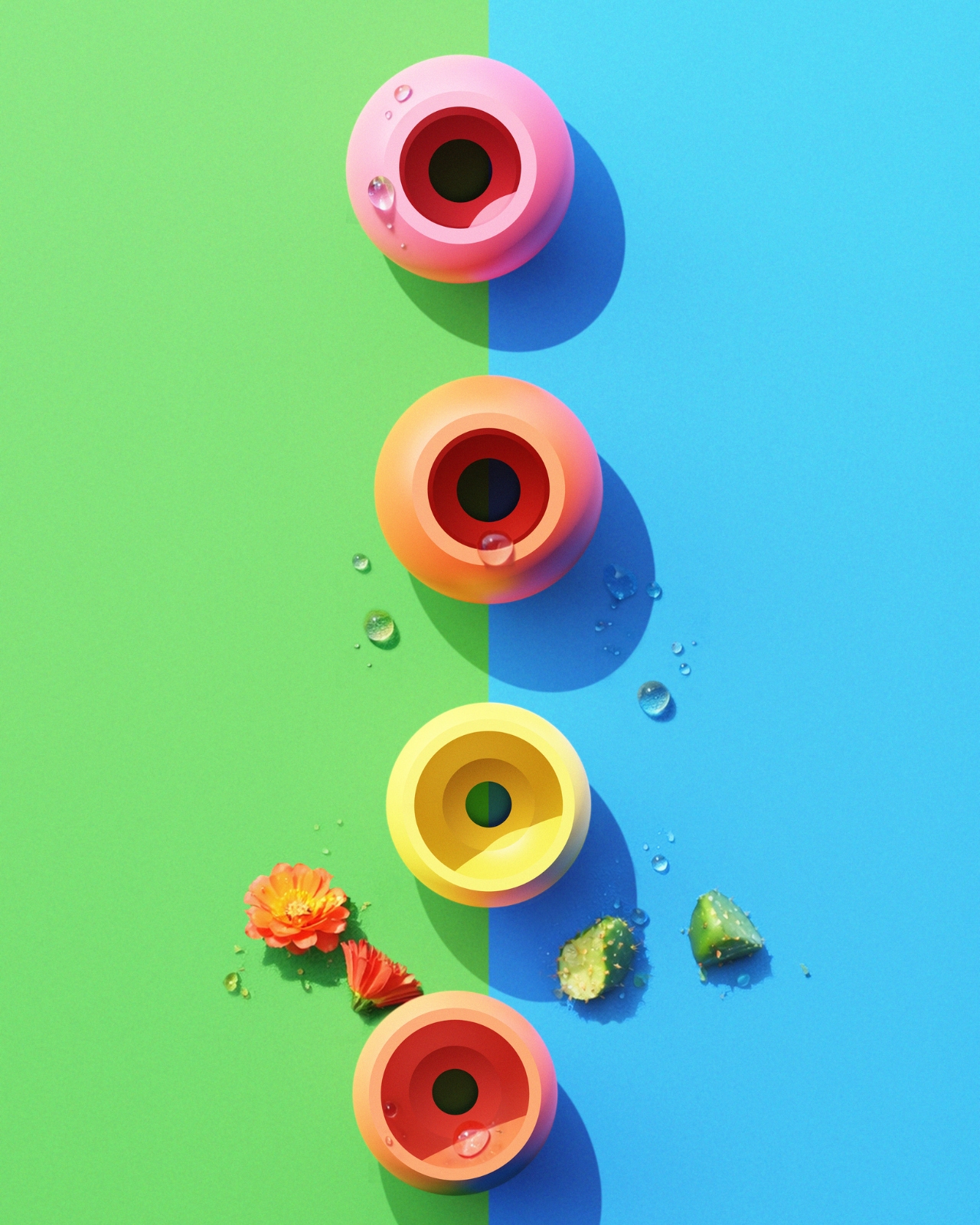 The color pairings across the concept also deserve a mention. The cobalt blue body paired with a yellow flower carries an almost graphic, retro-poster energy. The deep green with orange reads more earthy and organic, like something you’d find in the corner of a well-curated studio. The point is that neither combination feels accidental. Both read as deliberate aesthetic decisions rather than colorway options to fill out a spec sheet. That level of care signals a designer thinking about how an object coexists with a real space over time.