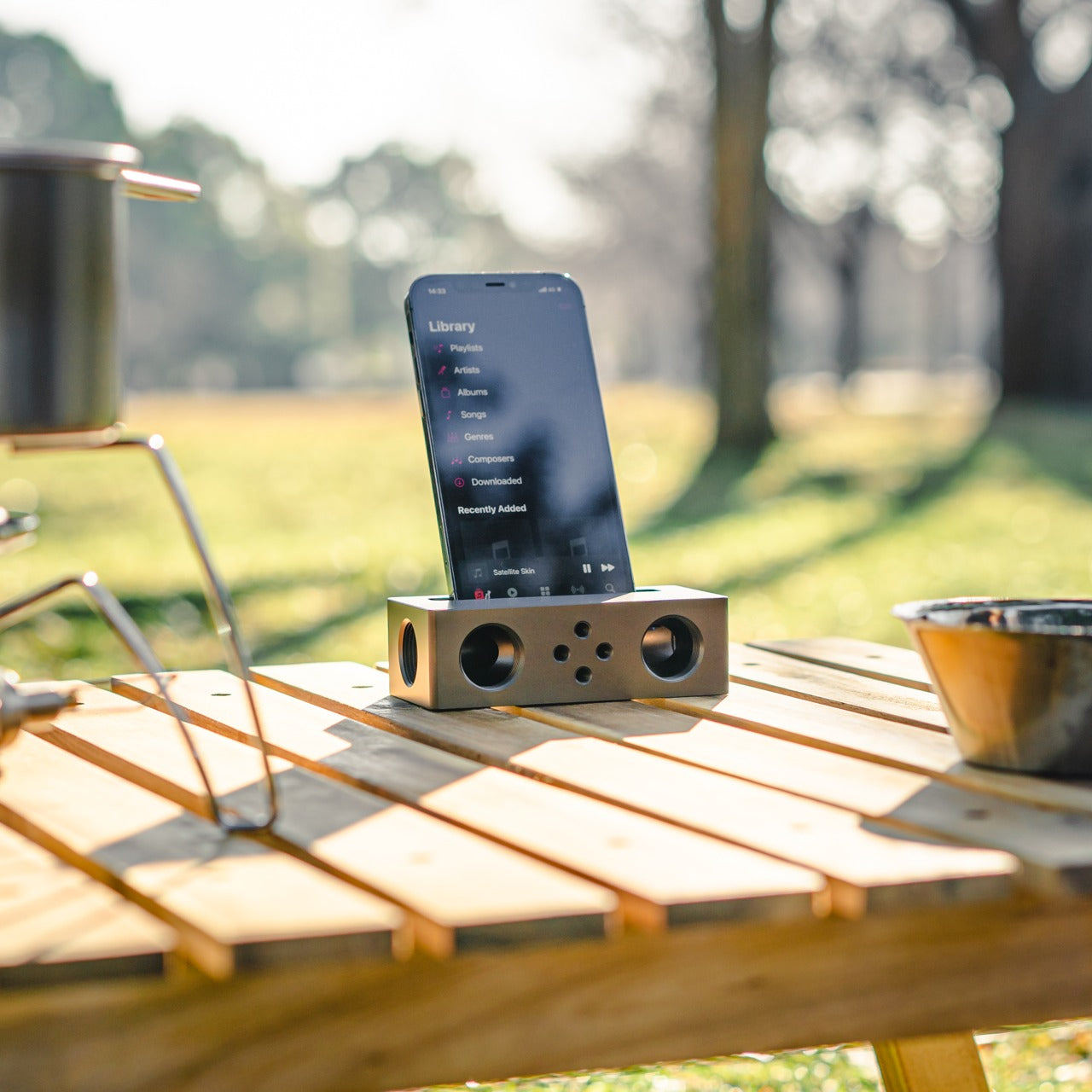 No charging reminder, no Bluetooth pairing, no firmware update mid-session. A phone in the cradle and the room shifts immediately, audio gaining presence and warmth that a phone speaker lying flat on a desk cannot approach. For study sessions running on focus music, ambient sound, or a lecture replay, the difference registers in seconds. Duralumin handles daily movement without showing wear, and because it operates entirely outside the electrical ecosystem, it performs identically in ten years as it does today.