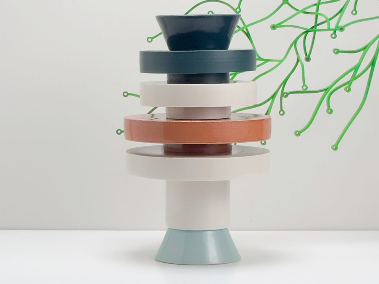 The Torre collection comes in three configurations, each featuring consistent diameters and interlocking lips for stable stacking. Wheel-thrown and spray-glazed, the modules show subtle variations that celebrate craftsmanship while maintaining a sleek, modern finish. Muted tones like off-white, sand, and stone complement diverse interiors, while the versatile design works equally well as a vessel for flowers or as a standalone sculpture.