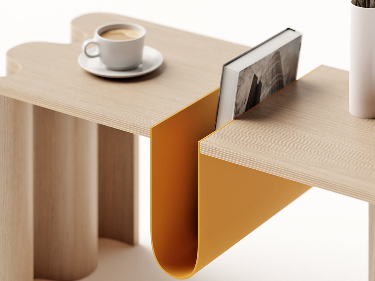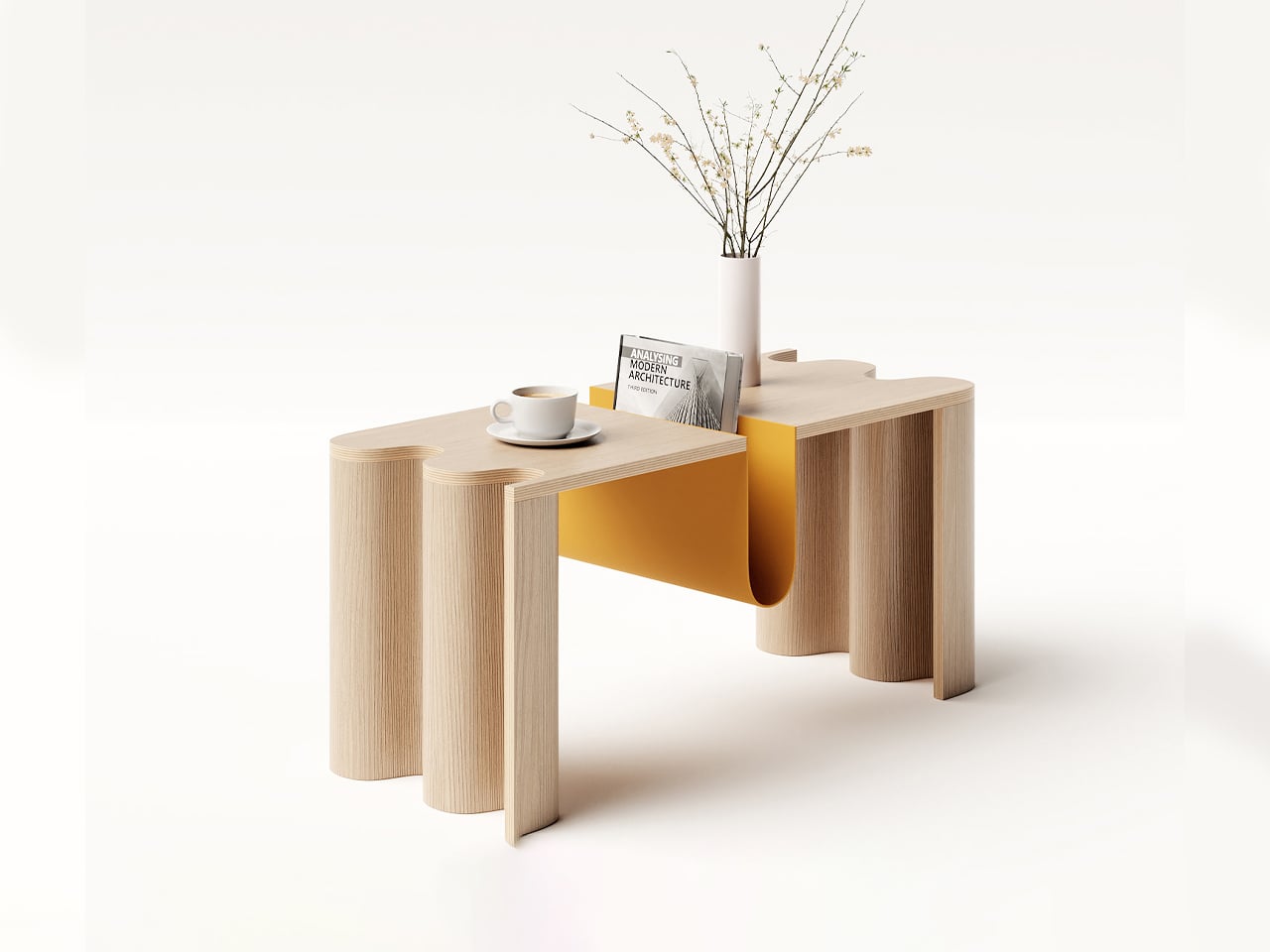 Cloth is a coffee table by João Teixeira that blends Scandinavian functionality with Japanese minimalism, capturing the Japandi spirit of calm, balance, and warmth. Designed to ground a living space without overwhelming it, the table embraces a balance of boldness and elegance from every angle. Its defining feature is a curved bookstand at the center, a sculptural element that anchors the design while leaving ample tabletop space. Subtle details, such as the softly undulating edge reminiscent of a live edge, add a sense of movement to its otherwise minimal profile.