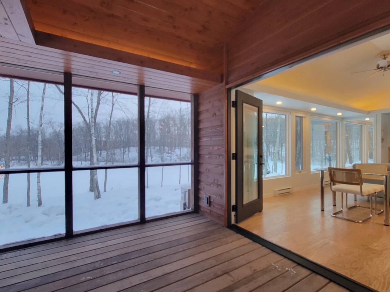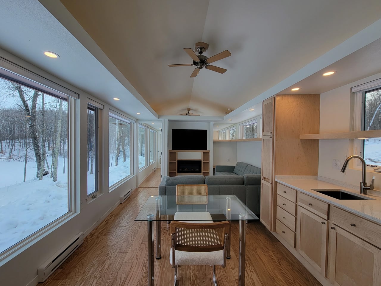 The name earns its keep on the exterior, too. The Shoreline Glass House features a light-filled interior thanks to 30 ft (9 m) of glazing running along one wall, flooding every corner of the home with natural light throughout the day. It’s a design move that blurs the line between inside and out, making the home feel anchored to its surroundings rather than sealed off from them. Entry is through a large enclosed porch, a smart buffer zone that expands the functional living area while adding that coveted semi-outdoor layer that tiny home dwellers often sacrifice first.