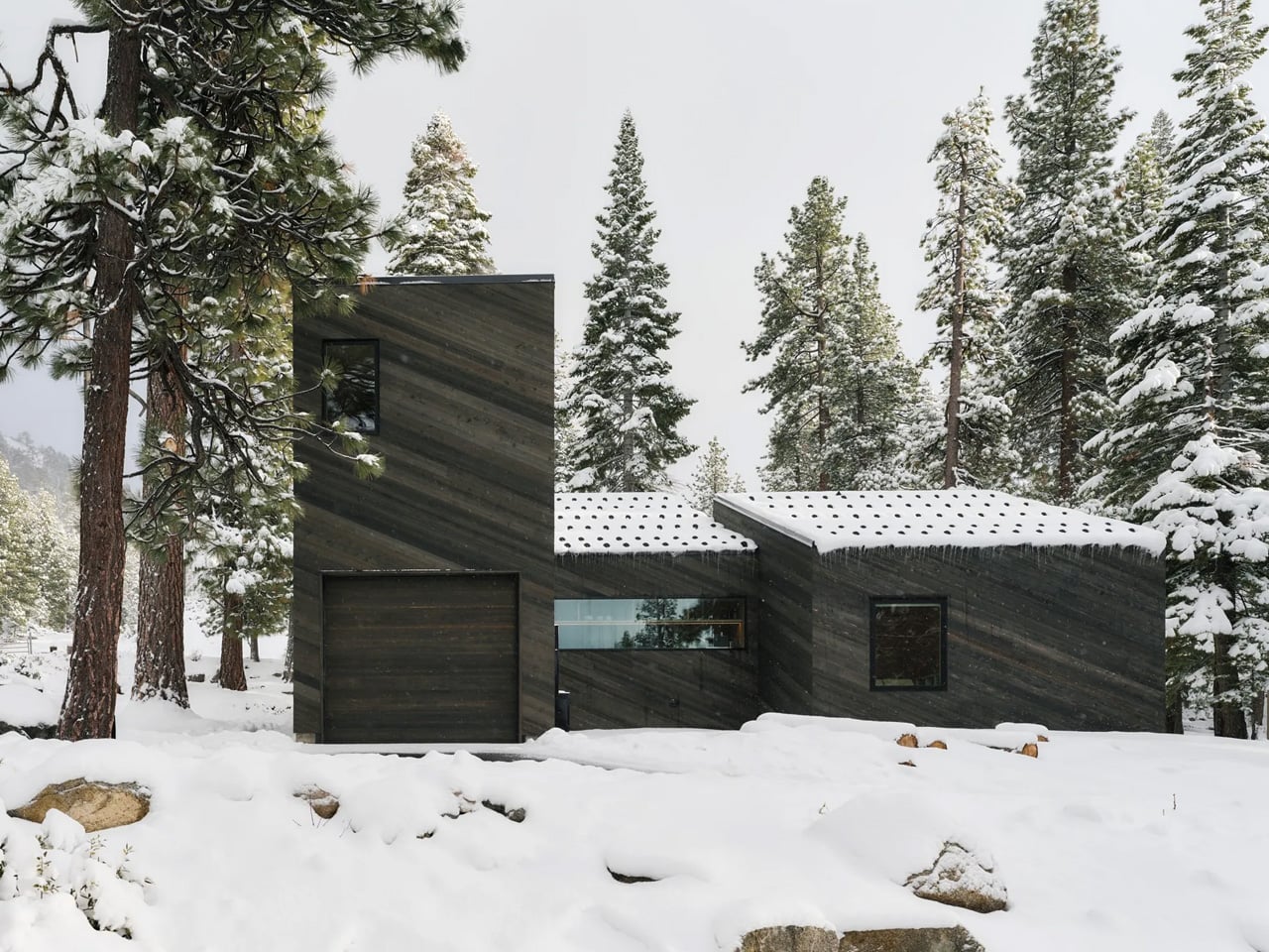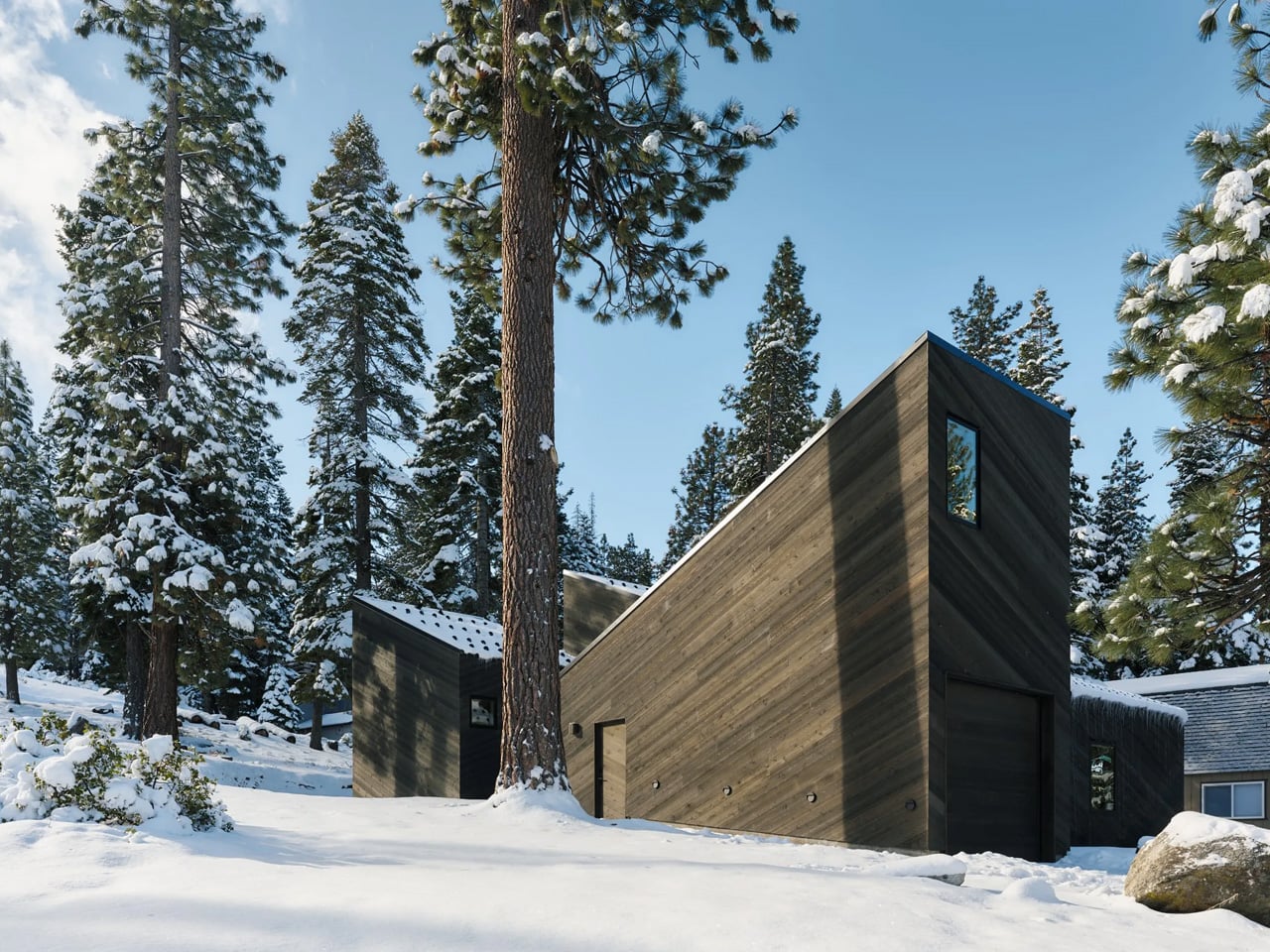 Most mountain cabins treat the landscape as a backdrop. Mork-Ulnes Architects’ Staggered Cabin treats it as a collaborator. Completed in the summer of 2024 and situated at an elevation of over 6,000 feet where South Lake Tahoe meets the foot of the Sierra Nevada, the project doesn’t fight the slope it sits on — it moves with it. Four dark-stained cedar-clad volumes shift and step down the alpine terrain, preserving existing granite boulders and Jeffrey Pines rather than displacing them, a decision that sets the entire design logic in motion from the outset.