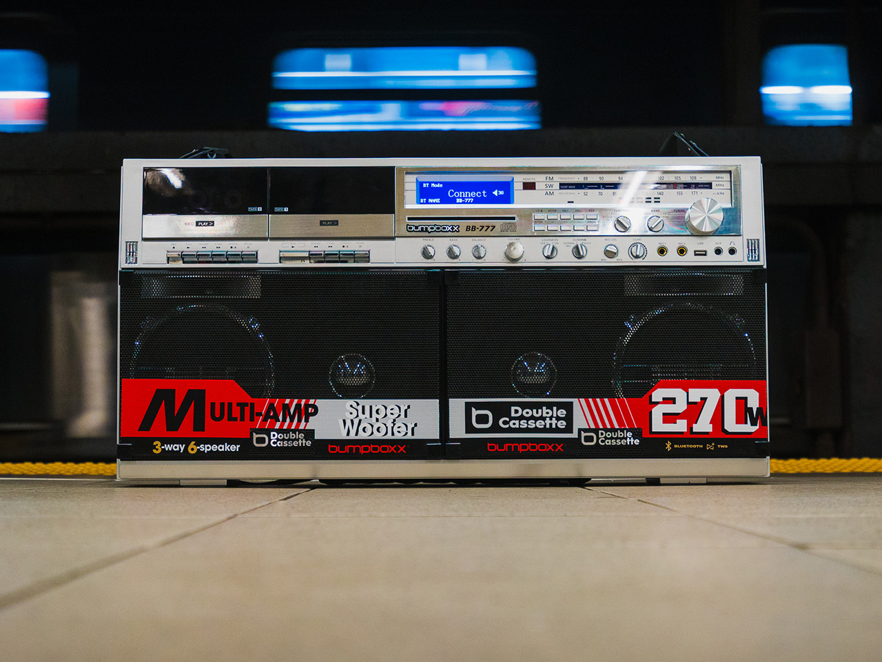 Part of what makes the BB-777 so compelling is just how much it commits to the aesthetic. The wide, horizontal body stretches 29.6 inches across, with dual cassette bays, a central control section, a long analog tuner strip, and four large drivers across the lower half. Paired with two telescoping antennas and a carry handle, the whole thing stays true to the iconic boombox design of the ’80s, built to be seen, not tucked away.