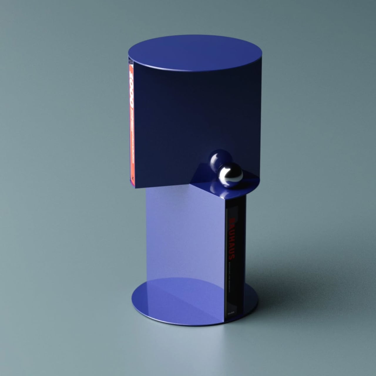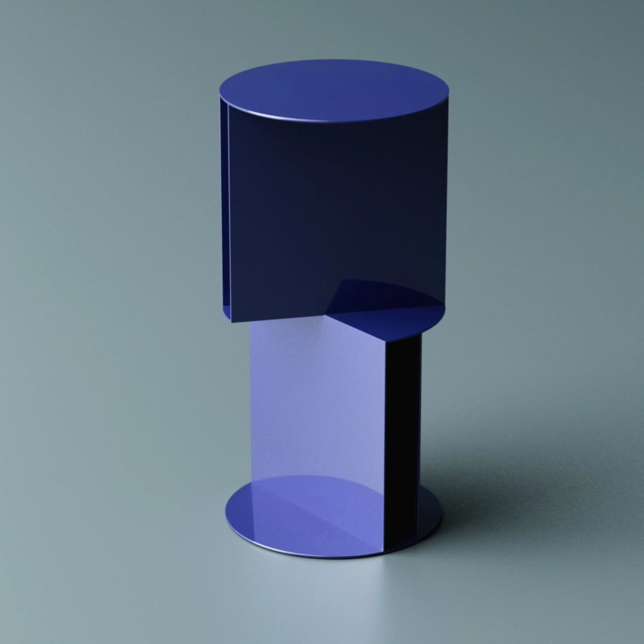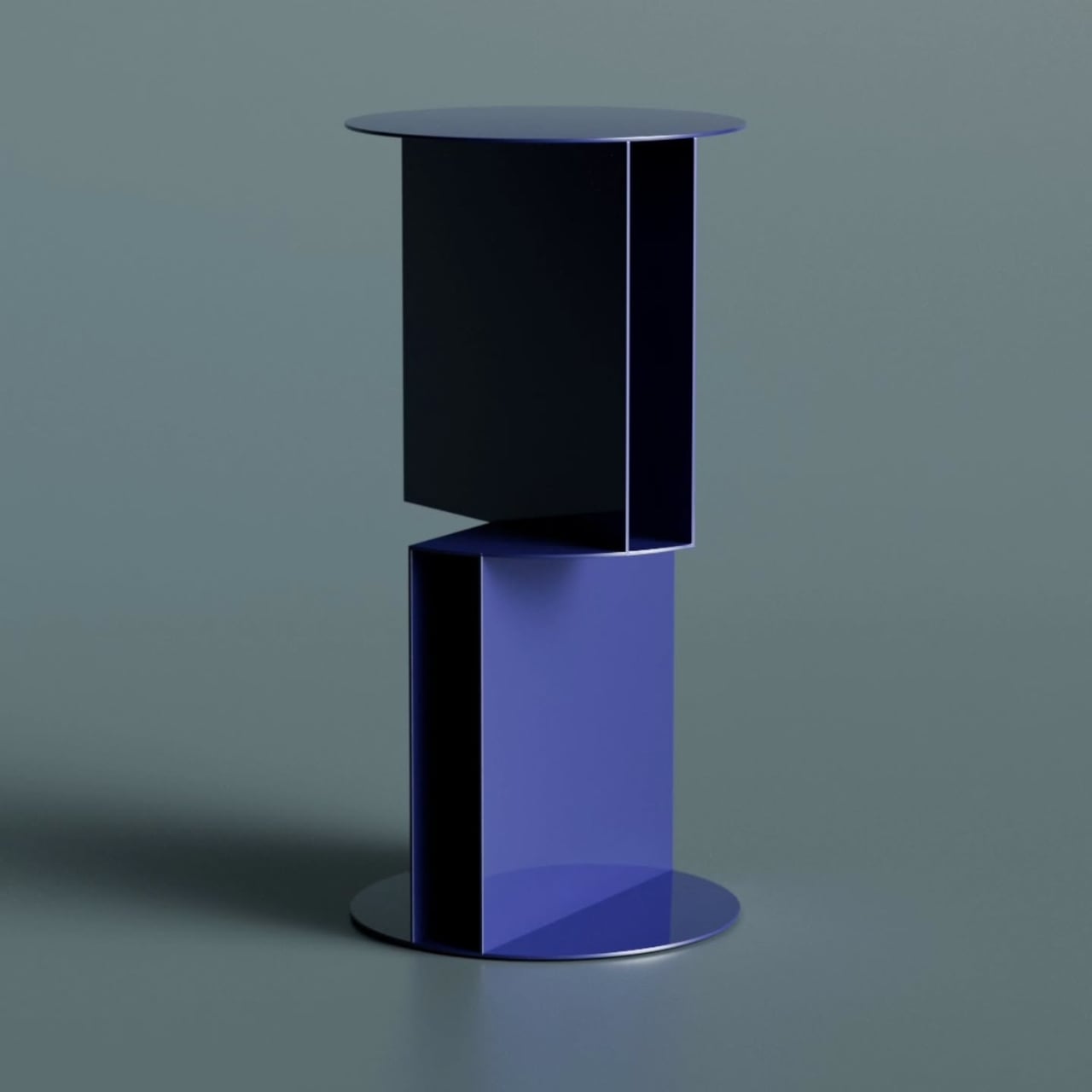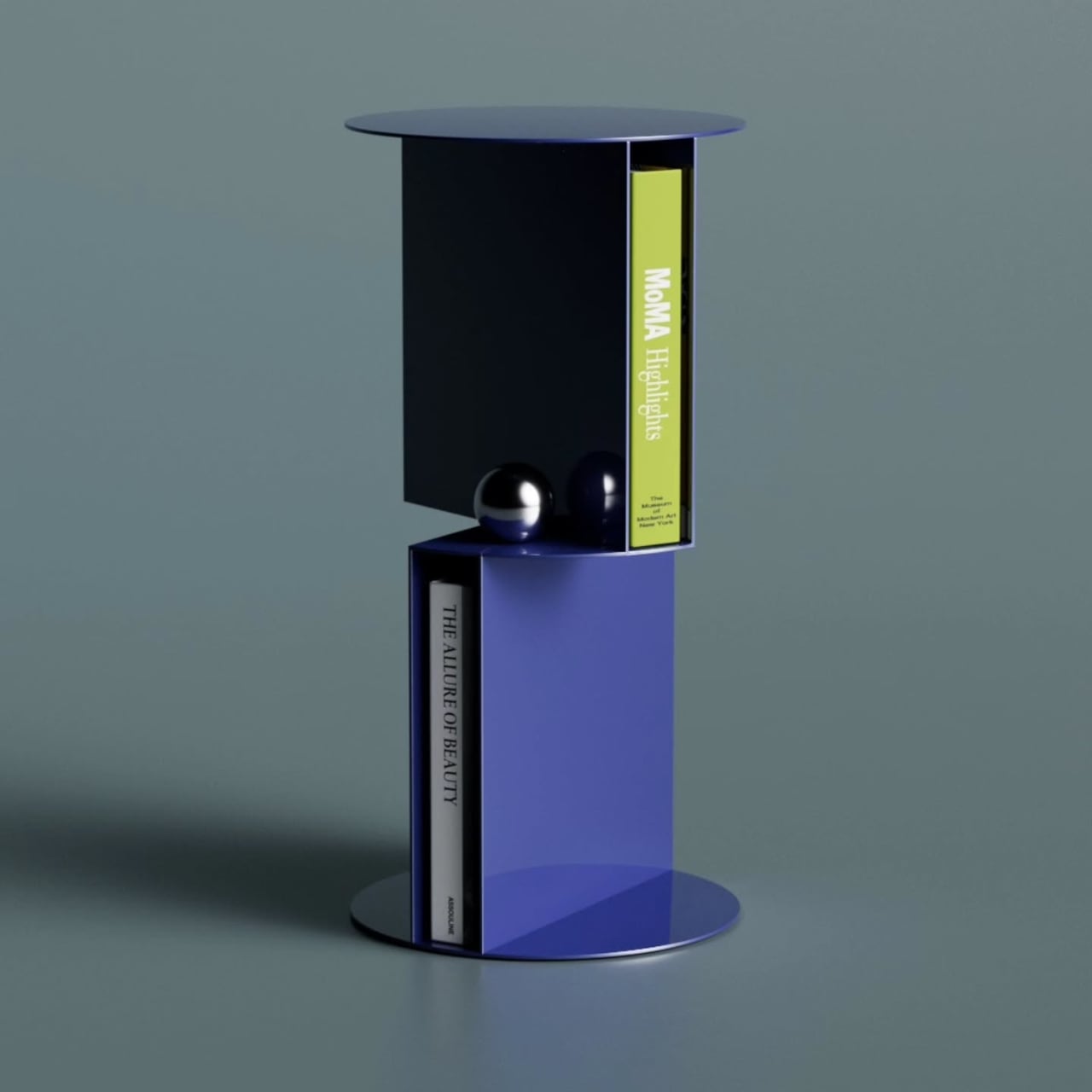 The idea of torque, that mechanical tension created by rotation, becomes the organizing principle here. Each storage unit opens in a different direction, offset against the other to create the visual friction the name implies. It makes the structure feel active, as if the table is caught mid-turn. The two-tone blue colorway reinforces that, with a dark navy upper section against a brighter blue lower.