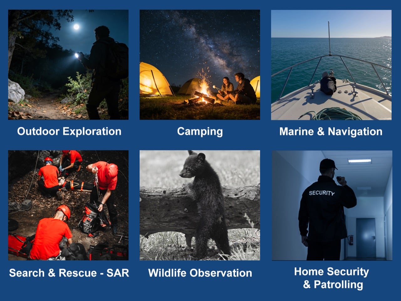 The IP67 rating means the housing can handle submersion up to one meter for 30 minutes and shrugs off dust intrusion entirely, appropriate for marine navigation, wet-weather SAR work, or any scenario where gear gets exposed to the elements without warning. The operating temperature range (negative 20 to positive 50 degrees Celsius) covers everything from winter mountain rescue to desert surveillance in summer heat. The form factor is binocular-style rather than monocular, which distributes weight across both hands and allows for more stable long-duration observation compared to single-eye devices that fatigue your grip and throw off your natural field of view balance.