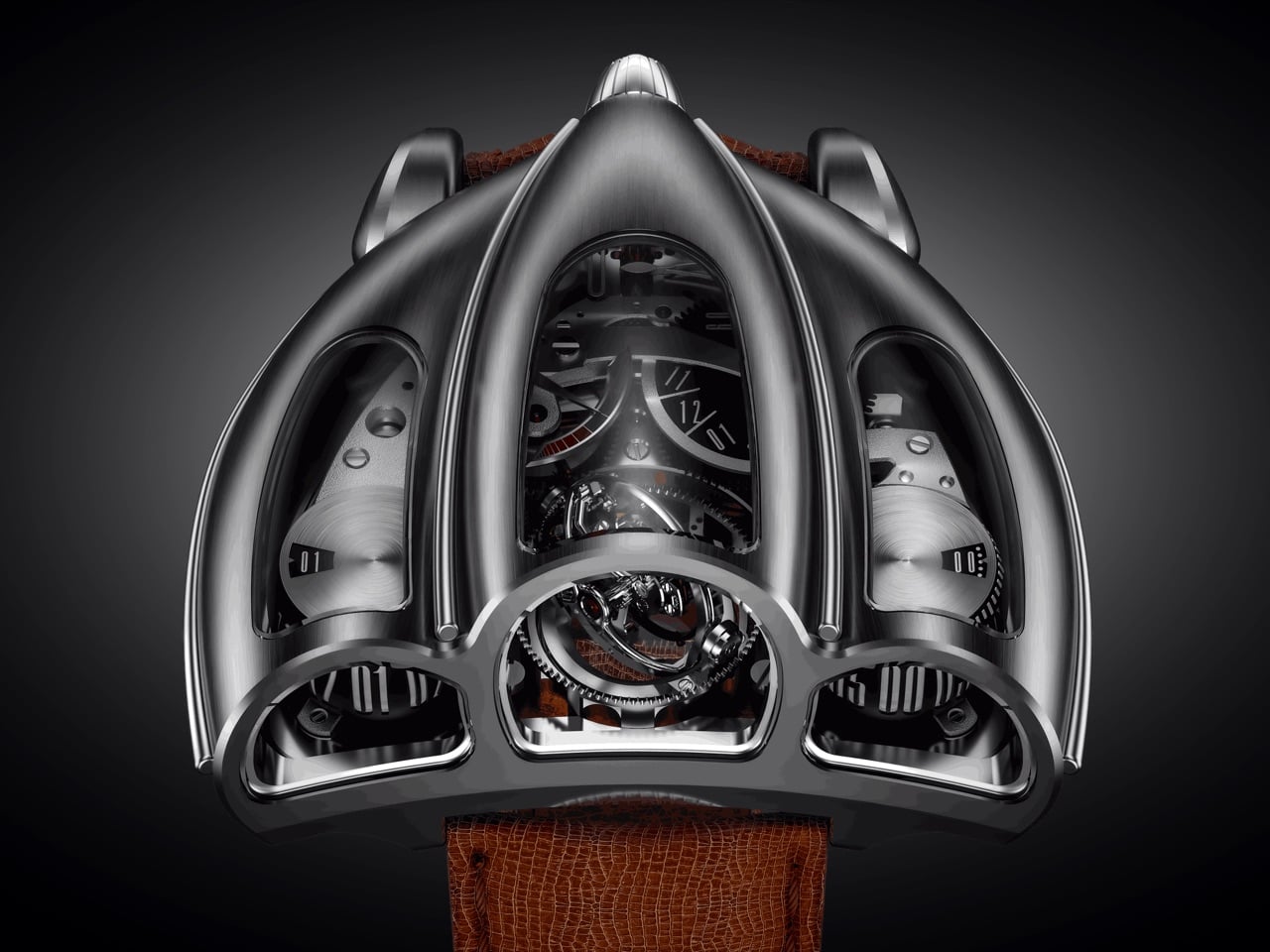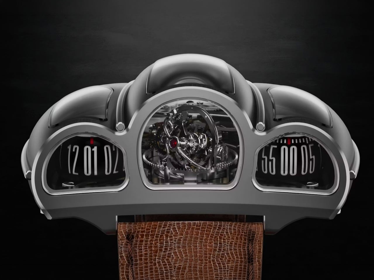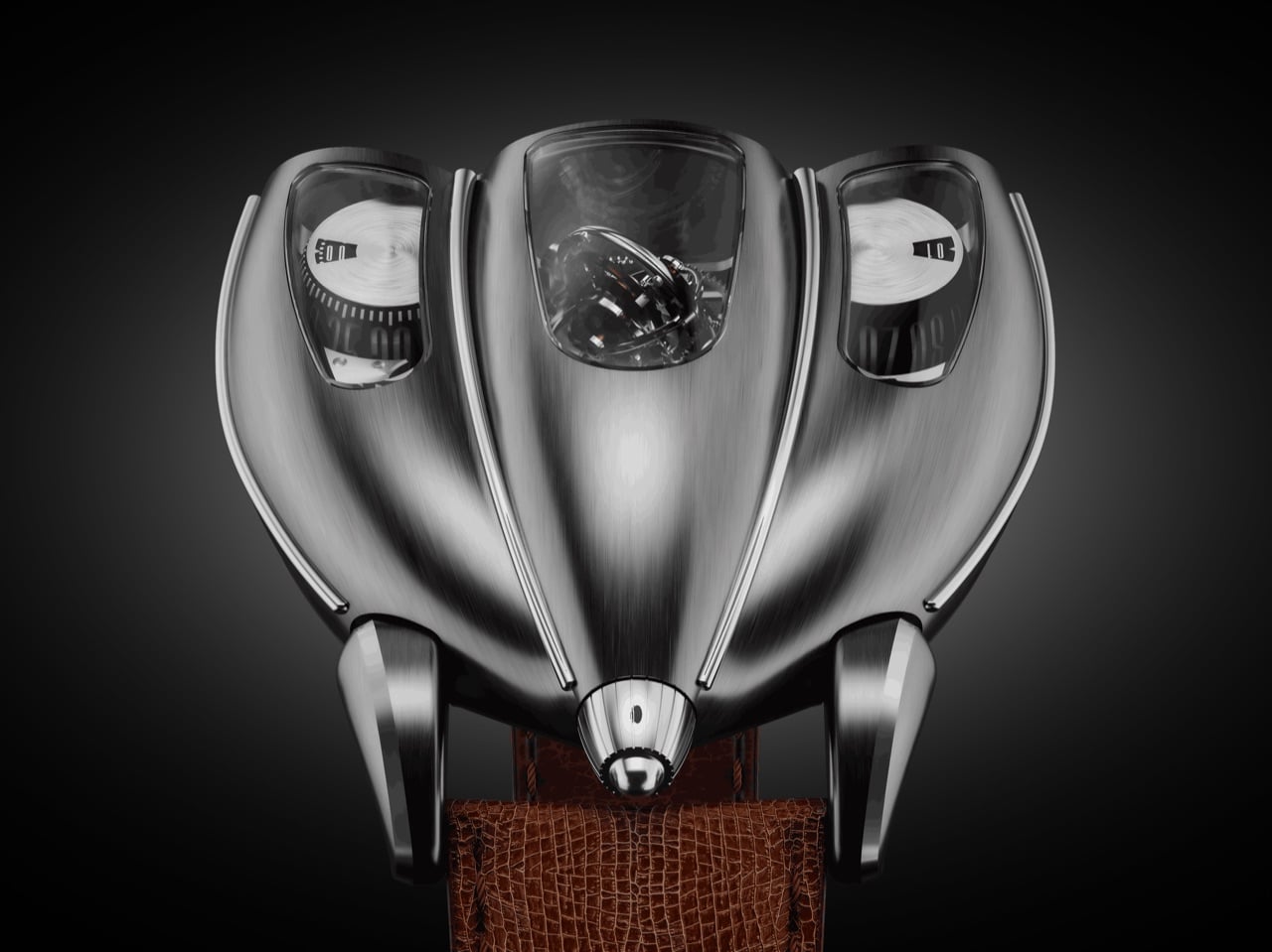 The case construction follows Italian coachbuilding philosophy, where form and function develop together rather than in sequence. Coppoletta designed the case around the movement’s architecture, letting the mechanical volumes dictate the external silhouette. The teardrop shape references 1920s and 1930s aerodynamics, when wind tunnel testing was still a decade away and designers shaped metal based on intuition about airflow. Flowing surfaces connect the cylindrical time displays, each one sitting under domed sapphire crystal that distorts and magnifies depending on viewing angle. The brushed metal finish catches light the way a hand-formed fender does, with subtle variations in surface texture that reveal the construction process. Sculpted lugs integrate directly into the case body without visible seams, continuing the coachbuilt language where every panel flows into the next.
