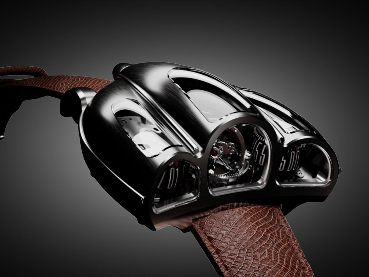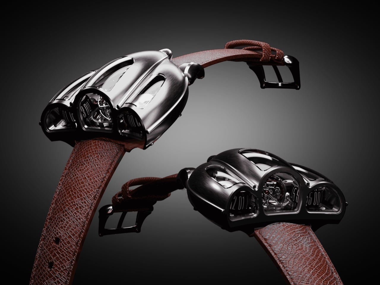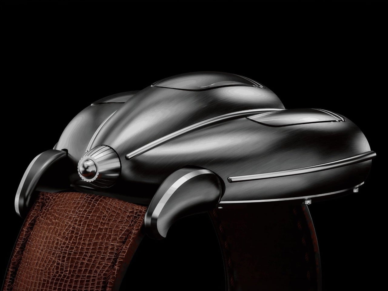 The case construction follows Italian coachbuilding philosophy, where form and function develop together rather than in sequence. Coppoletta designed the case around the movement’s architecture, letting the mechanical volumes dictate the external silhouette. The teardrop shape references 1920s and 1930s aerodynamics, when wind tunnel testing was still a decade away and designers shaped metal based on intuition about airflow. Flowing surfaces connect the cylindrical time displays, each one sitting under domed sapphire crystal that distorts and magnifies depending on viewing angle. The brushed metal finish catches light the way a hand-formed fender does, with subtle variations in surface texture that reveal the construction process. Sculpted lugs integrate directly into the case body without visible seams, continuing the coachbuilt language where every panel flows into the next.
