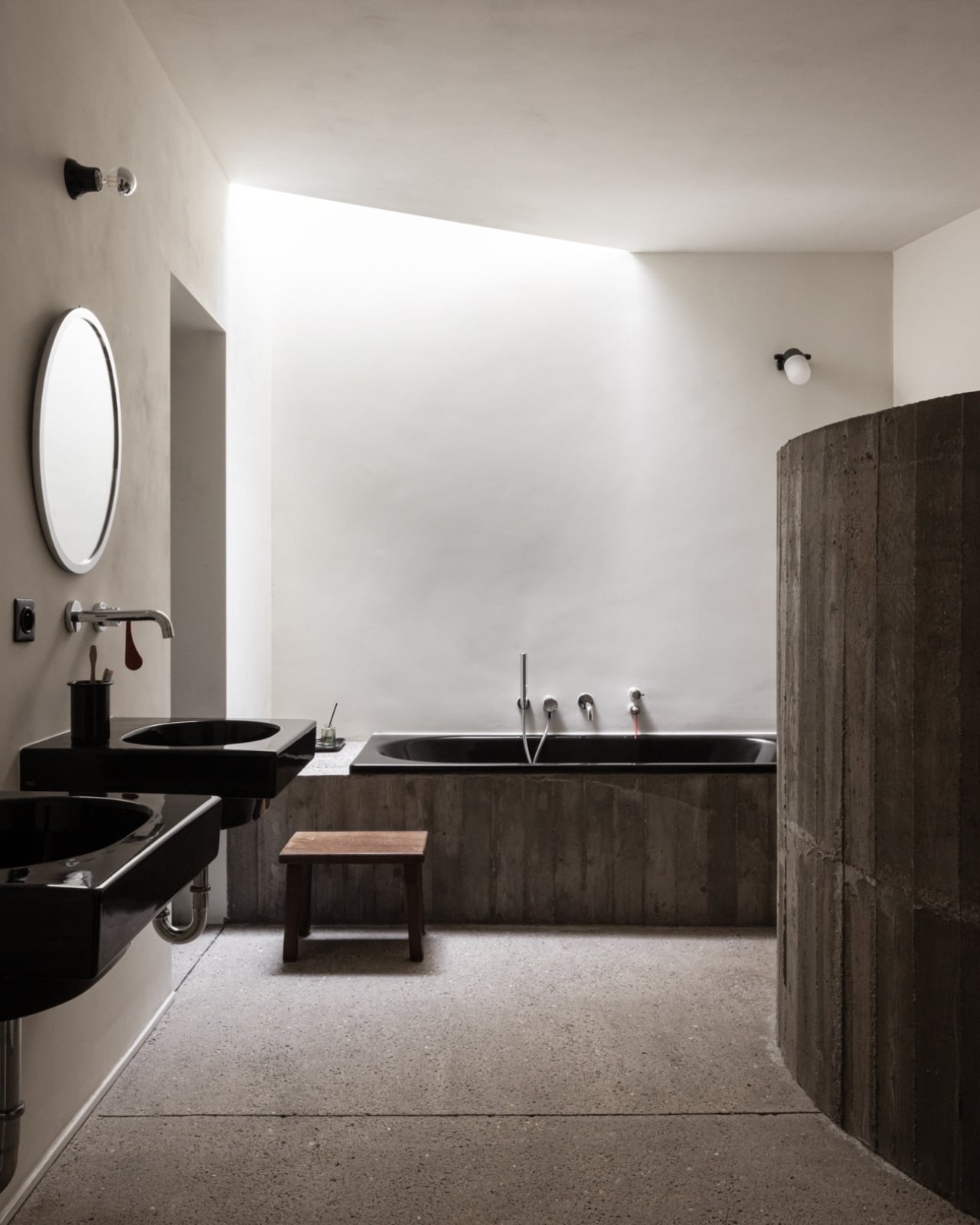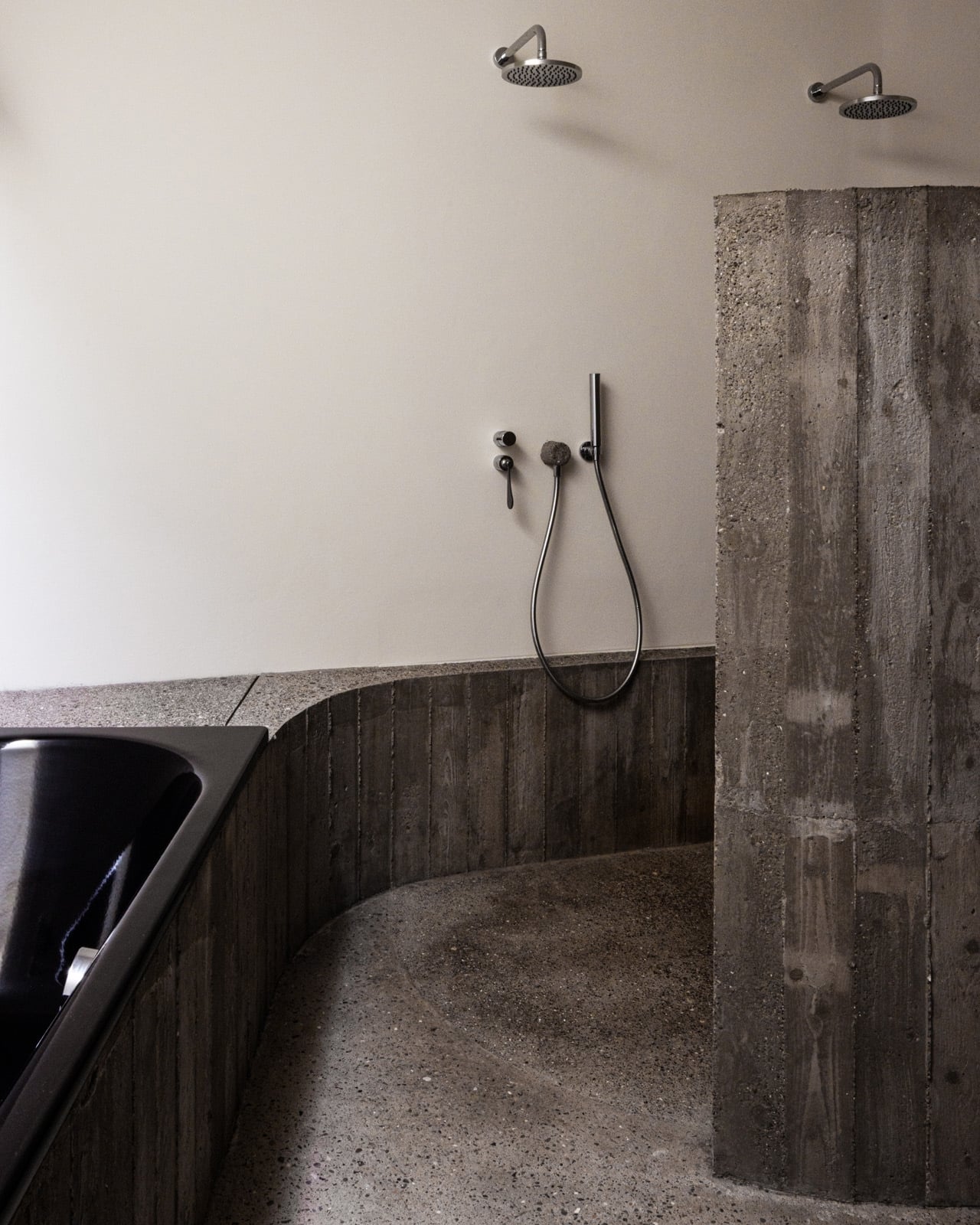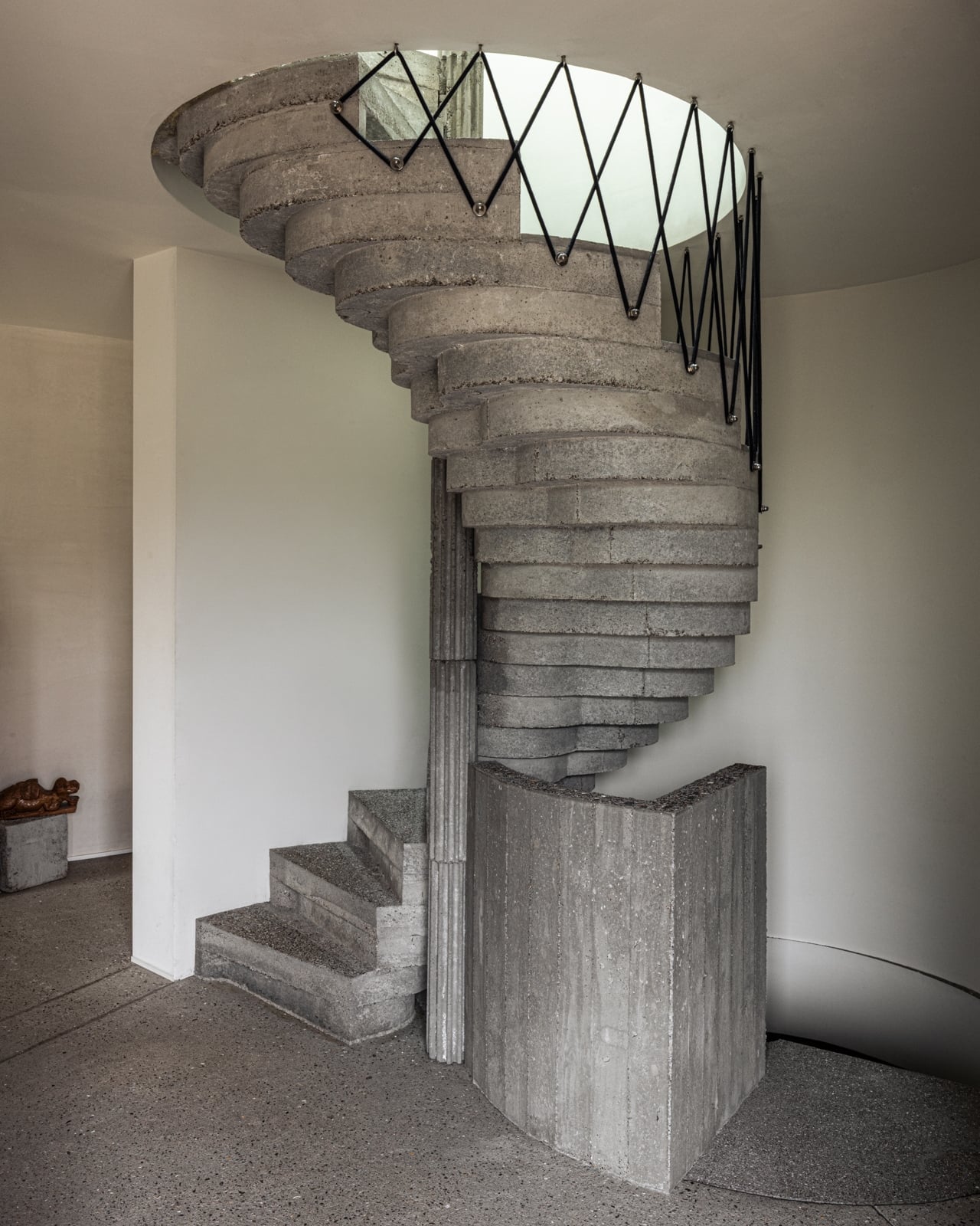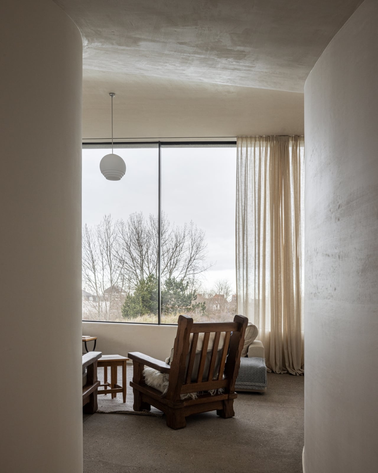 The way you move through the house is where Munters’ admiration for Le Corbusier becomes most legible. She’s spoken about his influence, specifically in “the rooftop solarium, in the way spaces expand and contract, and in the vertical shafts that structure movement through the house.” You enter through a vertical shaft that climbs toward the roof before expanding into the main living space. The compression-then-release is theatrical in the best sense. The house is working on your nervous system before you’ve even sat down.