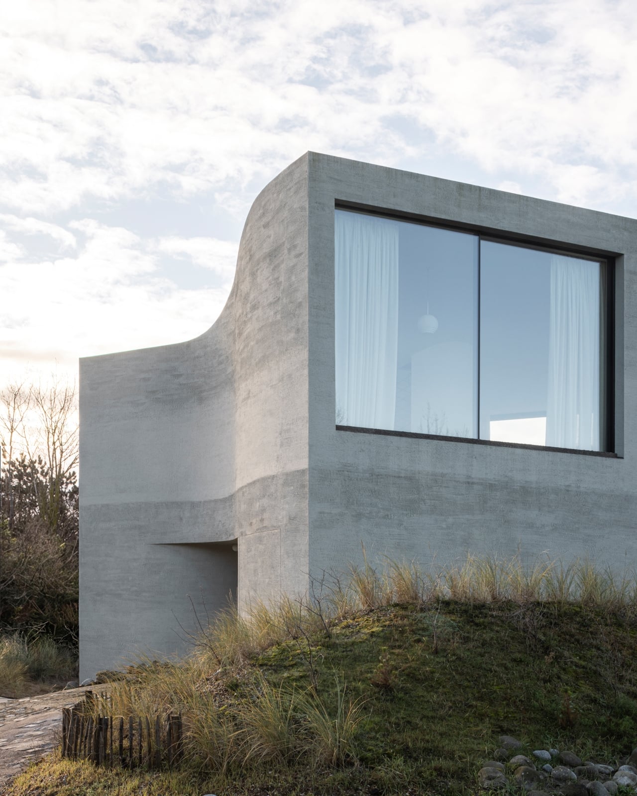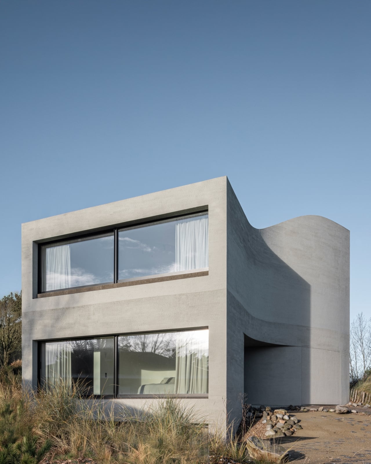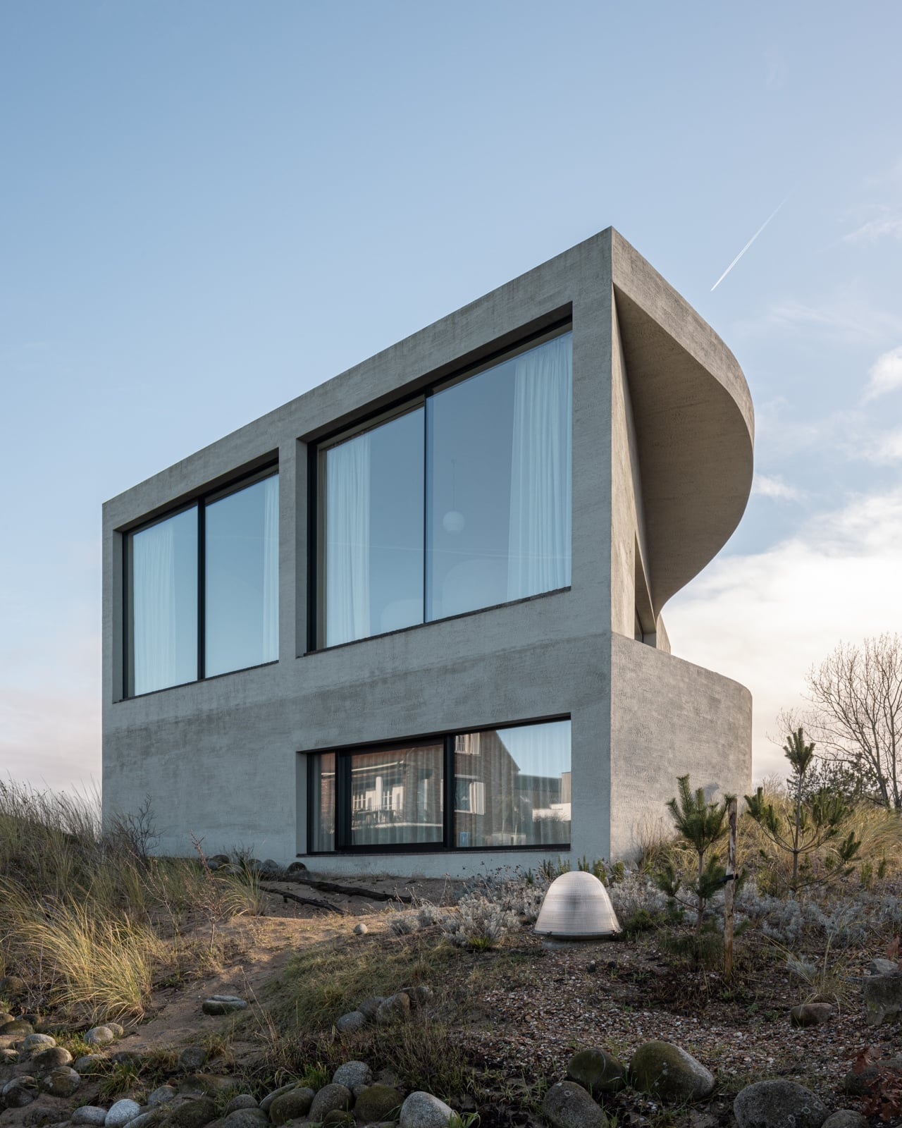 The concrete form is completely curved across the entire volume, not just as a surface treatment but as a governing logic, carried through every detail: the absent roof edges, the curved garage opening, even the way the house integrates into the ground. The bedrooms are half-buried in the dunes, which is both a functional and a conceptual move. The house doesn’t sit on the landscape. It’s anchored into it. Above those buried rooms, the living spaces rise toward the horizon, pulling in light and opening out to views of the dunes in a way that feels earned rather than forced.