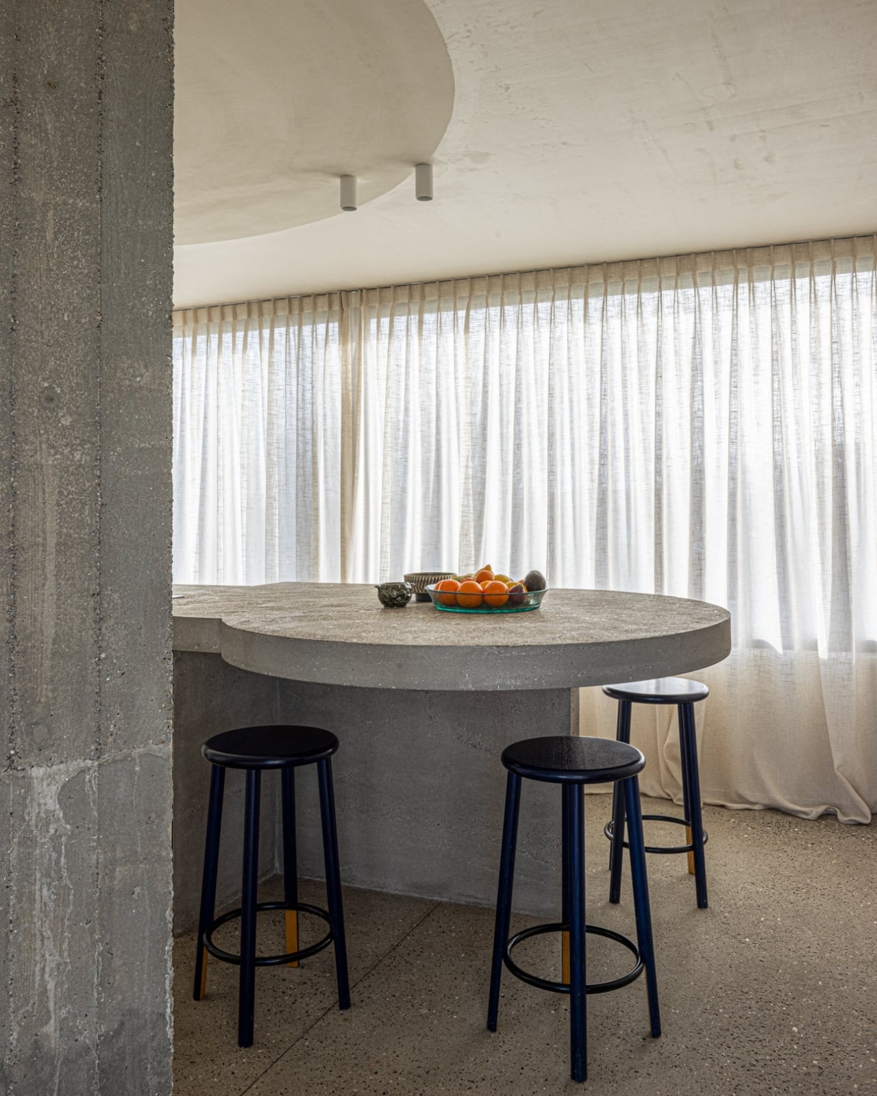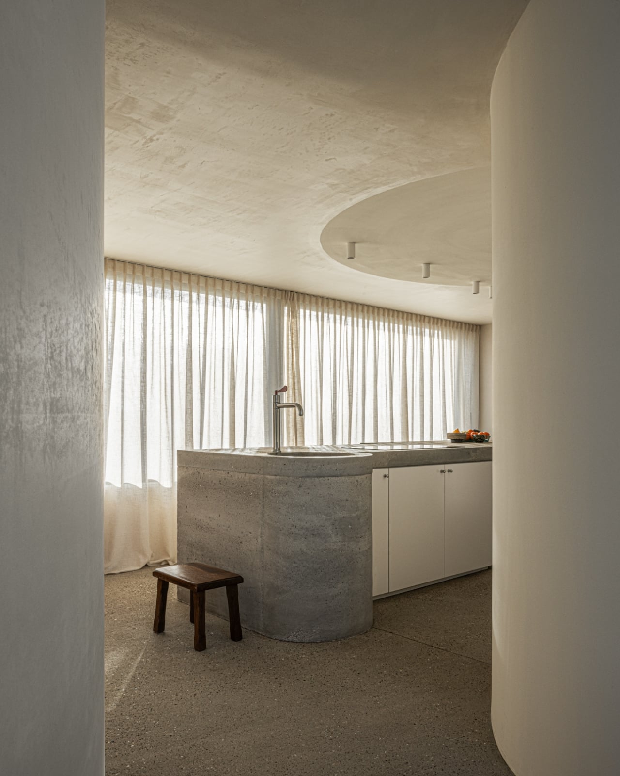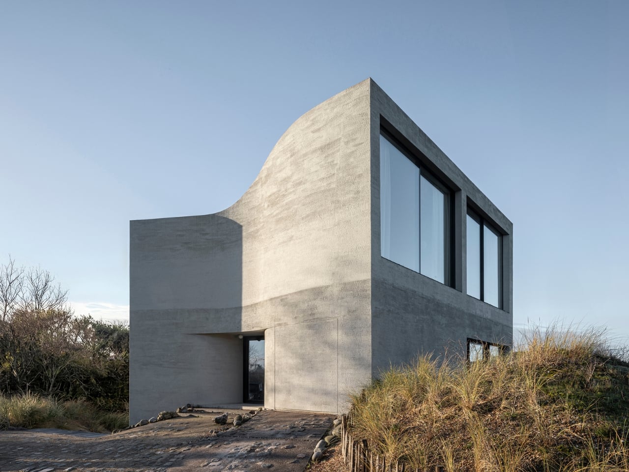 The concrete form is completely curved across the entire volume, not just as a surface treatment but as a governing logic, carried through every detail: the absent roof edges, the curved garage opening, even the way the house integrates into the ground. The bedrooms are half-buried in the dunes, which is both a functional and a conceptual move. The house doesn’t sit on the landscape. It’s anchored into it. Above those buried rooms, the living spaces rise toward the horizon, pulling in light and opening out to views of the dunes in a way that feels earned rather than forced.