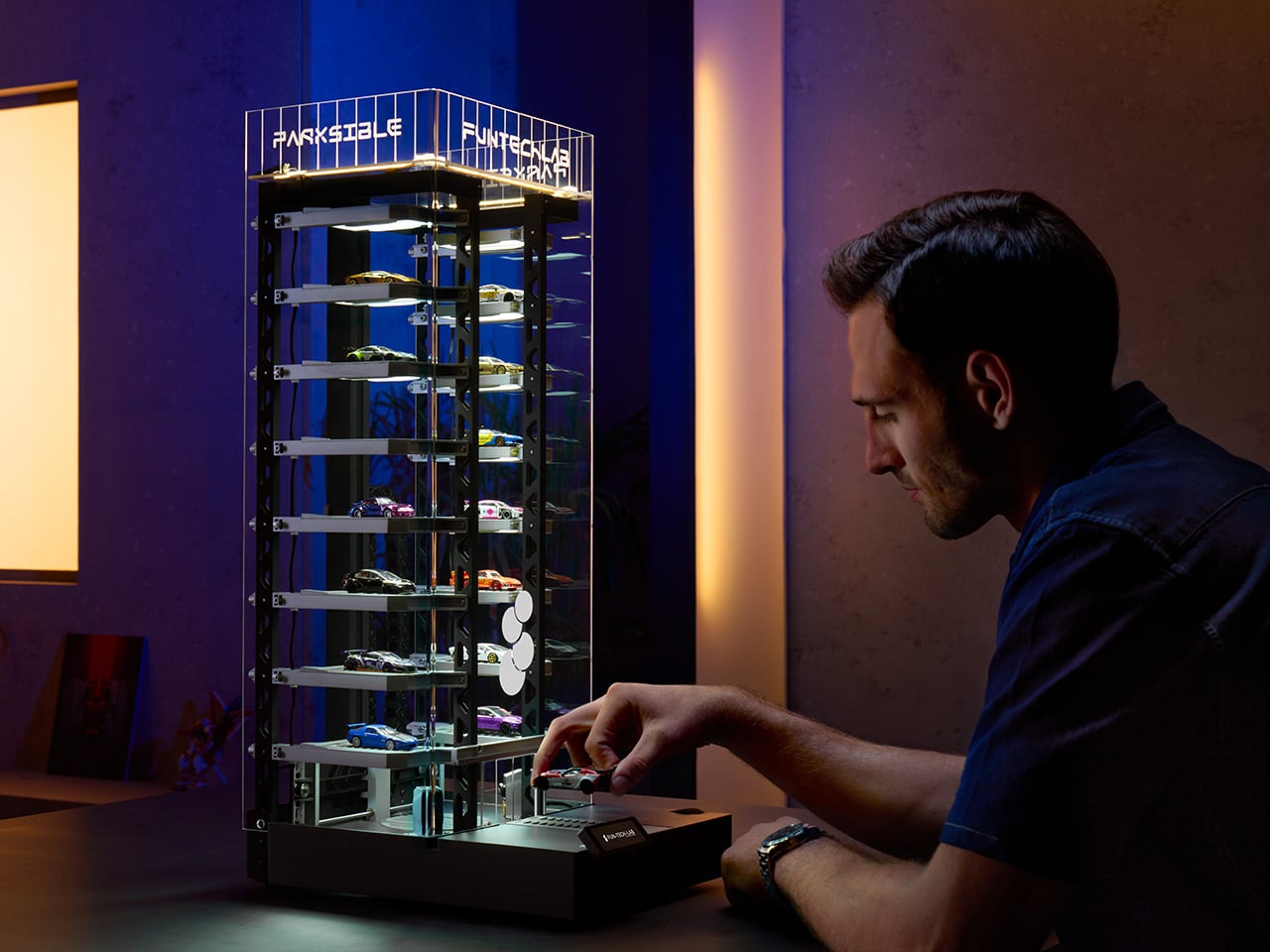 Fun-Tech-Lab, a Hong Kong-based team that already reached over 300 million impressions through its earlier desktop products Windsible and Runsible, is taking a proper engineering swing at that problem with Parksible. The unit holds 14 cars across motorized trays, handles loading and retrieval automatically, monitors temperature and humidity around the clock, and syncs to a companion app for remote control and full collection management. The PRO version adds a built-in camera that scans each model on arrival and builds a digital inventory with 360-degree views inside the app.