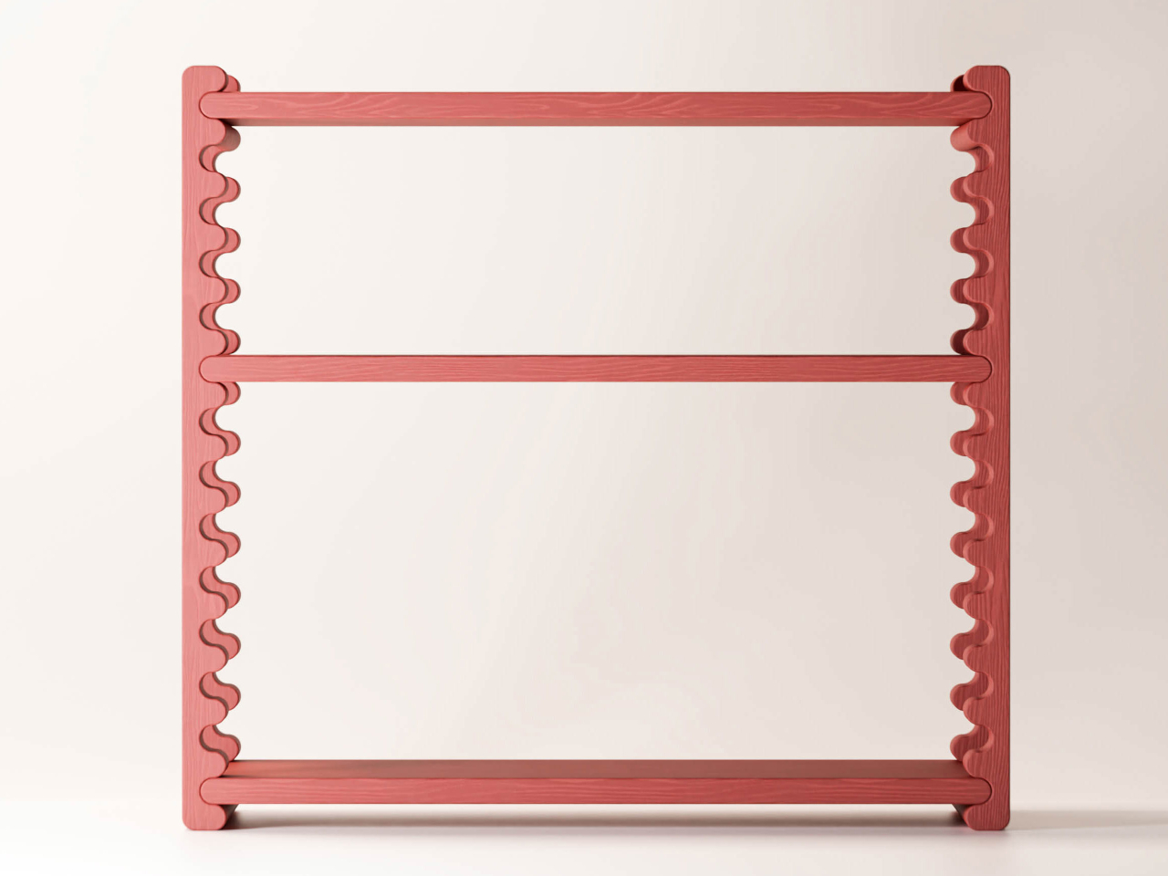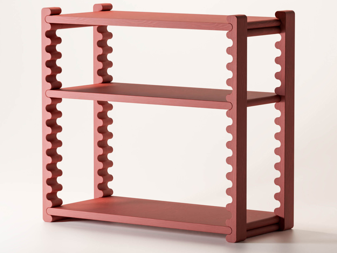 The Ripple Shelf from Sarajevo-based Dilema Studio takes a different approach, one where the shelf’s most visually distinctive element is also its adjustment mechanism. The vertical supports on each side run the full height of the frame in an undulating rippled profile. Those waves aren’t decorative flourishes; they’re guides. The middle shelves slot into them and can be repositioned to different heights without any tools or additional hardware.