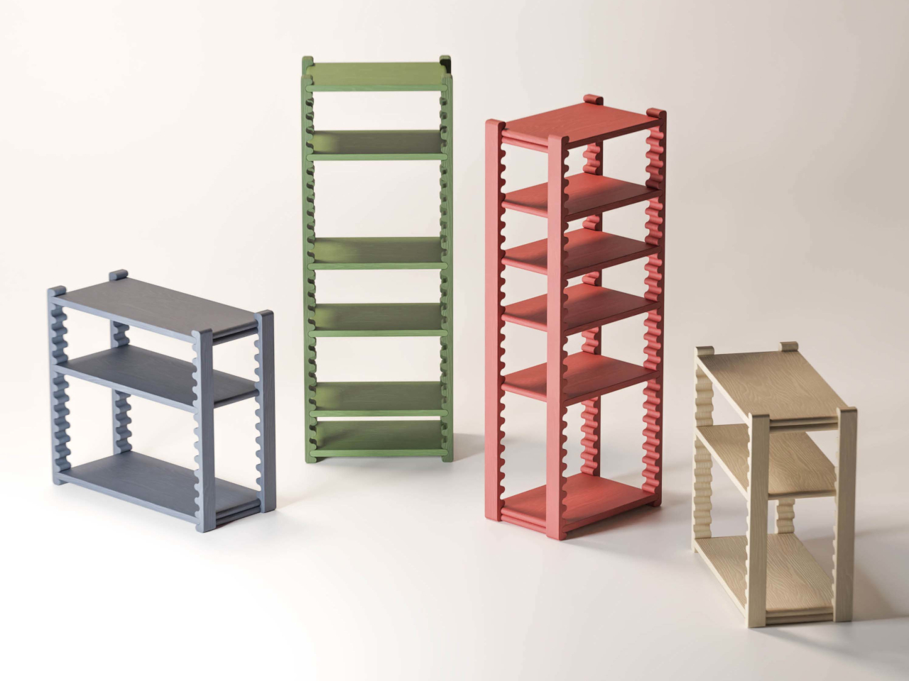 The system shows up in multiple size configurations, from compact low units to taller multi-shelf towers, giving it range across different rooms and storage needs. That versatility suits living rooms particularly well, where displaying and organizing things often need to share the same piece of furniture. A shelf for ceramics, a lower one for books, a bottom slot for a basket; the spacing adjusts to whatever the situation asks for.