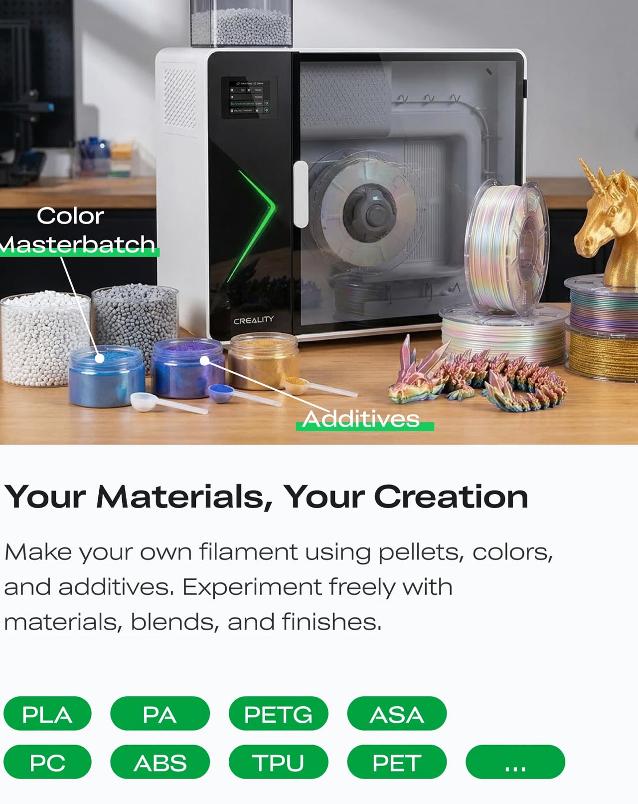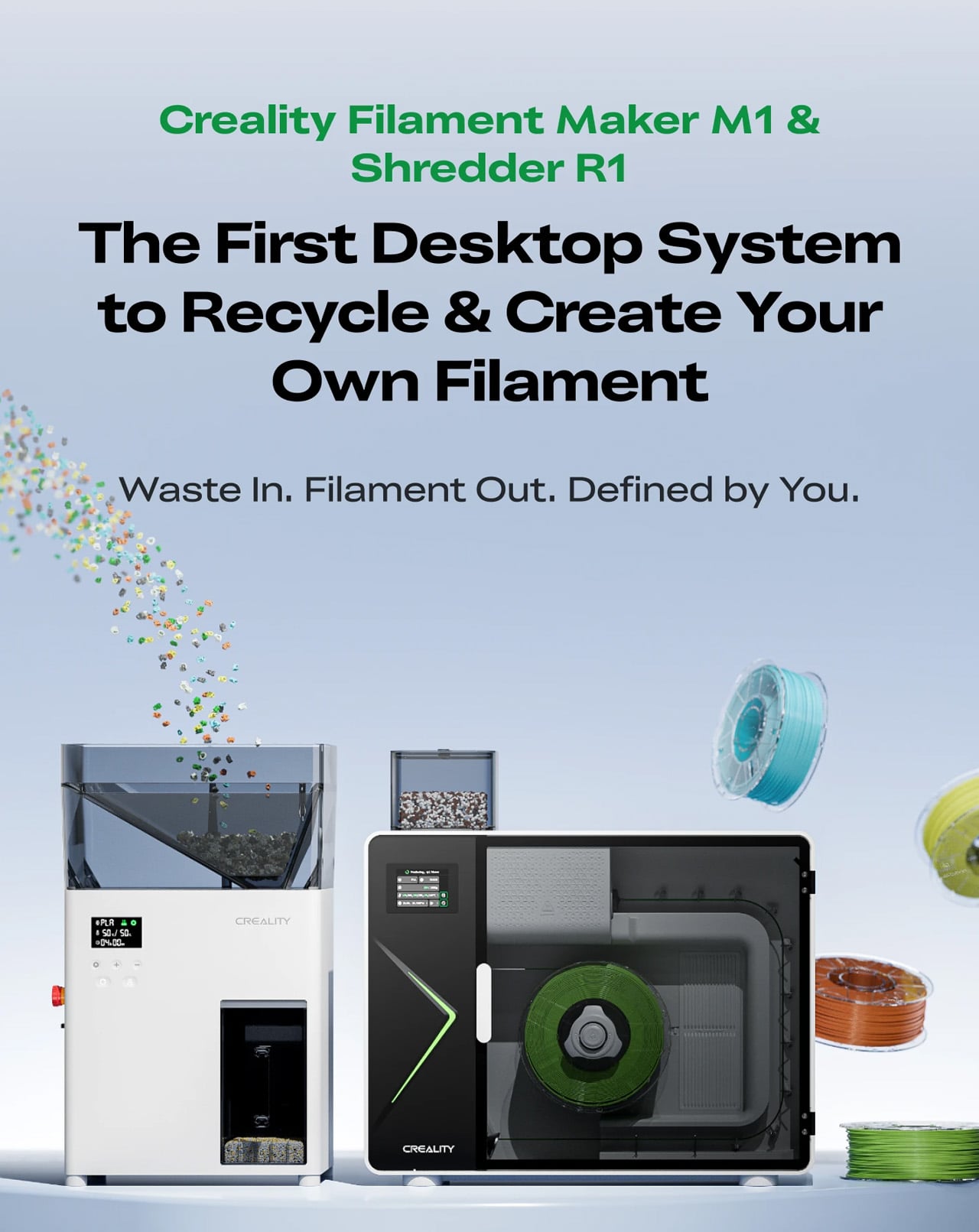 The Creality Filament Maker M1 and Shredder R1 sit at the end of the design pipeline and change what the end of the pipeline actually means. The R1 takes failed prints, support structures, and material scraps and breaks them down into reusable fragments. The M1 then takes those fragments or fresh virgin pellets and extrudes them into new filament with precise temperature control, stable extrusion performance, and a consistent diameter output. Every part of this happens on a single desktop system, without sending material waste anywhere else. The loop closes on the desk, which is where design has always worked best.
