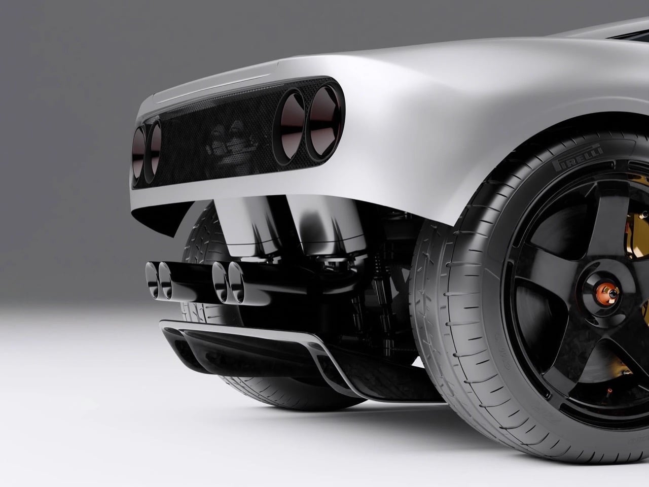 Andersson began with the monocoque, the structural skeleton that defines a car’s fundamental character. His design uses an exposed carbon fiber tub that references contemporary Formula 1 construction, with integrated mounting points for pushrod suspension components visible in the cutaway renders. The suspension itself draws directly from modern F1 technology, using inboard-mounted dampers and pullrod geometry at the front, pushrod at the rear. Gold-anodized brake calipers grip carbon-ceramic rotors, a functional nod to the original F1’s gold-lined engine bay. The exhaust system, rendered in titanium with a purple-blue heat patina, exits through centrally mounted tips that echo the original car’s triple-pipe signature.