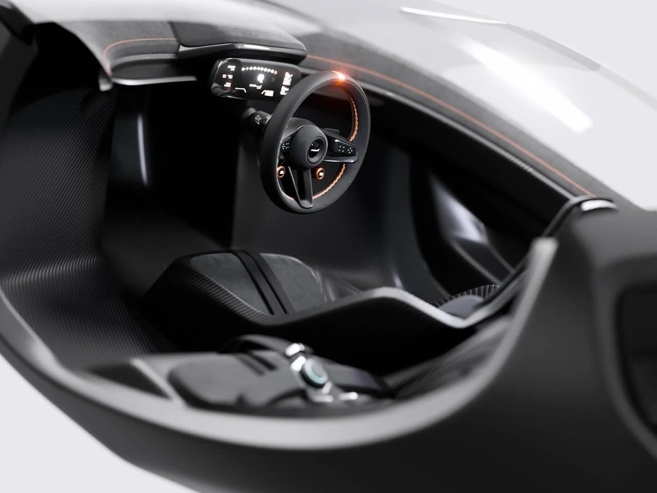 Inside, the central driving position remains sacred. Andersson designed a minimalist cockpit wrapped entirely in carbon fiber, with two flanking passenger seats positioned slightly rearward in the classic McLaren F1 three-seat configuration. The steering wheel is a flat-bottomed carbon unit with integrated controls and orange anodized paddle shifters. The instrument cluster is a single curved digital display that spans the width of the dash, showing speed, revs, and telemetry data with the clarity of a modern race car. Orange contrast stitching runs throughout the black leather trim, providing visual warmth without compromising the cockpit’s focused, technical atmosphere. The six-point harnesses are mounted directly to the carbon tub, reinforcing the competition intent.