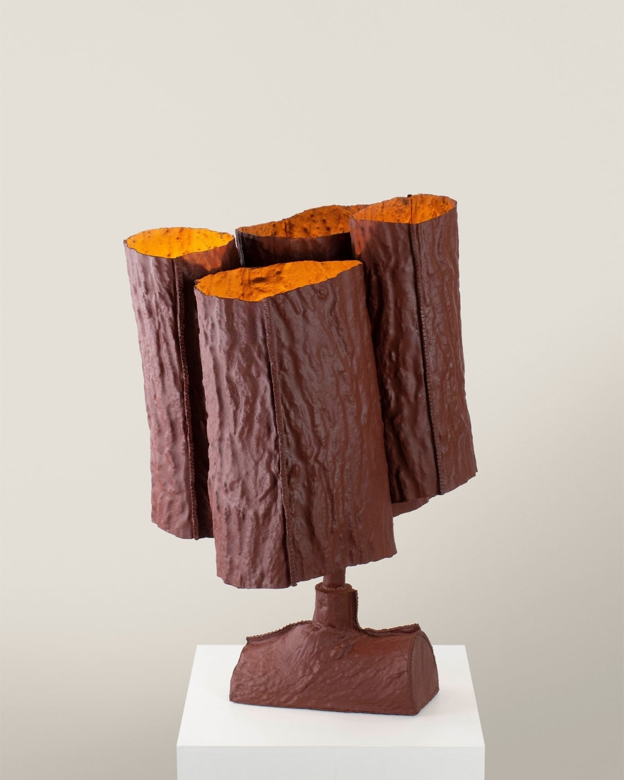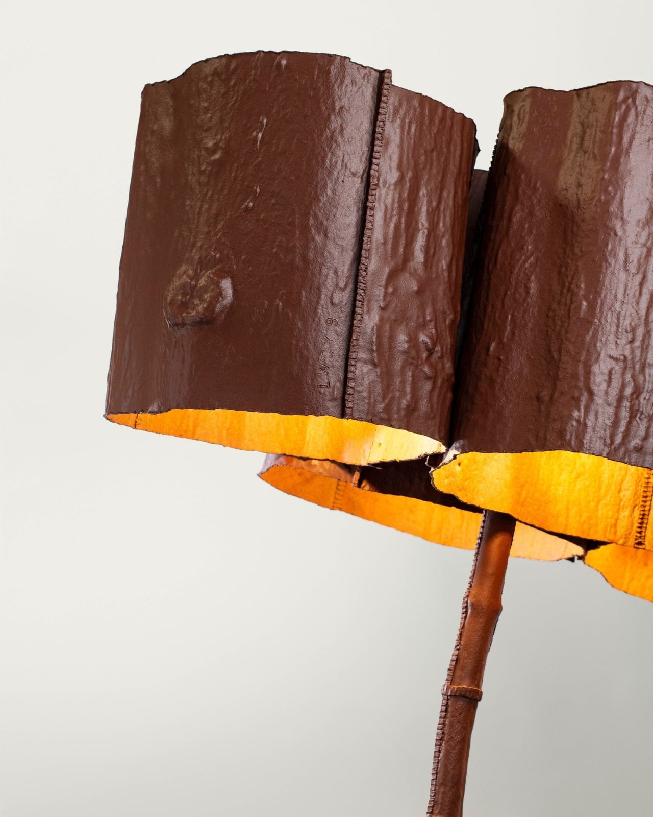 The material Fraser works with is Worbla, a biodegradable thermoplastic that contains roughly 30 percent waste sawdust. That sawdust detail is worth sitting with for a moment. The material is literally made, in part, from the same kind of organic matter it’s being shaped to resemble. It’s a closed-loop logic that feels almost poetic, and it carries through into the production process as well. Offcuts from fabrication don’t get discarded. They get reheated and folded back into the work as welding material or as internal structural support for the pieces. The heat-activated adhesive properties of the material mean no additional bonding agents are needed, which removes one more synthetic component from the equation. Surfaces are finished with natural mineral paint, keeping the material story clean from start to finish.
