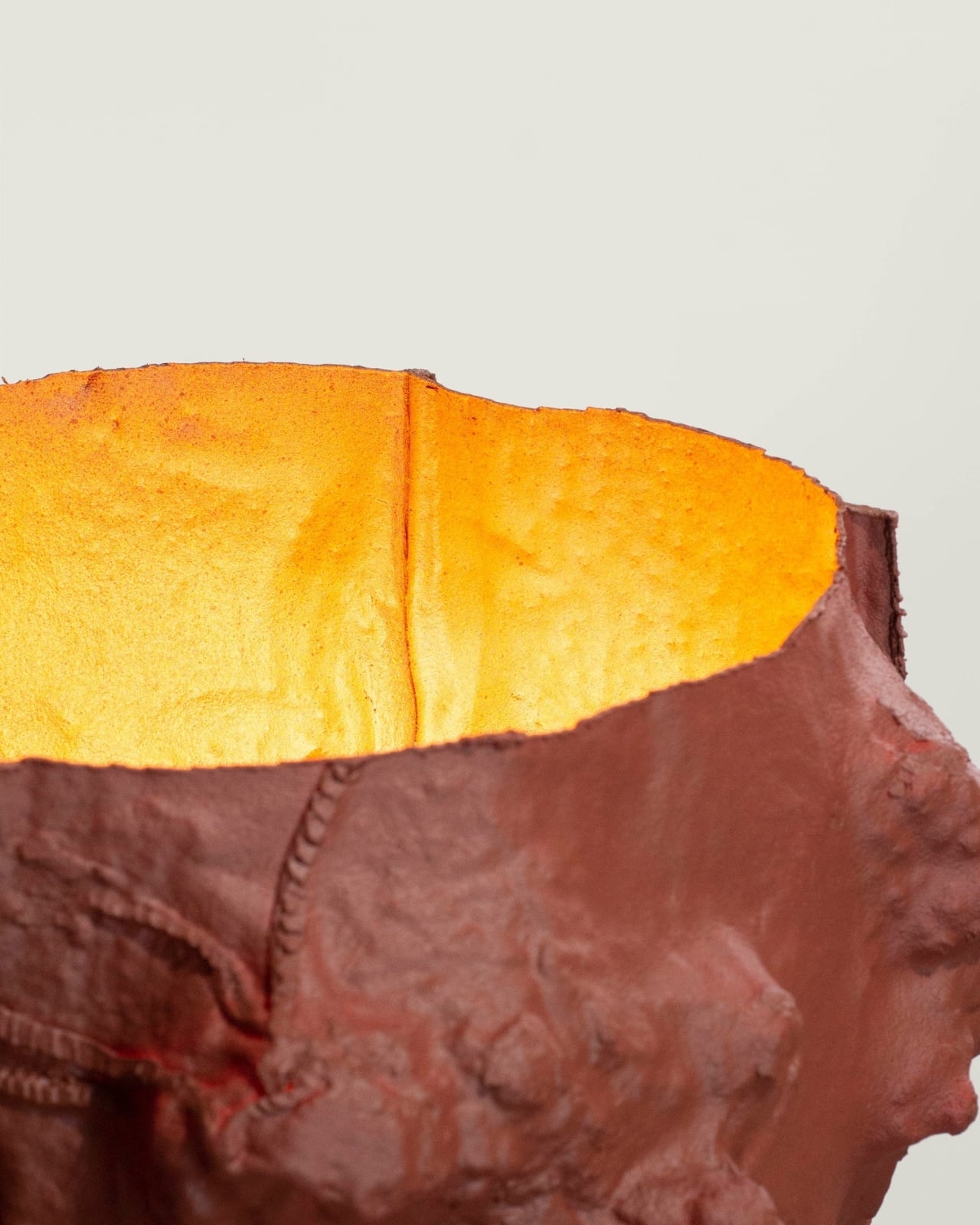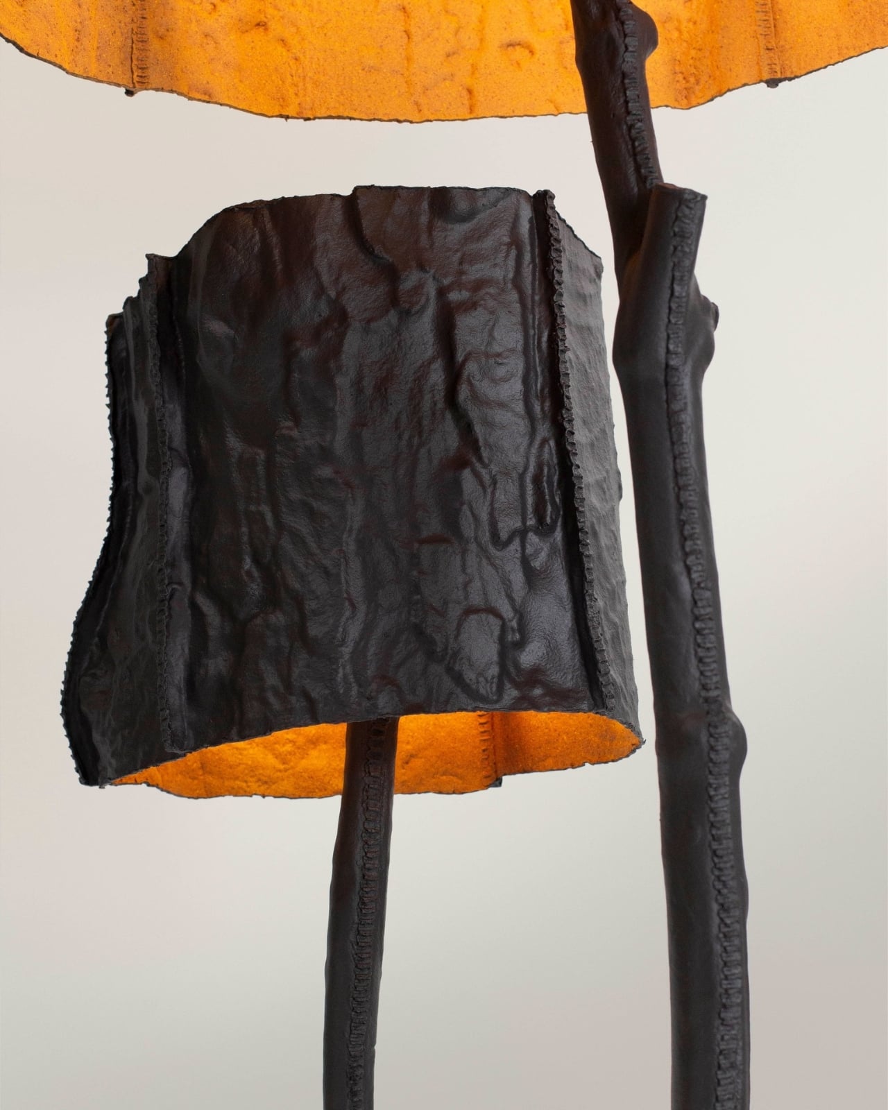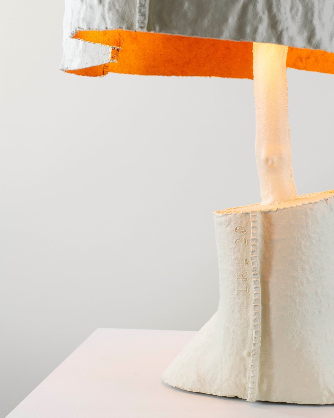 That personal starting point matters more than it might seem at first. A lot of sustainable design today leans heavily on the idea of nature while keeping a safe aesthetic distance from it. Fraser collapsed that distance entirely. The irregular textures across each piece, the way no two lamps in the series look exactly alike, these aren’t stylistic choices made in a studio. They’re what happens when you let nature do the actual drafting.