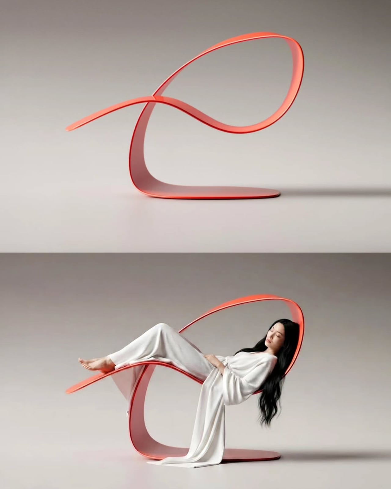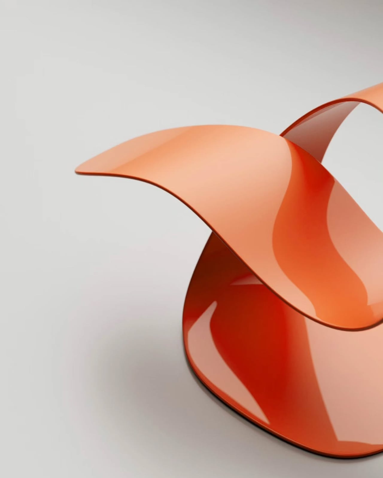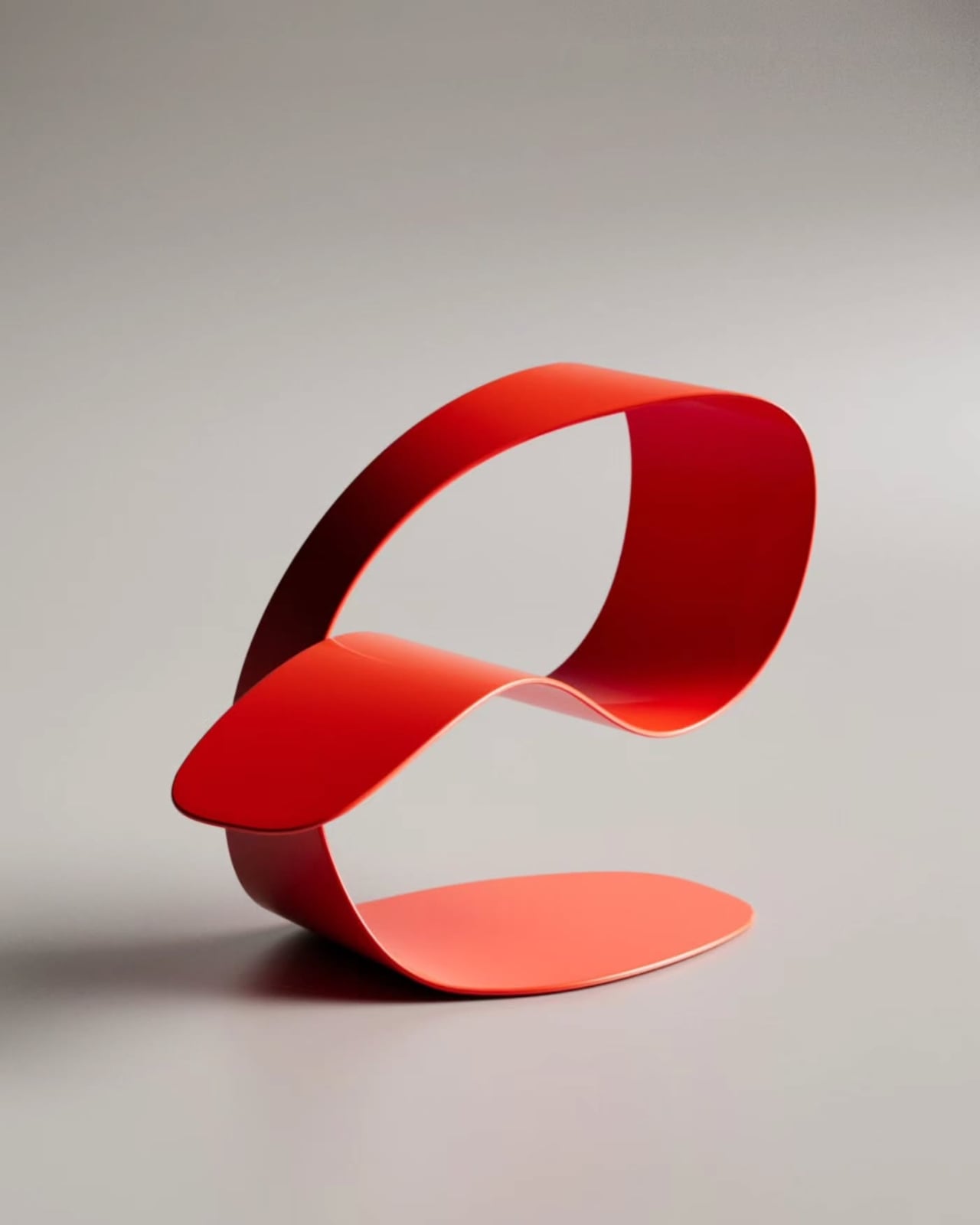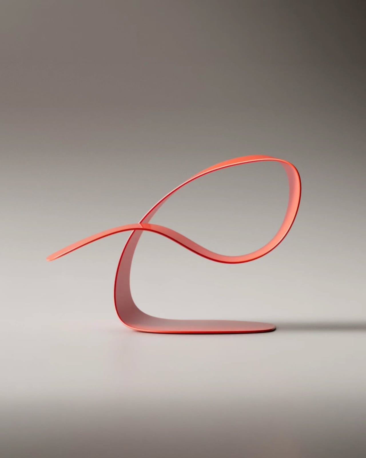 The color choices across the presented versions are worth noting too. The gradient between that soft coral-pink and deeper warm red isn’t accidental. It gives the piece a kind of warmth that pure minimalism often lacks, grounding what could easily have been a cold, clinical form into something that feels alive, almost organic. The glossy finish on some versions catches light beautifully, shifting the reading of the piece depending on where you’re standing. From one angle it looks almost weightless. From another, it looks like a sea creature at rest.