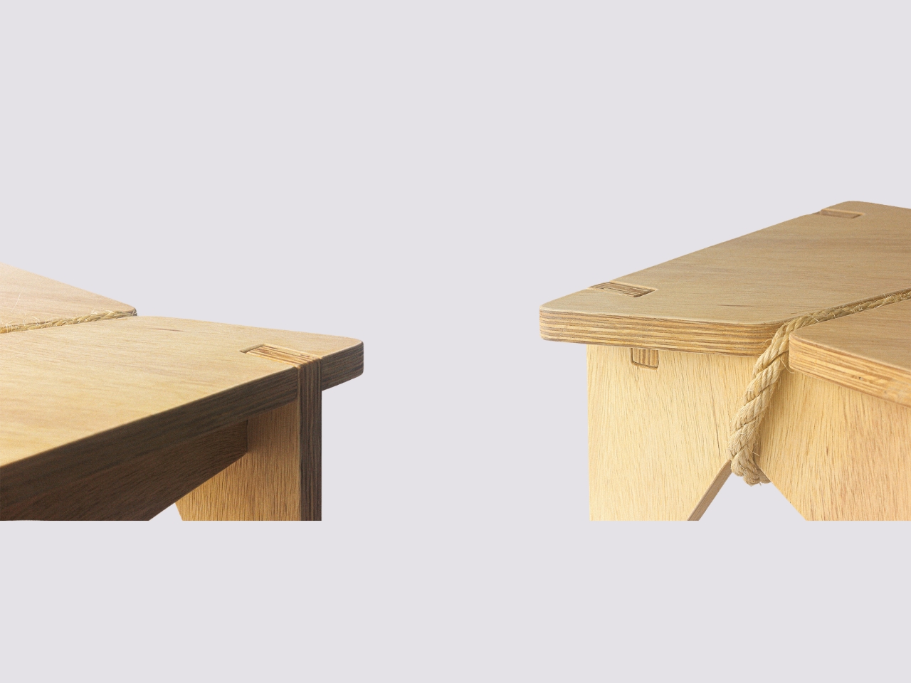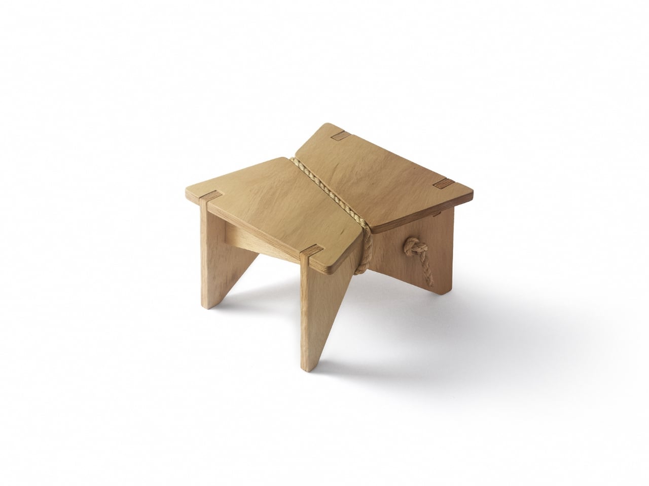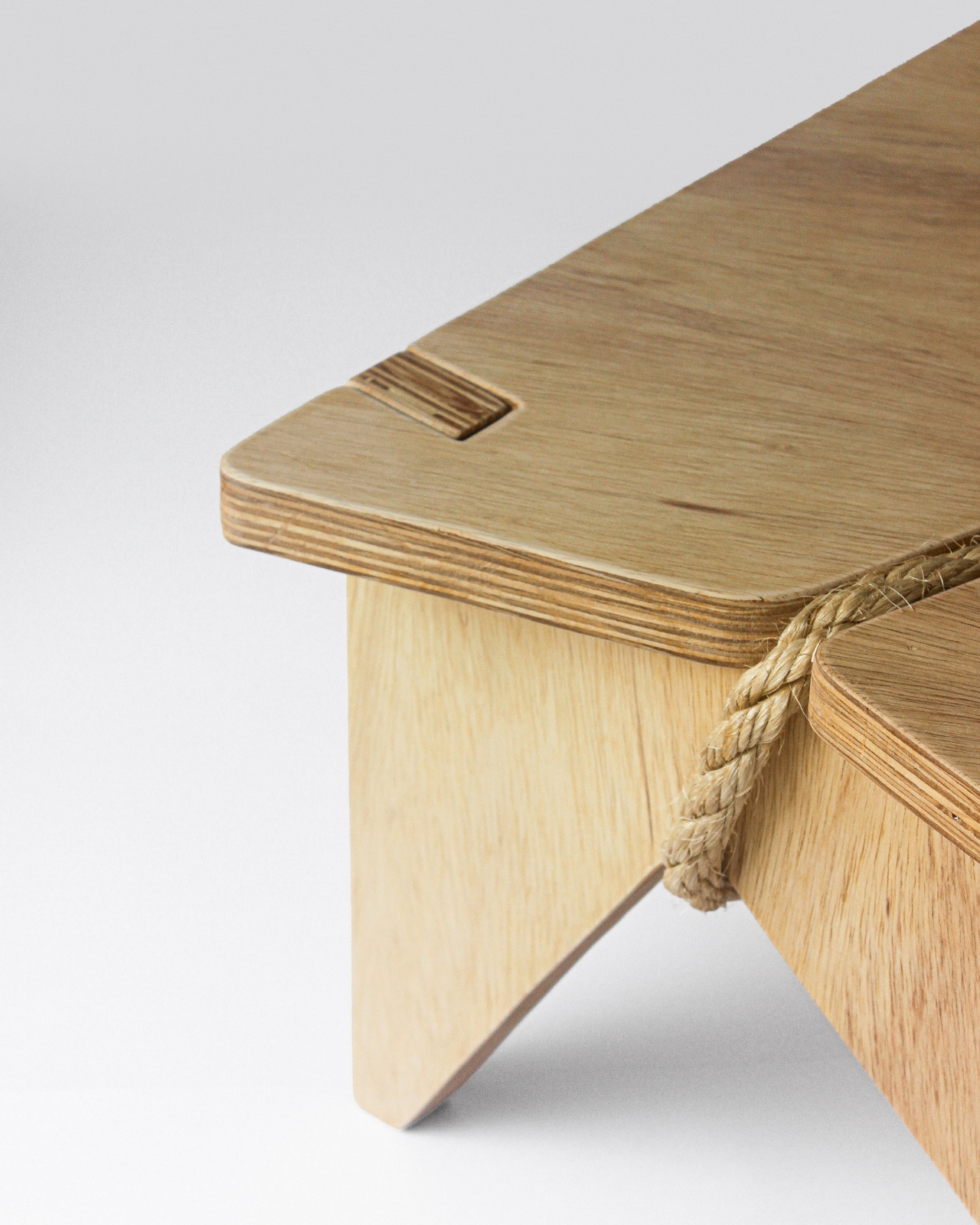 Materially, the piece holds its own. It’s made from marine pine plywood, assembled through a system of interlocking joints that require no screws, bolts, or complicated hardware. What holds it all together is tensioned sisal rope, and this is the detail that makes the whole thing click, visually and structurally. The rope isn’t decorative in the way that so many “natural element” additions can feel forced. It’s actually doing the work, reinforcing the structure while giving the stool a texture that you want to reach out and touch. It makes the design feel honest, which is appropriate given what the piece is trying to say.