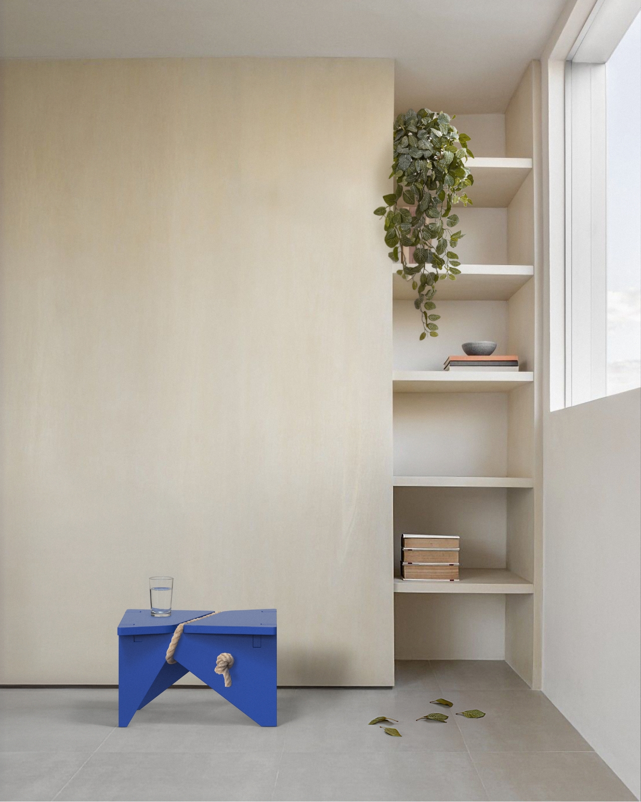 The modular nature of it is worth mentioning too. Single units can be connected to form a longer bench configuration, which means the Shortcut Stool scales with need rather than requiring you to commit to one fixed form. The flat-pack assembly and disassembly is straightforward, making it easy to move, store, or reconfigure. It comes in natural pine as well as painted versions in a deep cobalt blue and a muted sage green, both of which look sharp in context. The blue one especially has a kind of confident visual energy that punches well above the stool’s modest size, which is something I didn’t expect from a plywood bench.