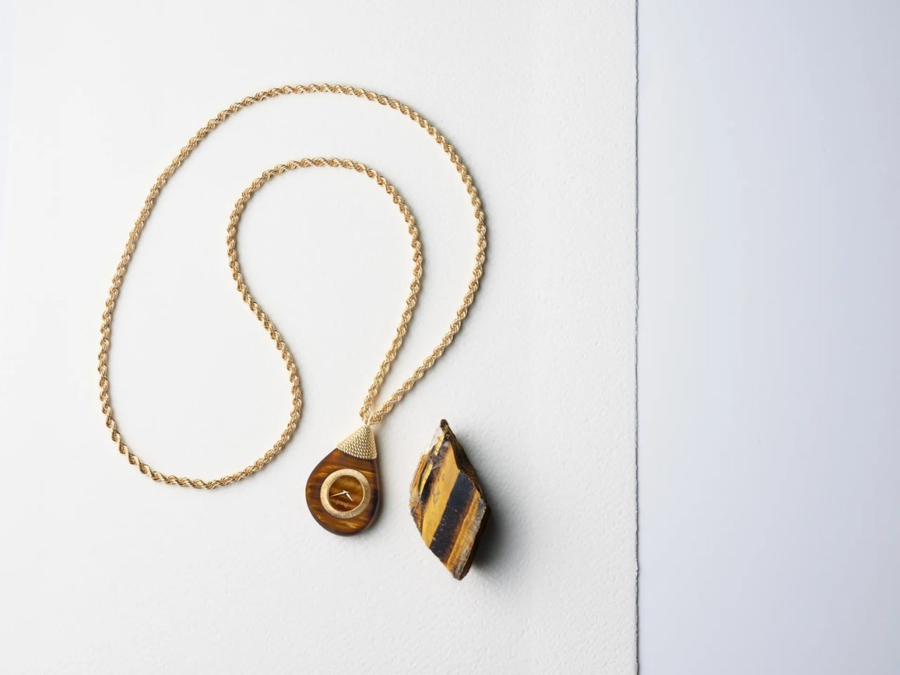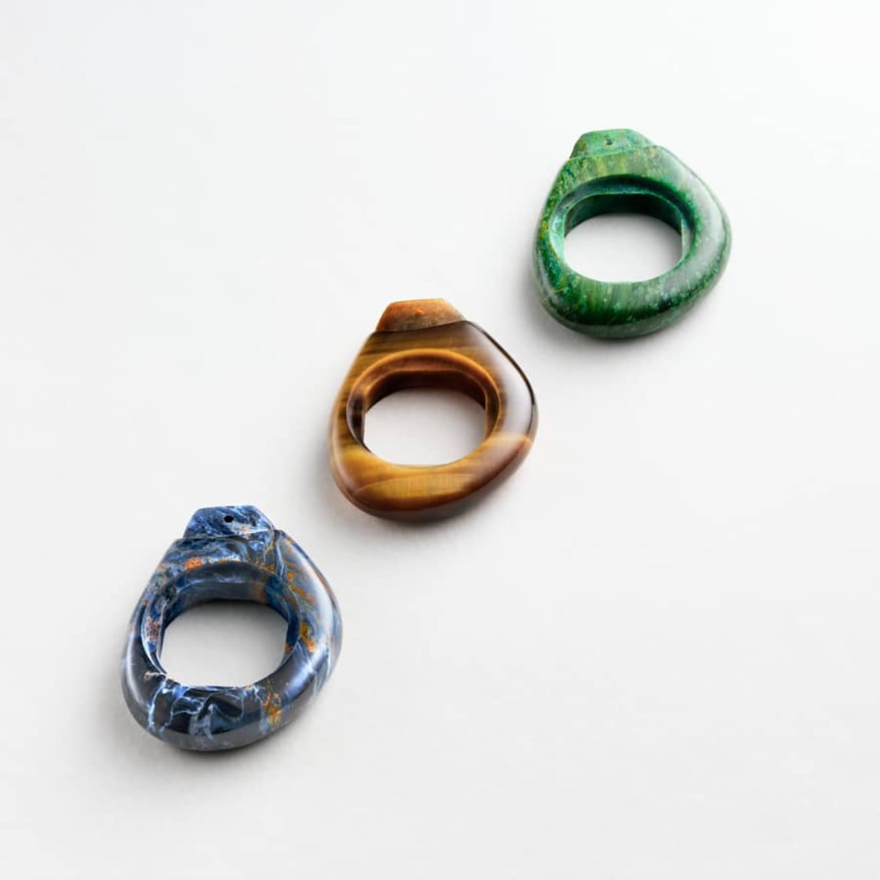 The collection comes in three stone varieties: golden tiger’s eye, grass-green verdite, and pietersite, each with its own mood and temperature. Tiger’s eye has that warm, chatoyant shimmer that catches light differently depending on your angle. Verdite is earthy and lush, the color of an old botanical illustration. Pietersite is the most dramatic of the three, with its stormy, swirling blues and golds that look like a weather system captured in mineral form. Choosing between them feels less like selecting a product variant and more like choosing a personal talisman.