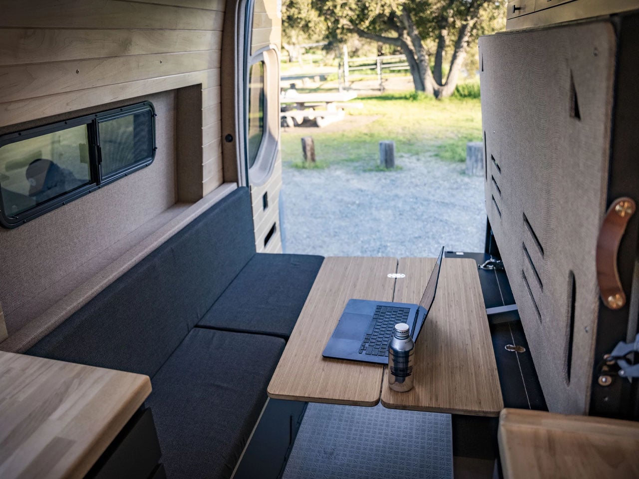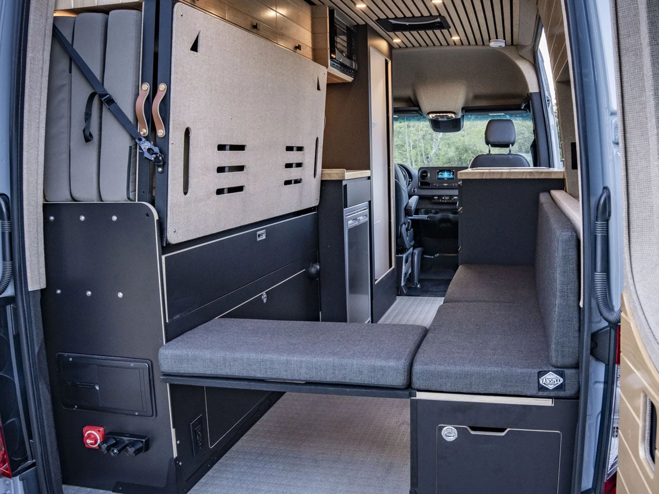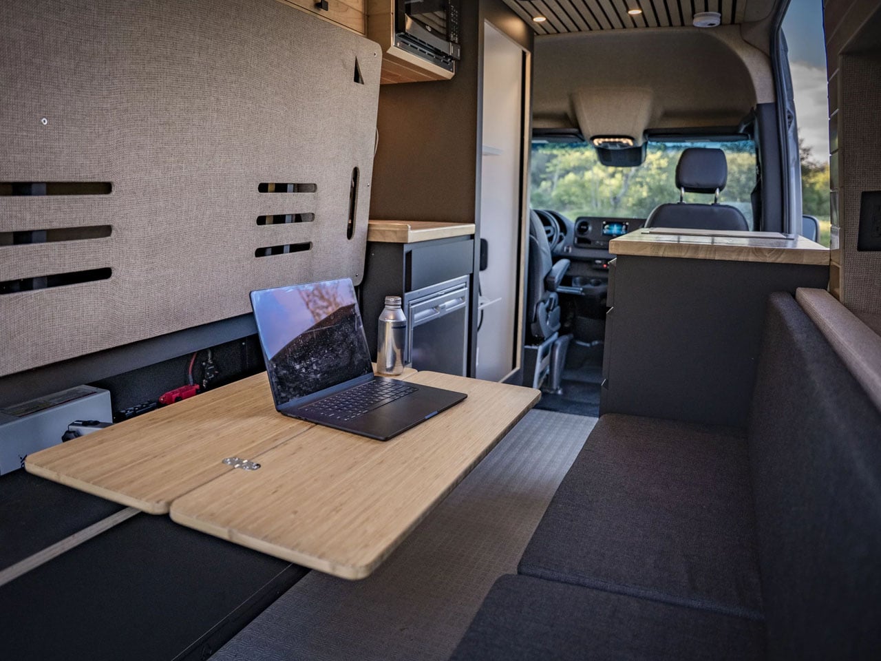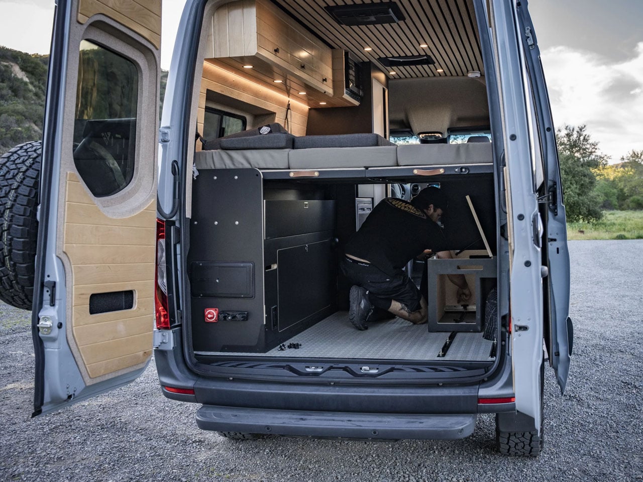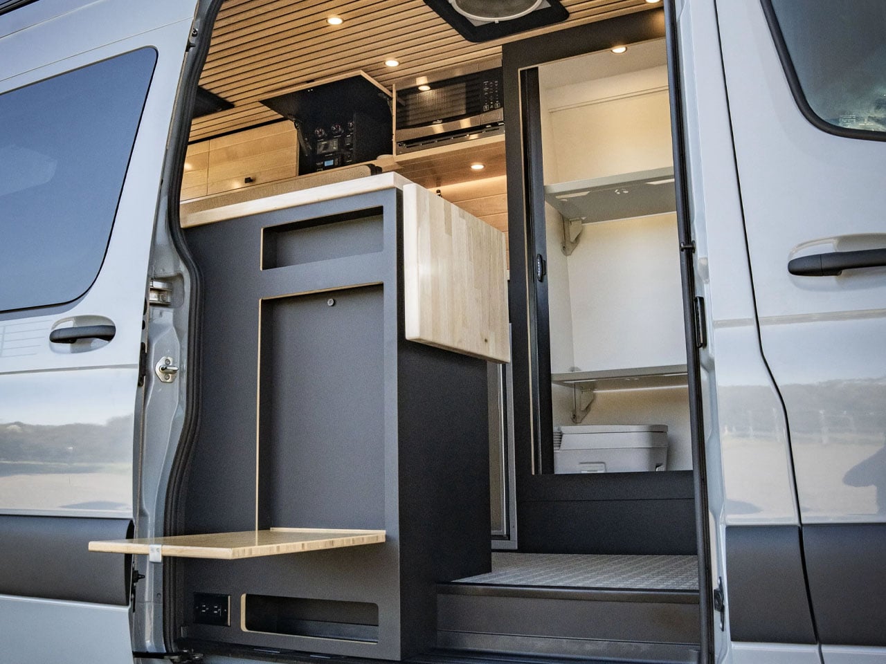 Built atop a Sprinter 144 AWD, it offers an ideal blend of convenience and luxury, making it ready to go wherever you need it. The Vanspeed camper van strips off any fancy exterior addons, keeping the body simple and clean. Only visible addition to the body is the roof ladder on the driver’s side to access the full-length rooftop rack.