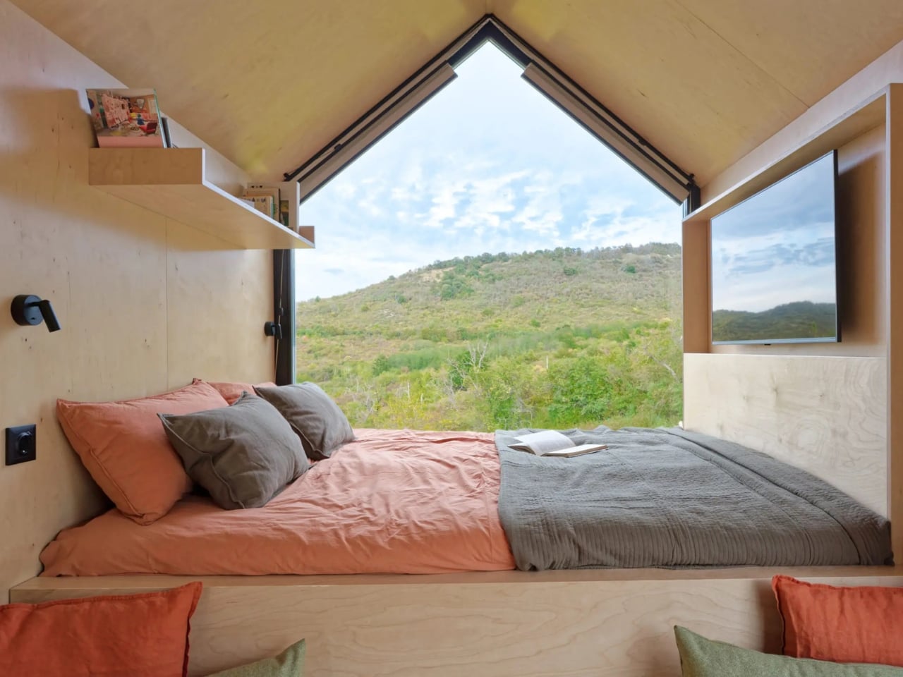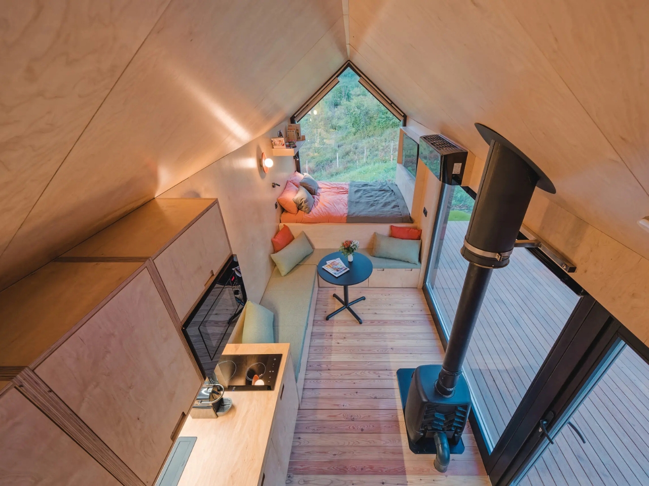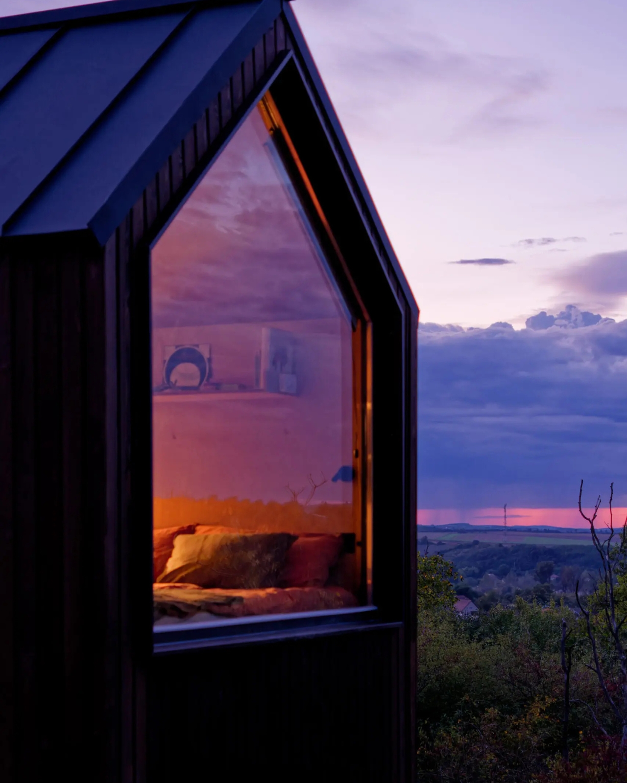 Inside, birch plywood covers the walls, ceilings, and built-in furniture, giving the space a warm and continuous quality that feels more like inhabiting a well-crafted object than occupying a room. The panoramic opening does exactly what a good view should do: it pulls the outside in without letting the outside overwhelm the interior. You are still in an enclosed, protected space, but the valley stretches out in front of you like a second room you never had to build or pay for. Kotek clearly understood that in a cabin this size, the view is not a bonus feature. It is structural.