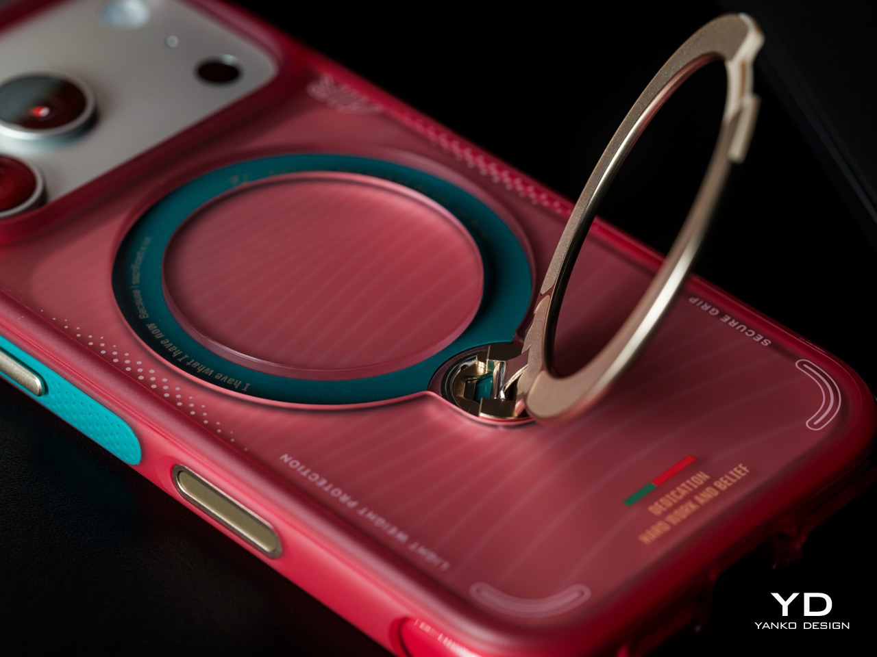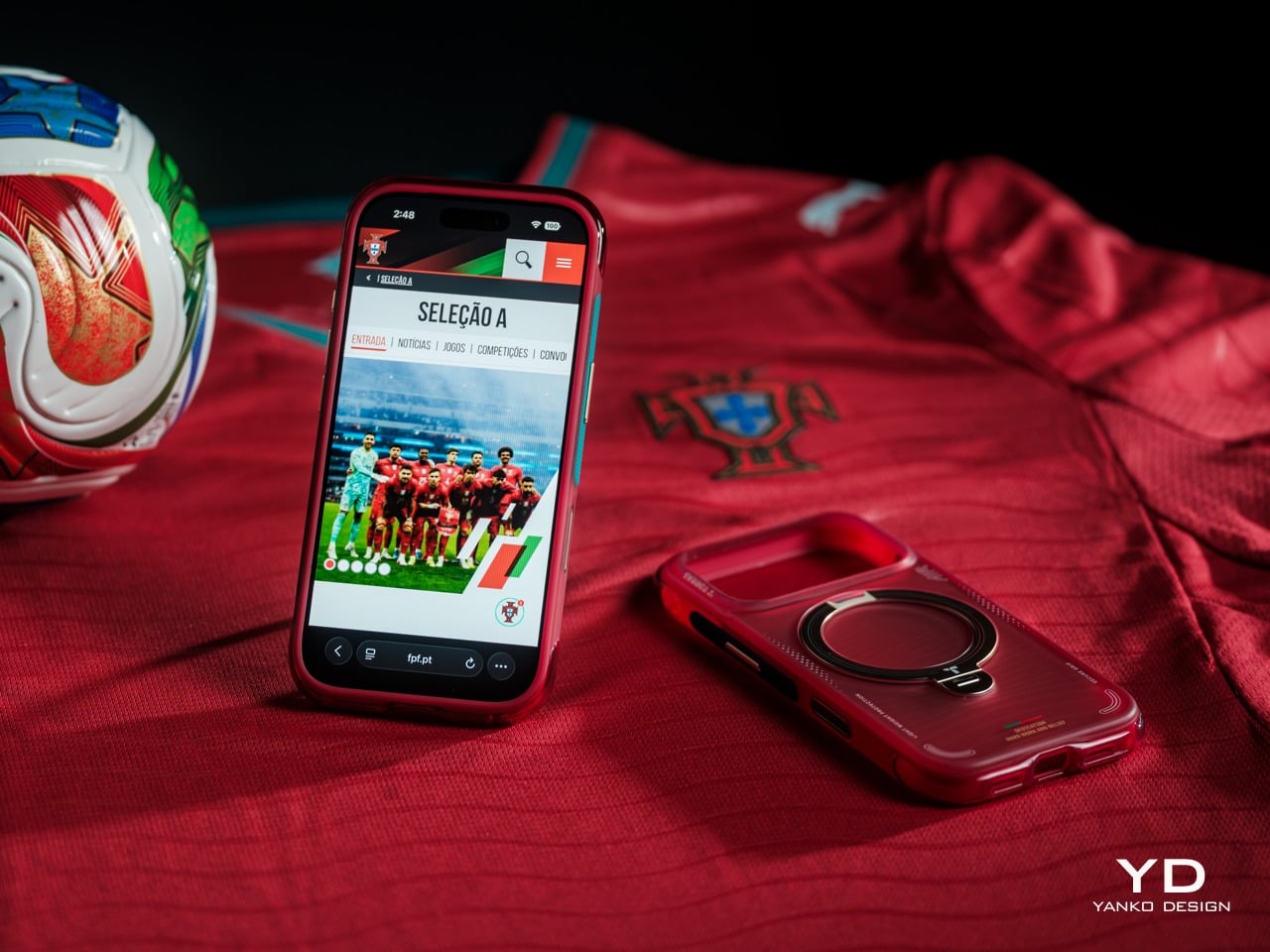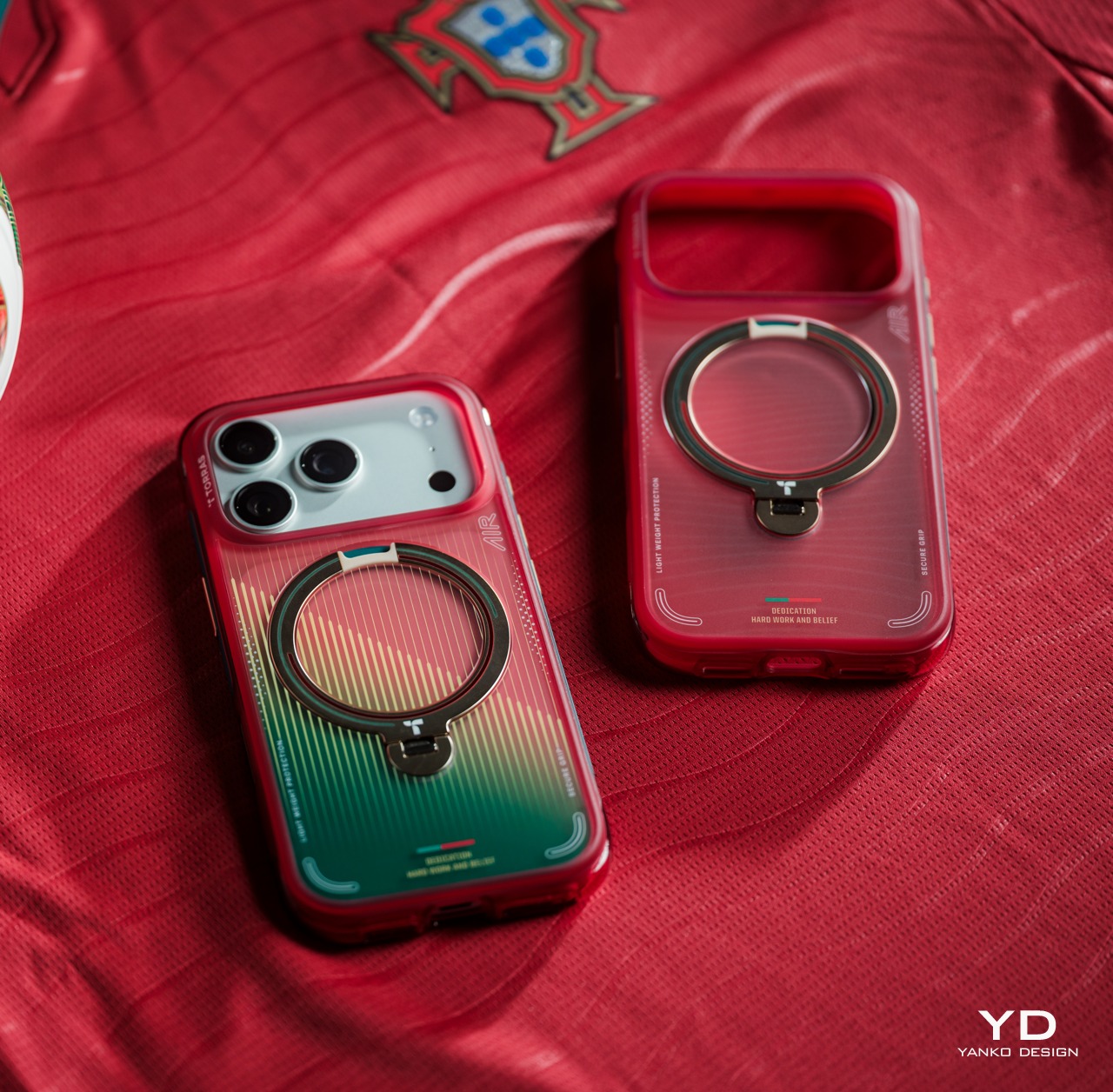 The back of the case is where the design story gets specific. Fine horizontal striping draws a clear visual reference to the texture of a football jersey, while the circular framing around the magnetic ring gives the composition a natural focal center. Gold accents on the ring stand connect to Portugal’s championship legacy, and Portugal’s Quinas emblem appears in the airbag structure as a rewarding detail on closer inspection.