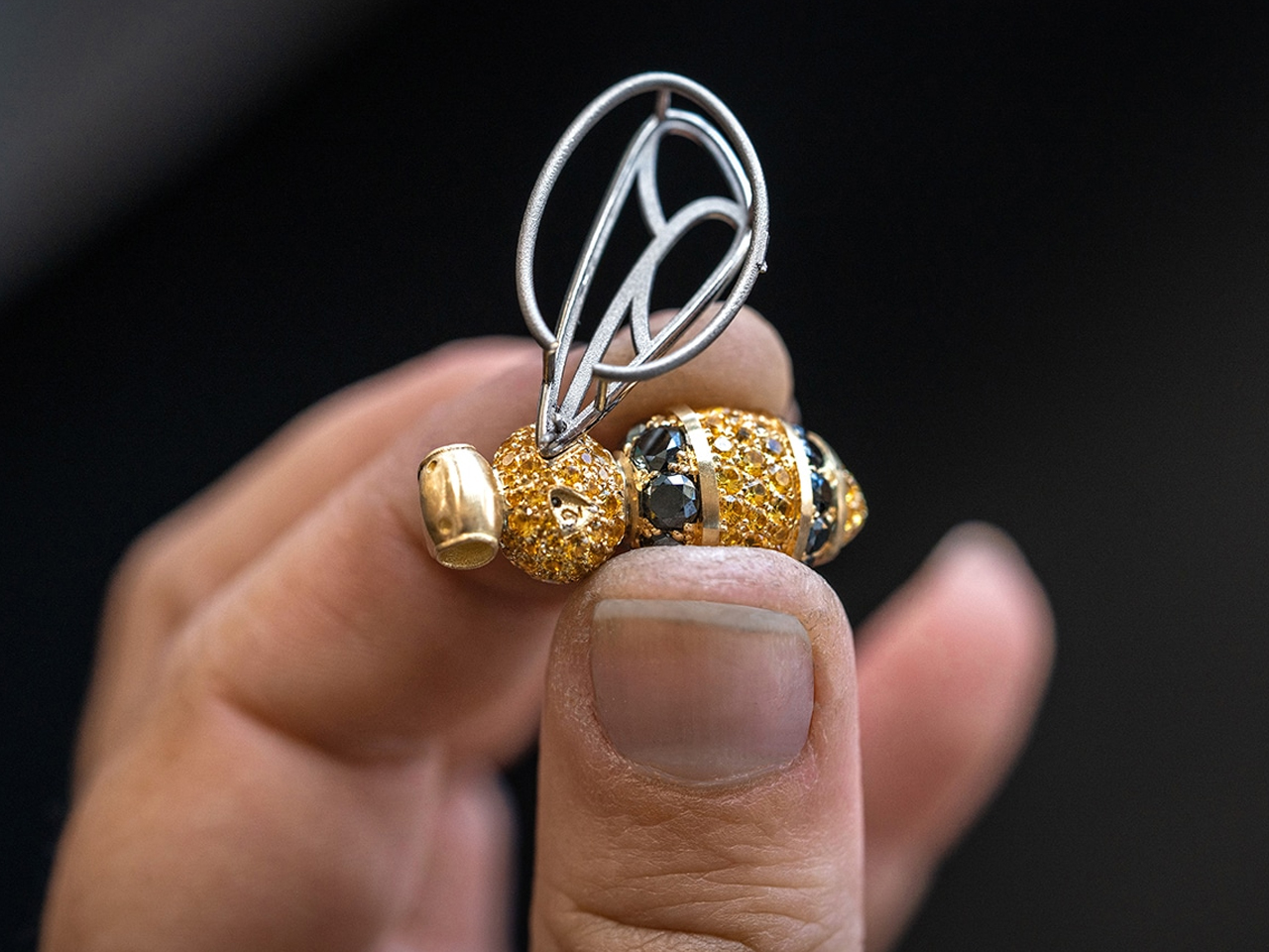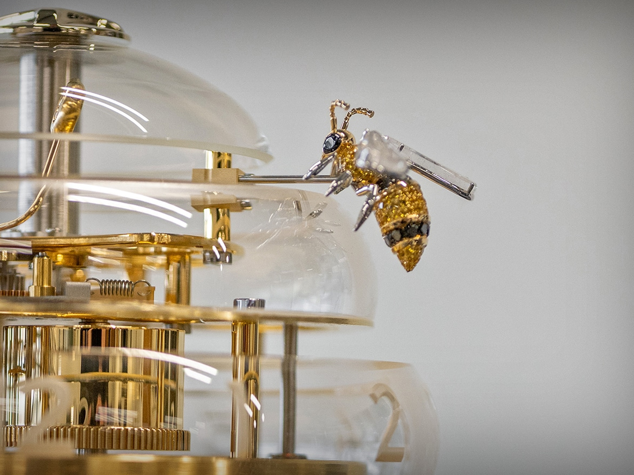 The clock, measuring 25.8 cm high and with a diameter of 16.5 cm, features three jeweled bees made in Chopard’s jewelry atelier in Geneva. The bees feature a body made using 18-carat ethical yellow gold, which is studded with gemstones, yellow sapphires, and black diamonds, and have rock crystal for wings. While the bees may feel like the most distinctive part of the clock, which comprises seven rounded tiers of borosilicate glass, two of which have the hour and minute numerals. It’s the chime mechanism of the Chopard Beehive Table Clock that’s, in fact, its best highlight.