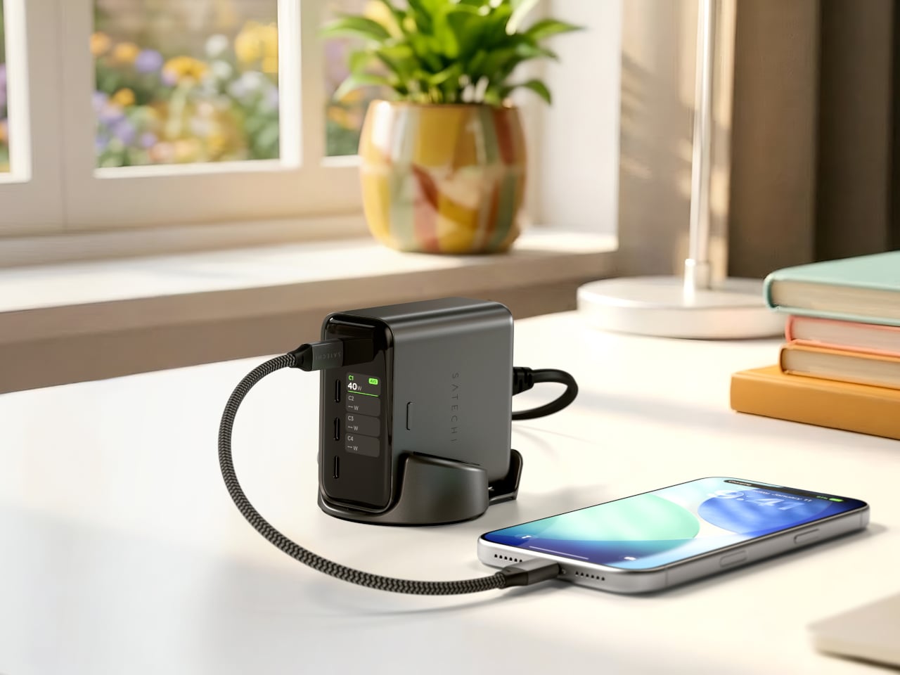 Satechi’s ChargeView 140W Desktop Charger takes a different approach to that last part. Built around a compact GaN hub with four USB-C ports, its most distinctive feature is a built-in digital display that shows real-time wattage across each port. Rather than treating power as something to tuck under a desk, Satechi designed the ChargeView to sit out in the open and show exactly what it’s doing.