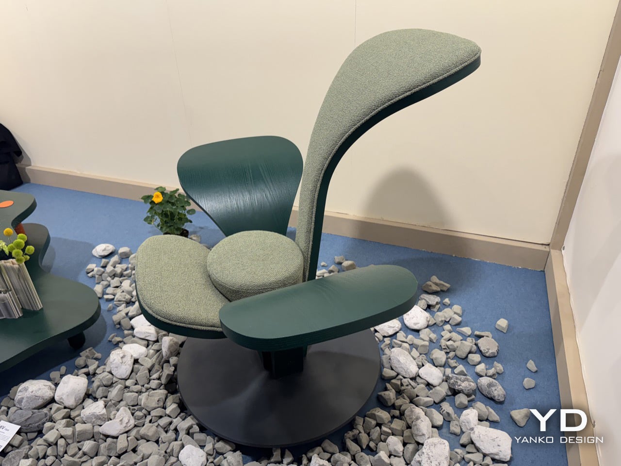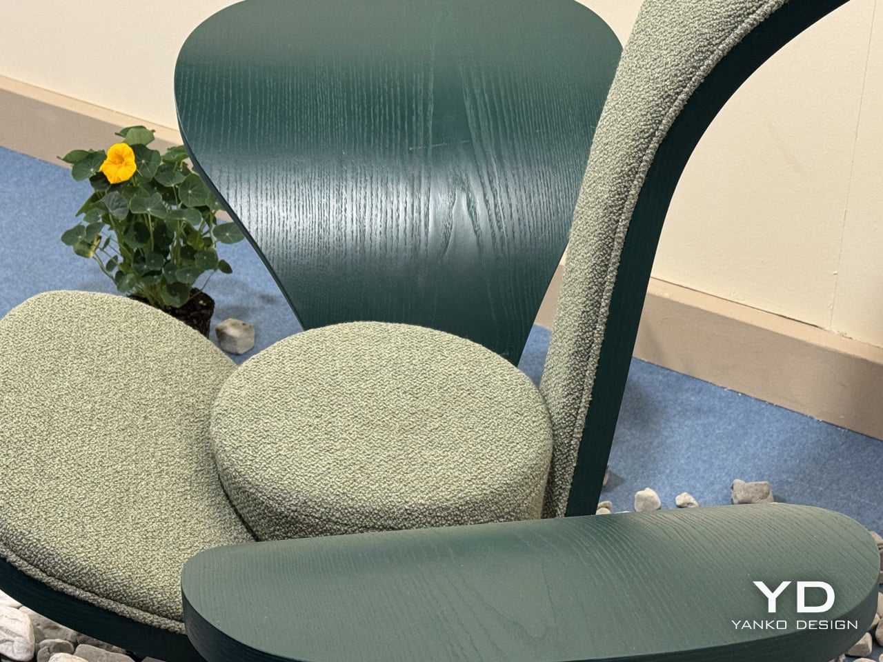 Two of CLVR’s four leaves are upholstered in a mossy, boucle-like forest green textile, covering the tall backrest and the lower front surface where the body settles. The other two are left as bare stained wood, their grain visible under the deep green finish, extending outward from the center like wings. All four share one curvature and one design logic, shaped by bent wood, which is what holds the composition together despite its apparent asymmetry. The design is coherent because its grammar is consistent, even as the function of each leaf changes.