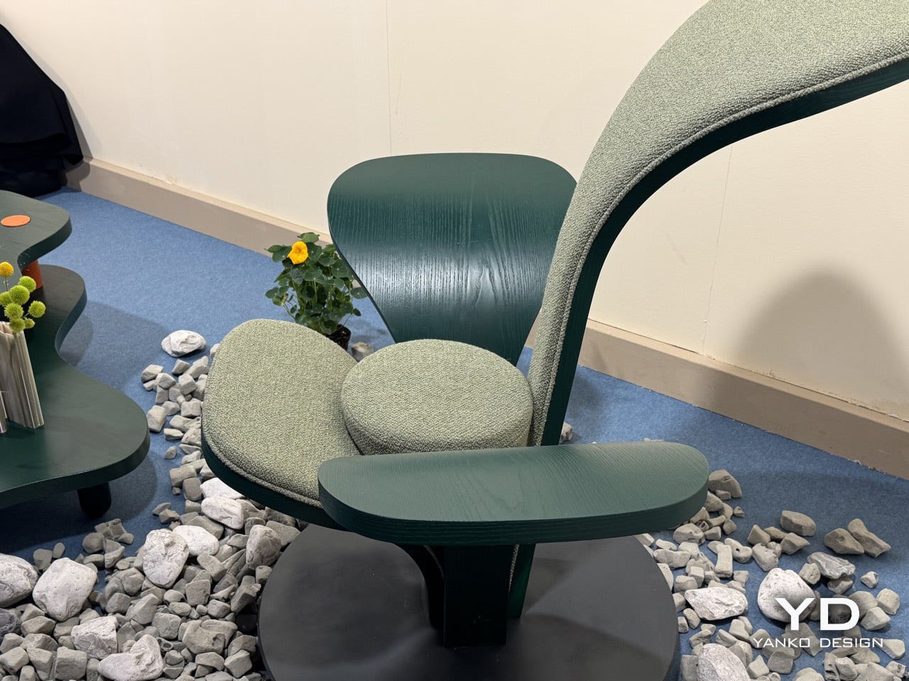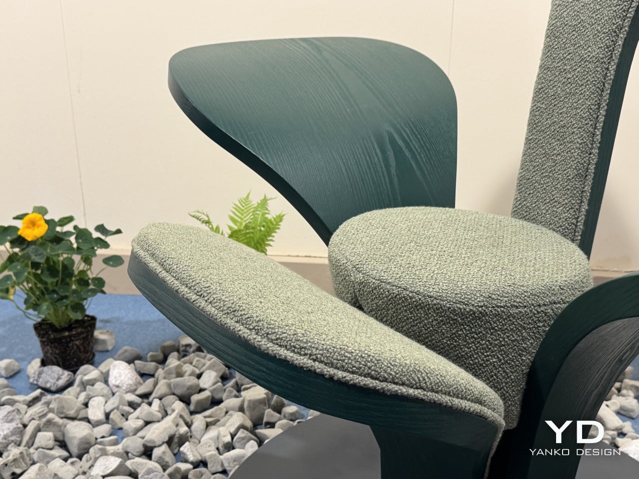 The bent-wood forming technique reinforces that connection, requiring an intimacy with the material that keeps the work tethered to craft. The chair’s forest green palette, running across bare wood and woven textile in two calibrated tones, holds the composition together as one chromatic idea rather than a collage of parts. It’s a thoughtful detail that shows how completely the studio considered the object from every angle, ensuring the material and color choices support the core concept.