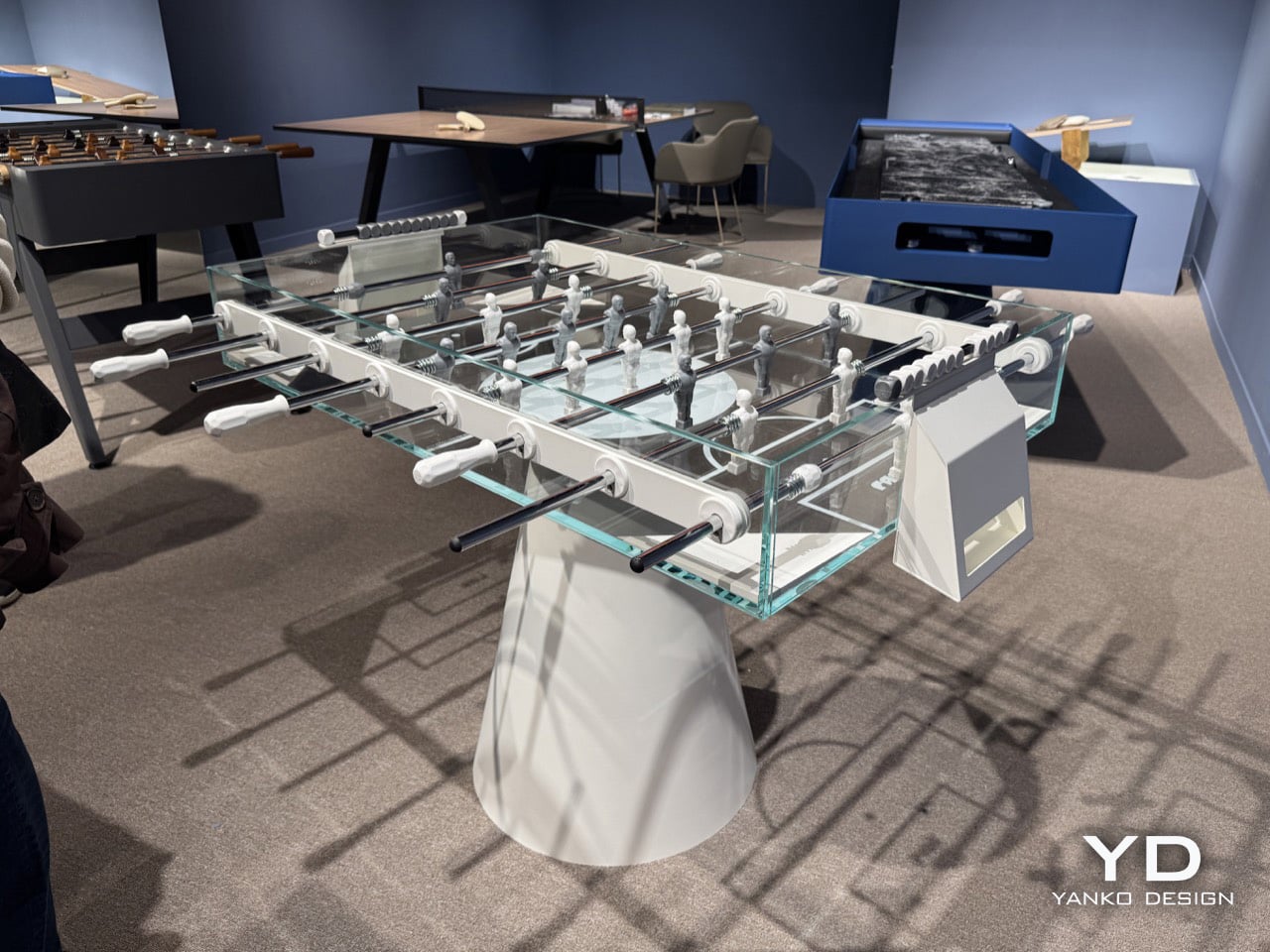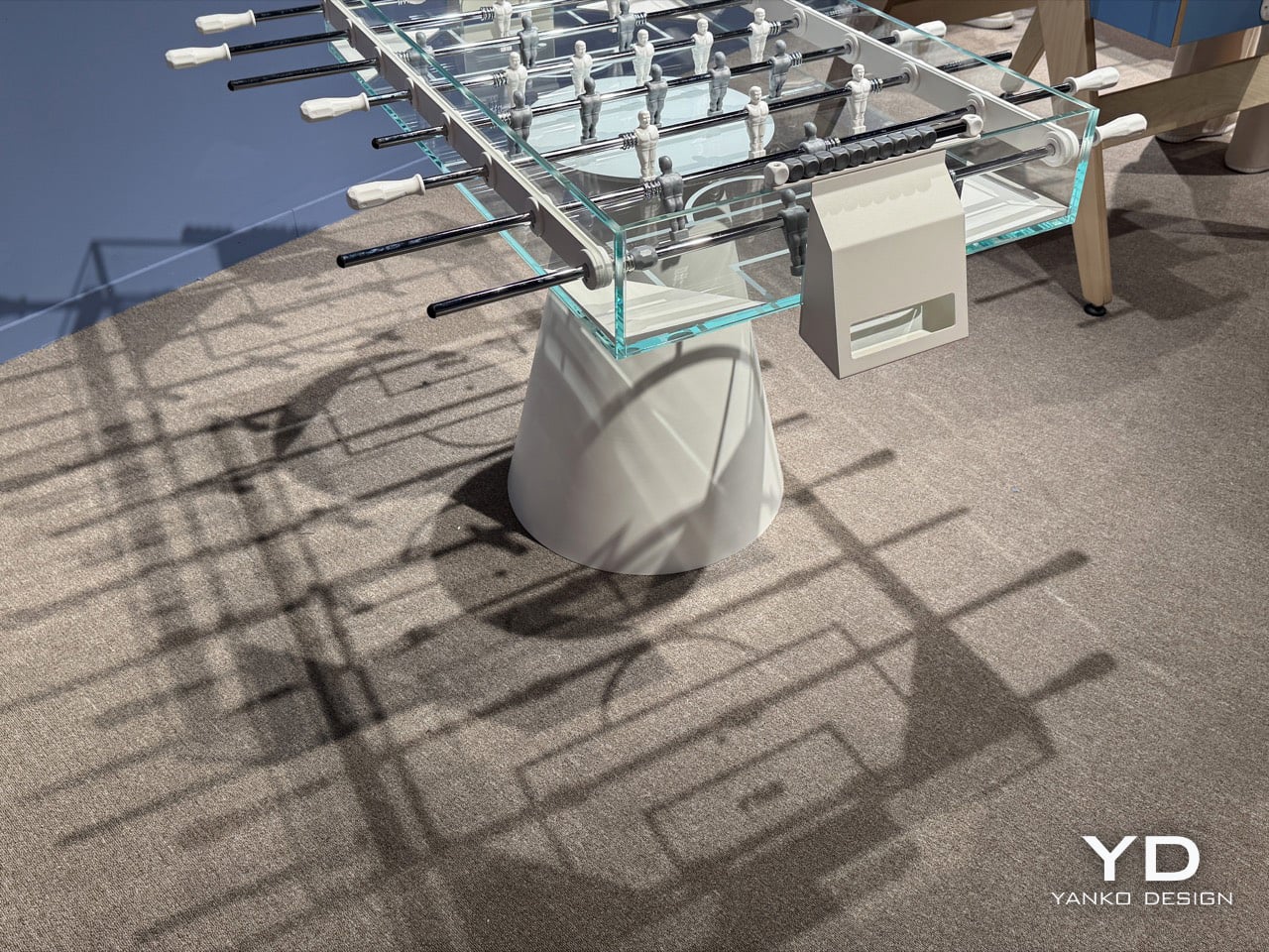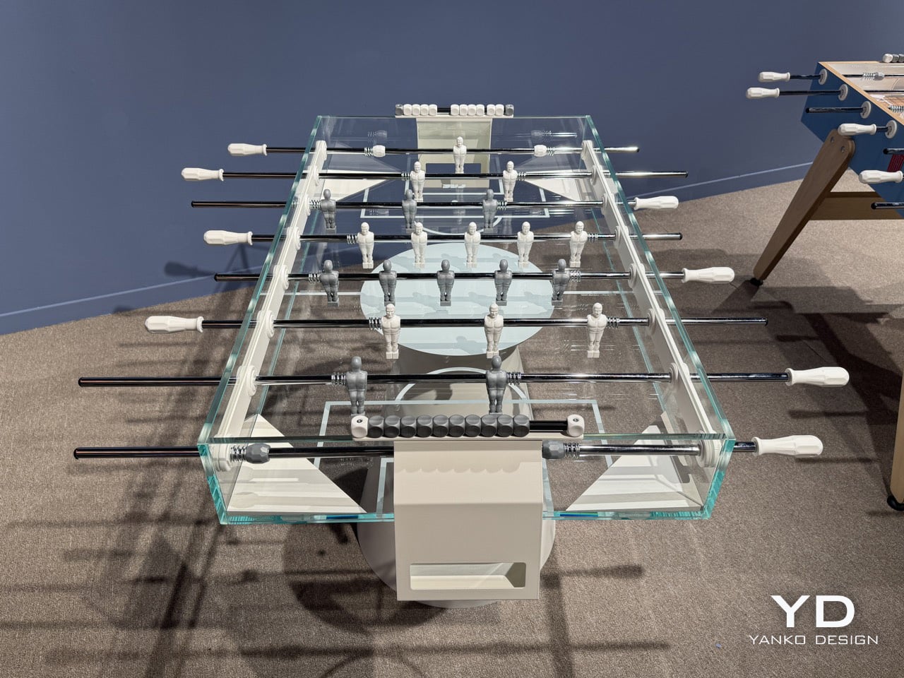The early 2000s had a very clear idea of the future. Think of films like *Minority Report* with its PreCrime headquarters, all white rooms and glass interfaces where everything looked seamlessly bonded rather than bolted together. Or *I, Robot*, which pushed that look even further with its glossy USR tower and Audi concept car, a world that had erased any sign of how things were actually made. That aesthetic has aged remarkably well, but it’s a territory most game furniture never touches, usually favoring rich materials over making things look like they are barely there. Basaglia + Rota Nodari are the exception, and Ghost, their foosball table for FAS Pendezza, is the proof.