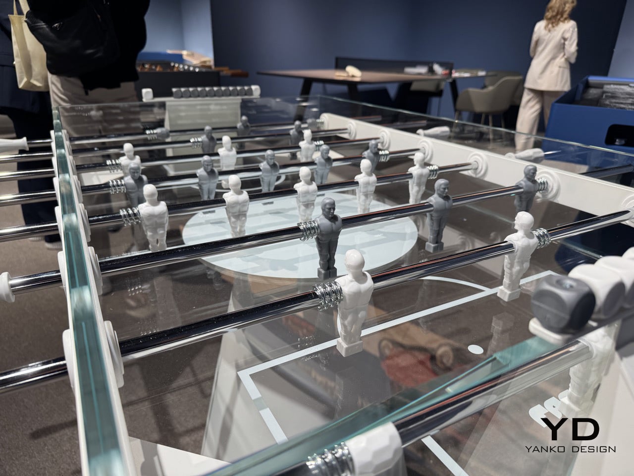 But what really captures you are the detailed shadows the Ghost projects on the floor, if paired with the right lighting. At Salone Satellite, Ghost casts an incredible wireframe shadow on the floor, like it’s drawing a blueprint of itself in real time. Pitch markings are printed beneath the crystal surface, so they appear to float inside the glass instead of sitting on top. From any angle in the FAS Pendezza booth, you can see right through the structure, with the players and chrome rods suspended against the room itself. The name makes perfect sense when you see it in person.