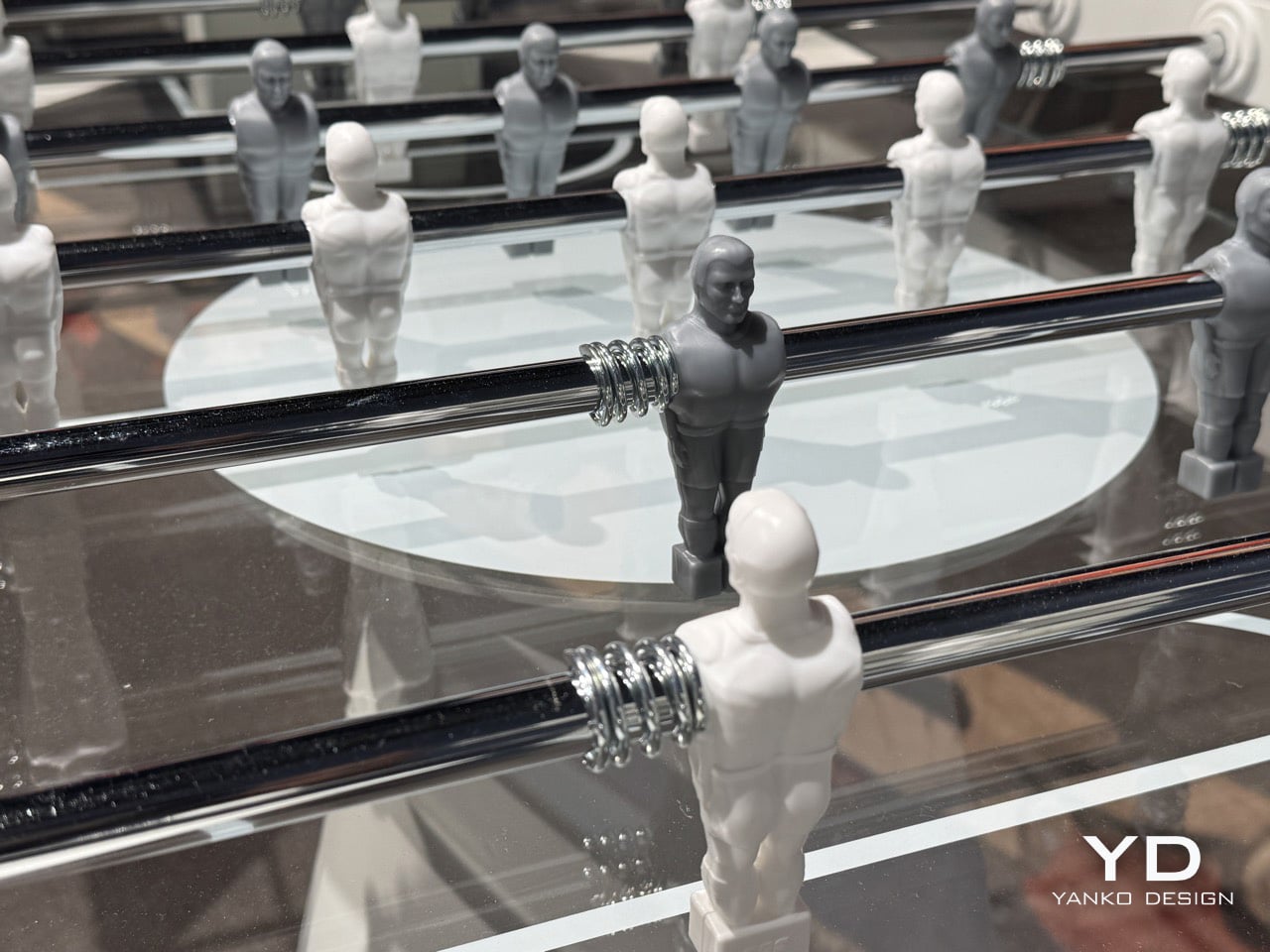 Even the players, made of white and gray resin, look like they belong in this sci-fi world. They’re somewhere between a medical illustration and a concept-car sketch, simplified to the point of anonymity. That’s exactly why they work. If they were in conventional team colors, the table would feel like just another piece of recreational equipment. Instead, these figures feel closer to the NS-5 robots of *I, Robot* than to any real athlete, which helps keep the whole look clean and unified. The chrome coil springs connecting them to the rods are the one little nod to mechanical texture, and they look almost like jewelry against all that glass.