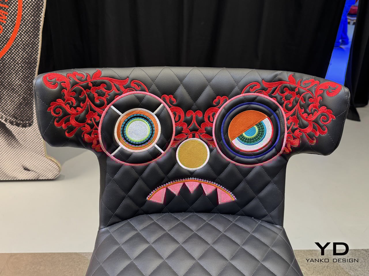 Moooi’s 25th anniversary celebration at Milan Design Week 2026 brought a reimagined Monster Chair collection to Superstudio Events, and this time the monsters are unavoidable. Each chair in the lineup features a hand-embroidered creature sprawling across the backrest, rendered in vivid, layered threadwork. One has concentric-circle eyes in clashing neon tones. Another hides behind ornate red filigree that frames its face like vintage wallpaper turned sentient. There are geometric flames, pink zigzag teeth, emerald scrollwork that could be tentacles or vines depending on your interpretation. The base silhouette stays true to the original, that black quilted leather and sculptural leg structure providing just enough formality to make the embroidered chaos feel intentional rather than random. It’s furniture that demands attention, and after 25 years of pushing boundaries, Moooi clearly has no plans to apologize for that.