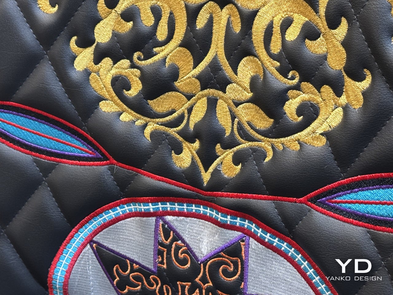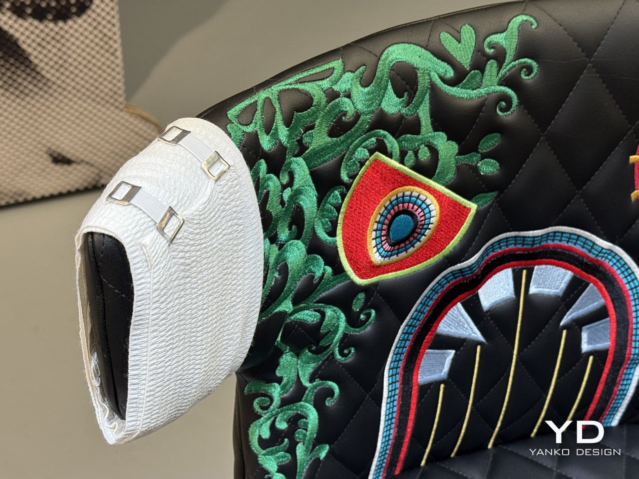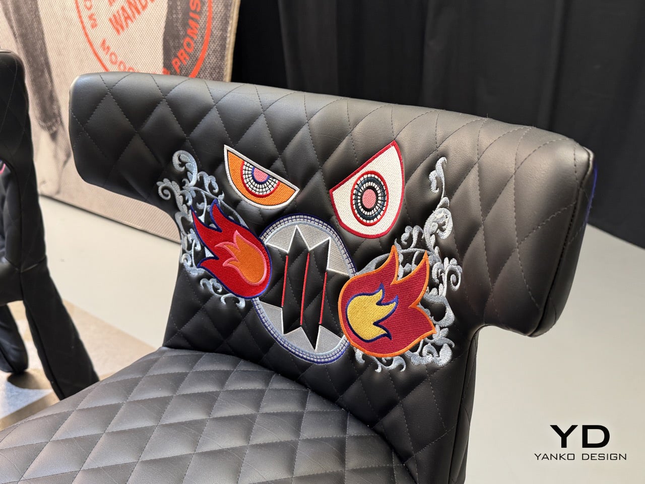 The embroidery work transforms an already iconic chair into a craft-intensive Labubu-esque character. Each monster appears to be unique, with thread layered in ways that create dimensional relief against the quilted leather backdrop. Some faces use densely packed stitching that gives them an almost patch-like quality, while others employ looser, more organic threadwork that lets the black leather show through. The color palettes vary wildly from chair to chair. One goes heavy on emerald green and white, another commits to a red and orange gradient that feels almost pyrographic. The effect is a collection where every piece reads as an individual artwork rather than a production run with minor variations.