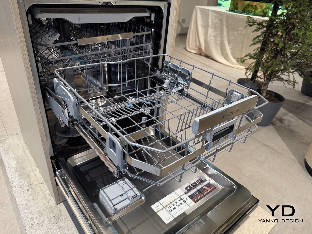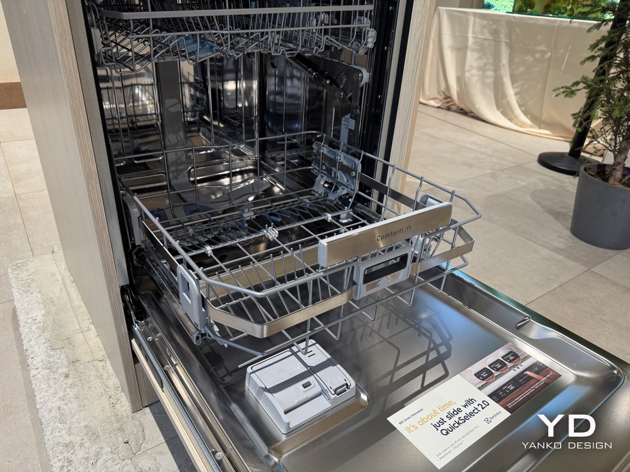 At some point, the bottom rack of a dishwasher stops being a minor inconvenience and starts being a genuine daily difficulty. For older adults and people who simply cannot bend for extended periods, loading the lower basket, which is where the heaviest cookware lives, means repeated stooping, reaching, and straightening back up with full hands. It is the kind of accumulated physical effort that kitchen appliance design has historically ignored entirely. Electrolux brought a direct answer to Milan Design Week: a lower basket that rises 25 centimetres on reinforced hinges at the squeeze of a trigger handle, meeting the user at a comfortable standing height. The feature is called ComfortLift, and it anchors the 800 series dishwasher at the heart of the brand’s Salone showcase.