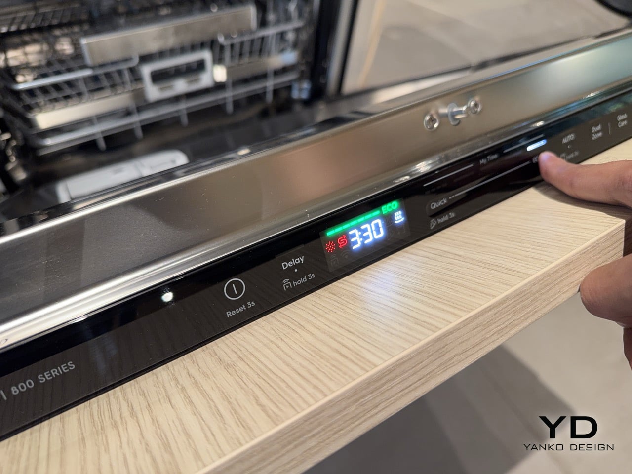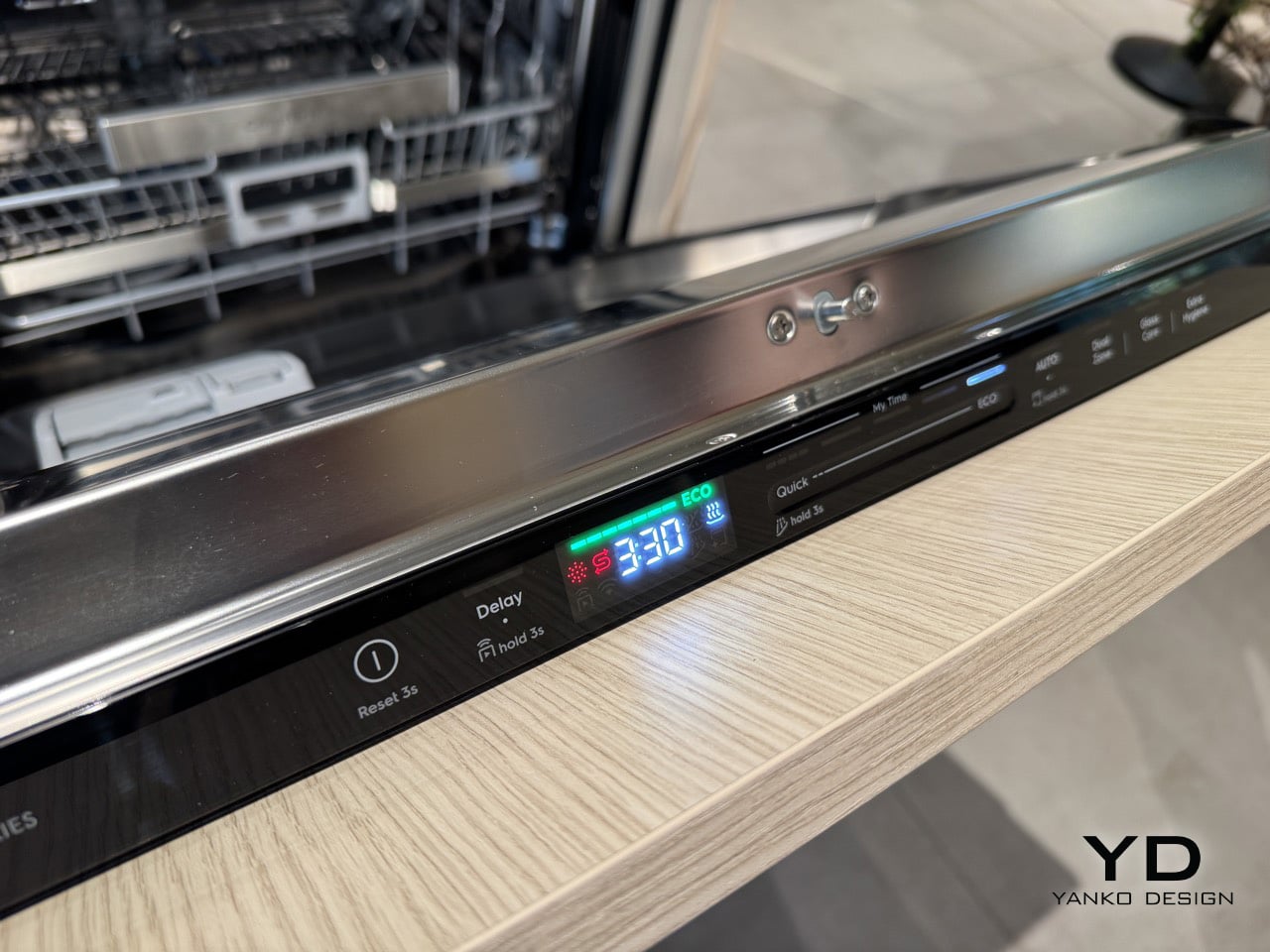 The controls sit on the lip of the door handle, positioned for direct visibility whether the user is standing in front of the machine or reaching across a counter. A sliding interface sets the cycle duration, and that choice governs energy and water consumption simultaneously, with the ECO programme activating at the longest end of the range. Electrolux made a deliberate decision to present time in 30-minute increments rather than the oddly specific figures that populate most dishwasher interfaces, the kind of readout that tells a user a cycle takes 68 or 52 minutes without explaining why. The shortest cycle runs at 30 minutes, while ECO extends to 3 hours and 30 minutes, drawing as little energy and water as the machine can manage across that duration. Rounding to half-hour intervals turns cycle selection from a guessing exercise into something legible, honest, and genuinely quick to act on.