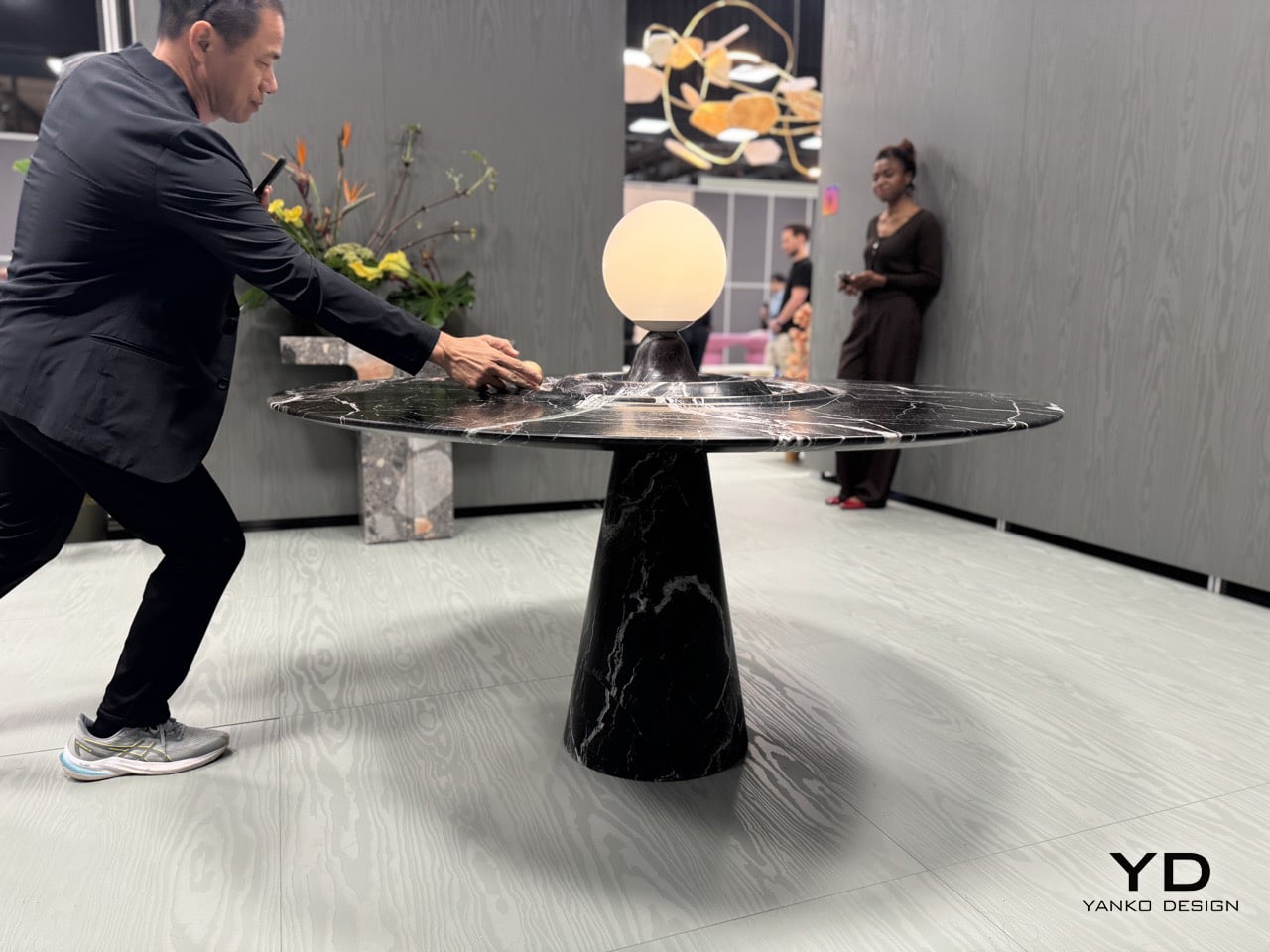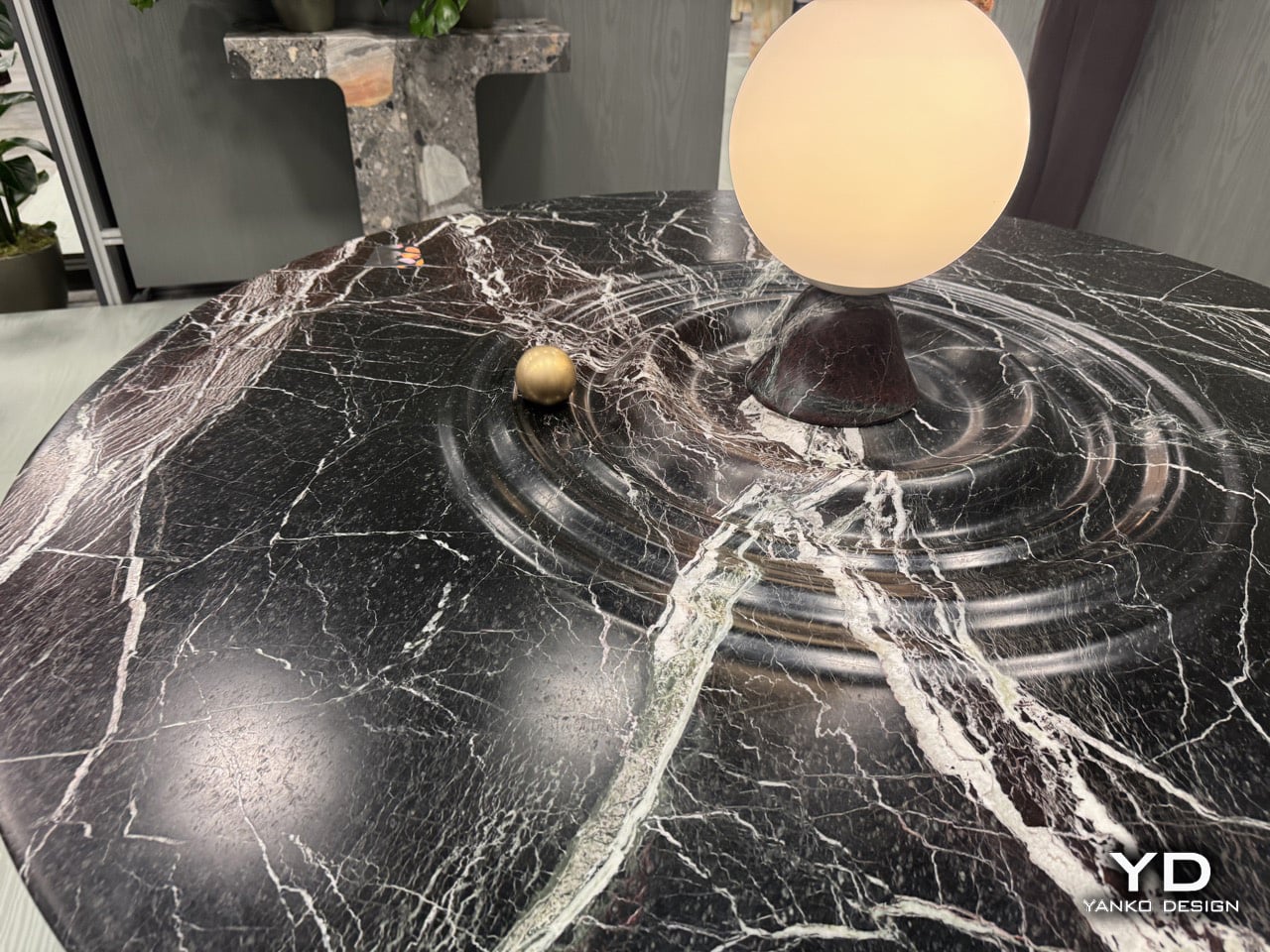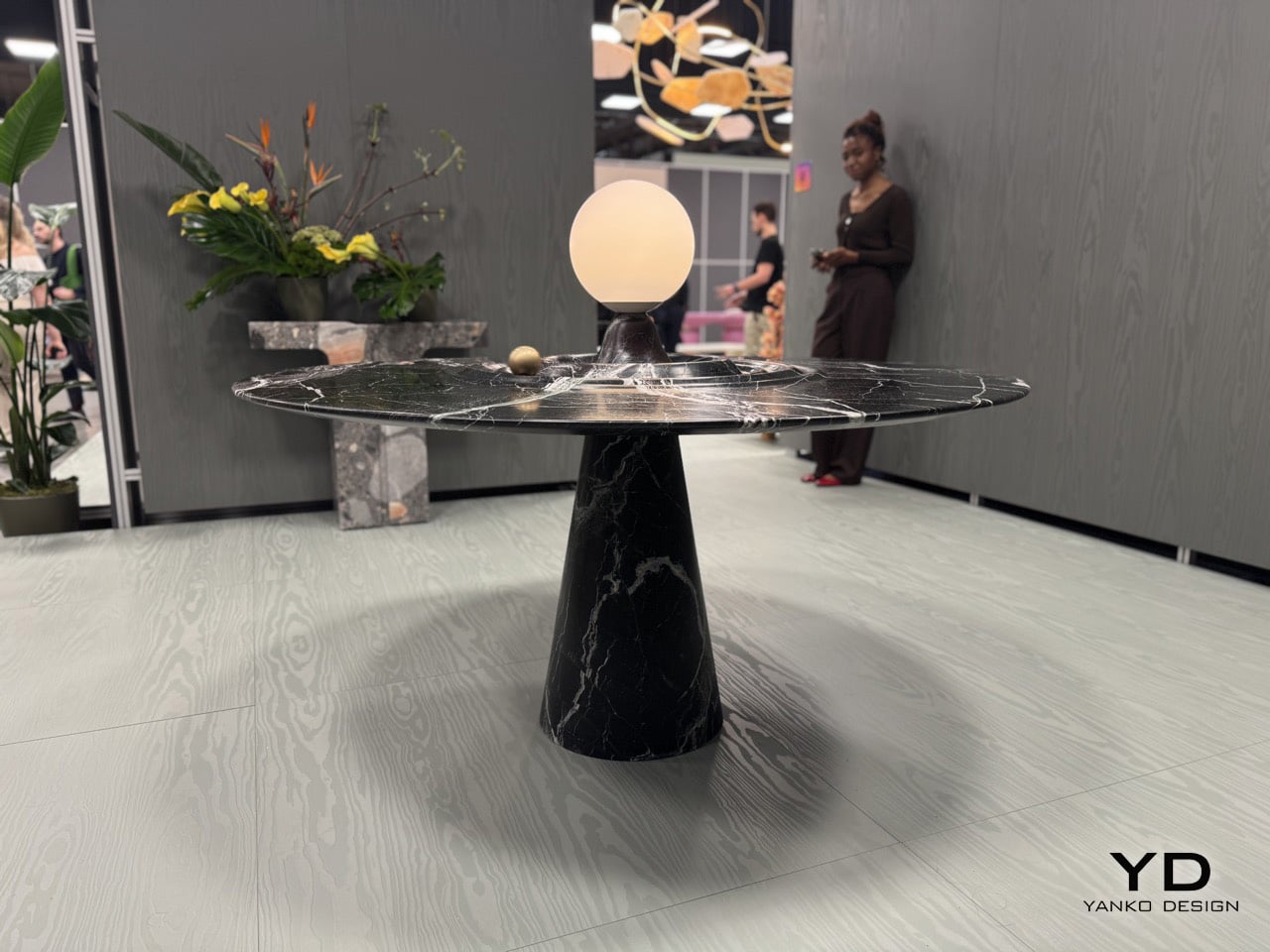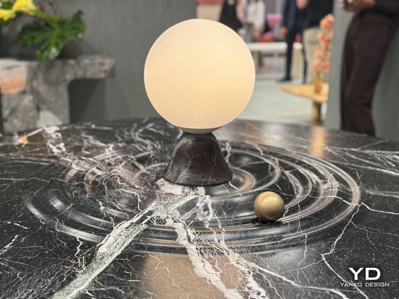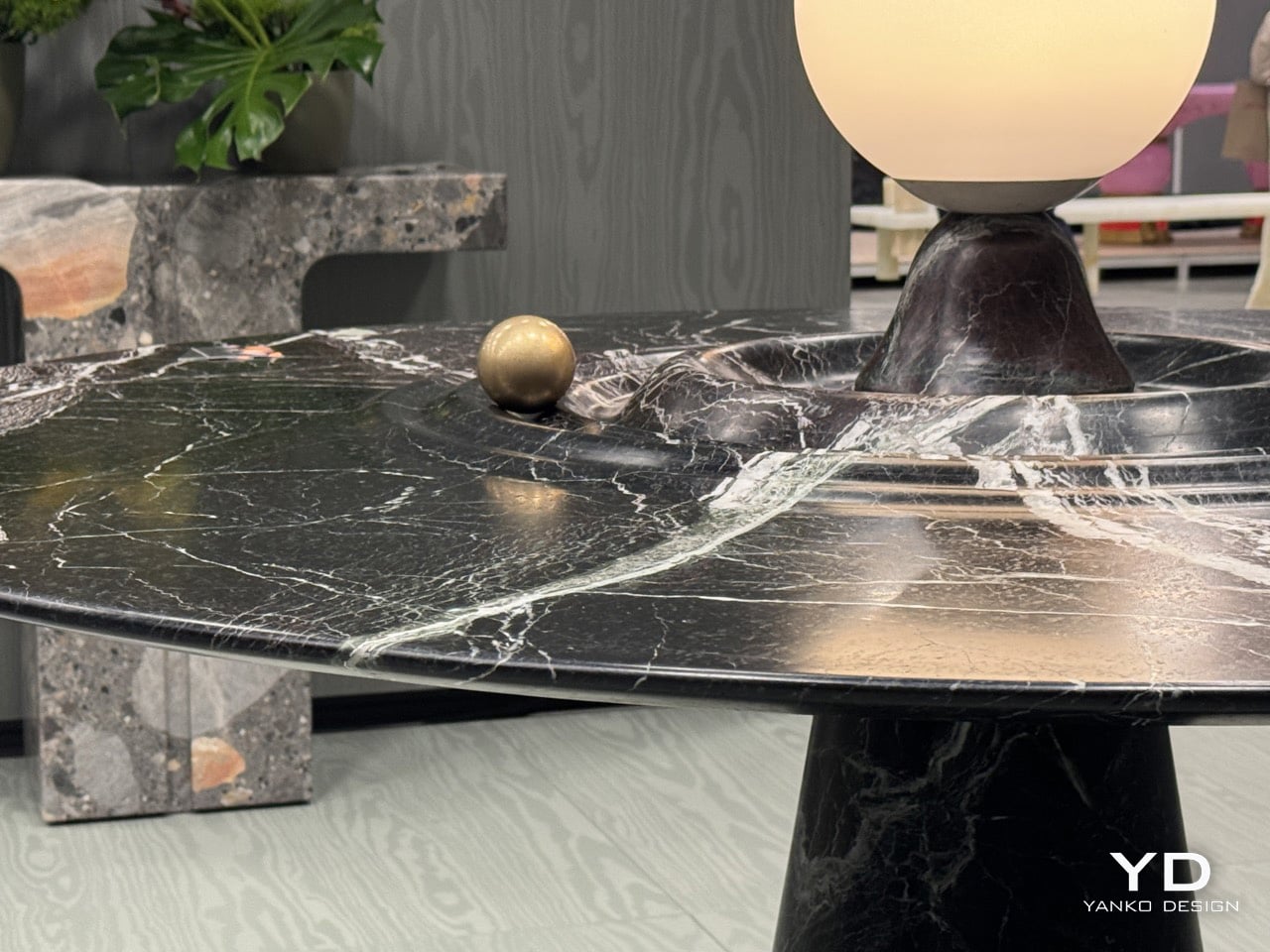 The central lamp adds another layer of functionality, illuminating the table from within while serving as the gravitational anchor for the sphere’s orbital path. The whole composition balances three distinct roles: functional dining surface, sculptural marble centerpiece, and interactive kinetic object. Most designers would’ve picked one and committed. Scalabrini made all three work simultaneously.