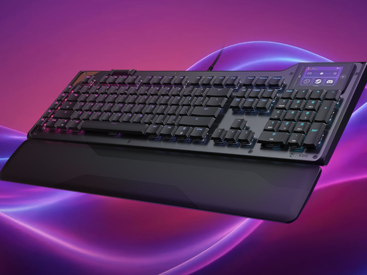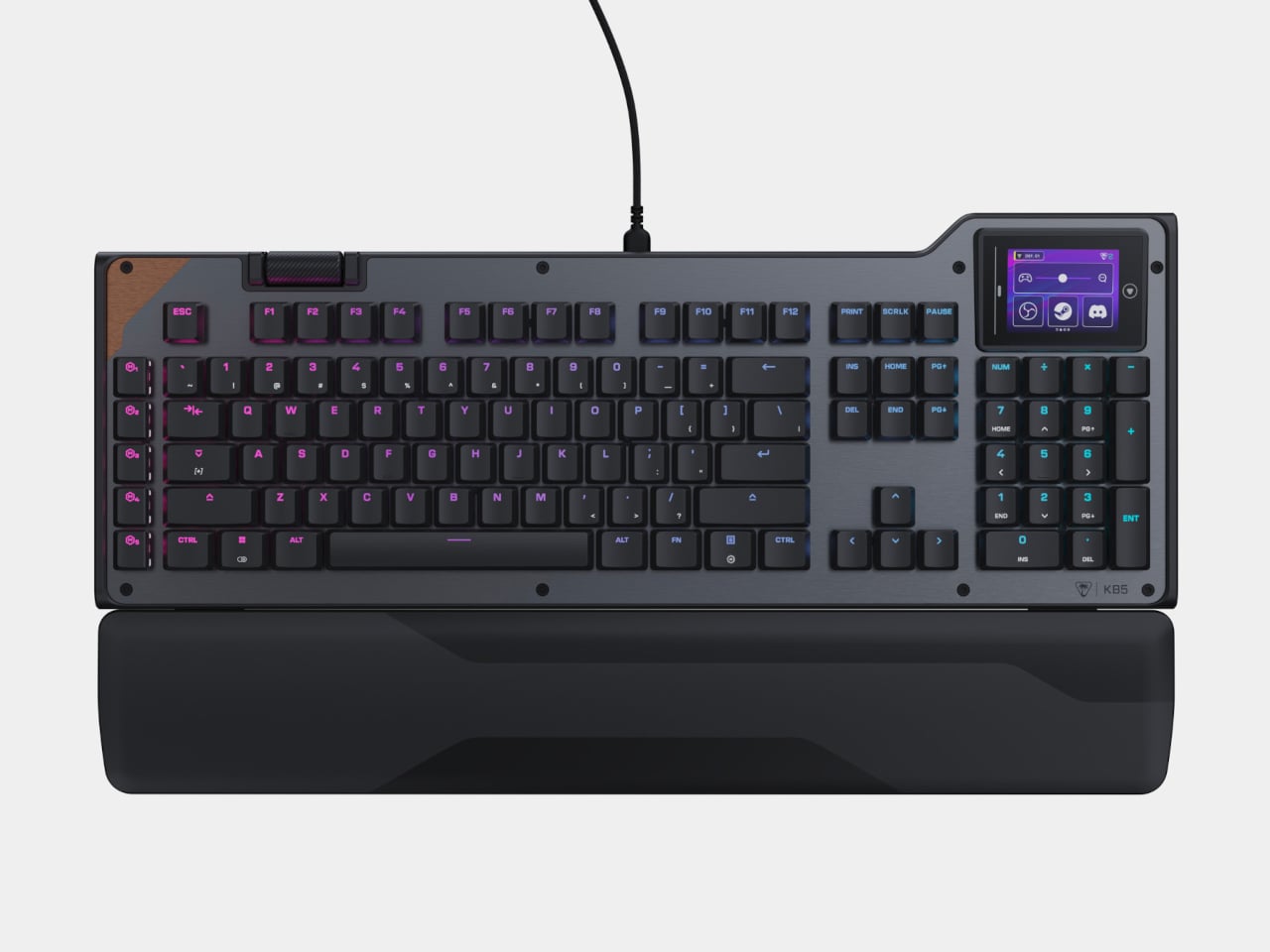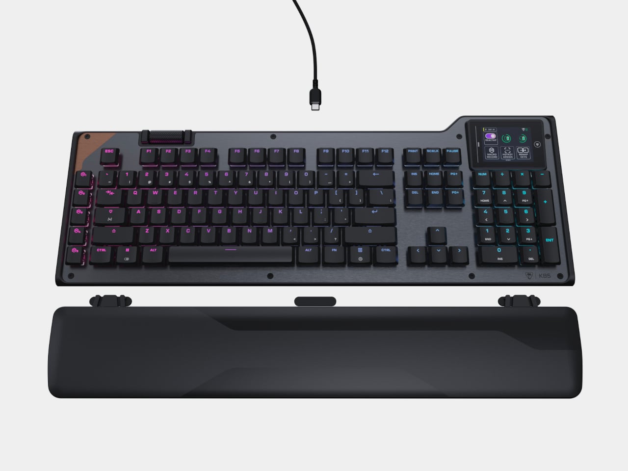 The KB5 is the full-size option at $149.99, offering the numpad that the KB7 leaves out. Its touchscreen shrinks to 2.4 inches but still handles OBS integration, profile switching, and macro control. Titan low-profile mechanical switches actuate at 1.2mm, backed by ReacTap technology for faster resets. Five dedicated macro keys, a detachable wrist rest, and 8K polling round it all out.