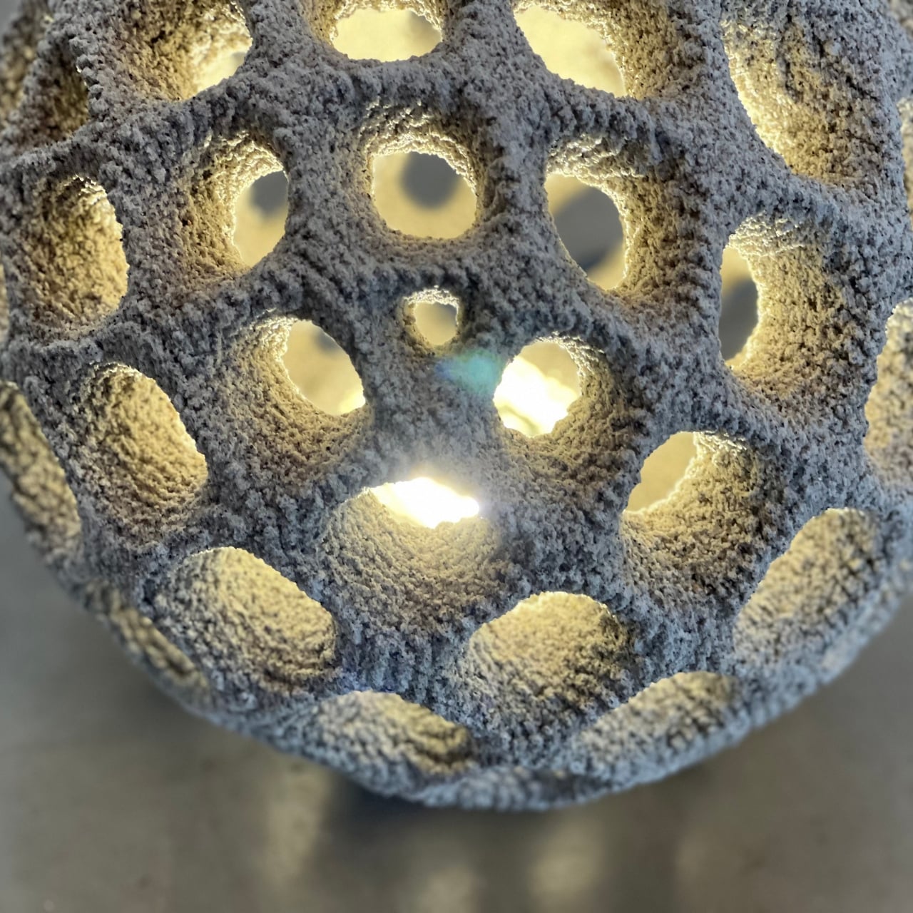 The Balloon is the work of studiooberhauser, an outdoor luminaire available in three sizes: 30 cm, 70 cm, and 100 cm in diameter. That largest version, by the way, currently holds the distinction of being the largest known 3D-printed lamp made from cement. I’m not usually one to get swept up in record-breaking superlatives, but that one genuinely deserves a pause. A one-meter sphere of printed concrete that glows through dozens of organic apertures? That’s not just a lamp. That’s a landmark.