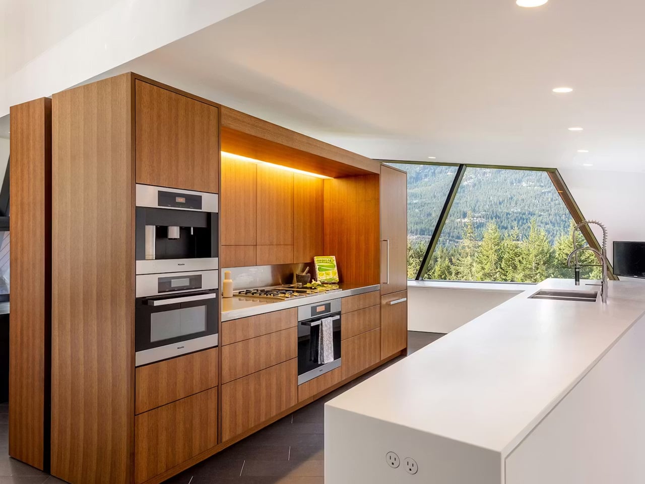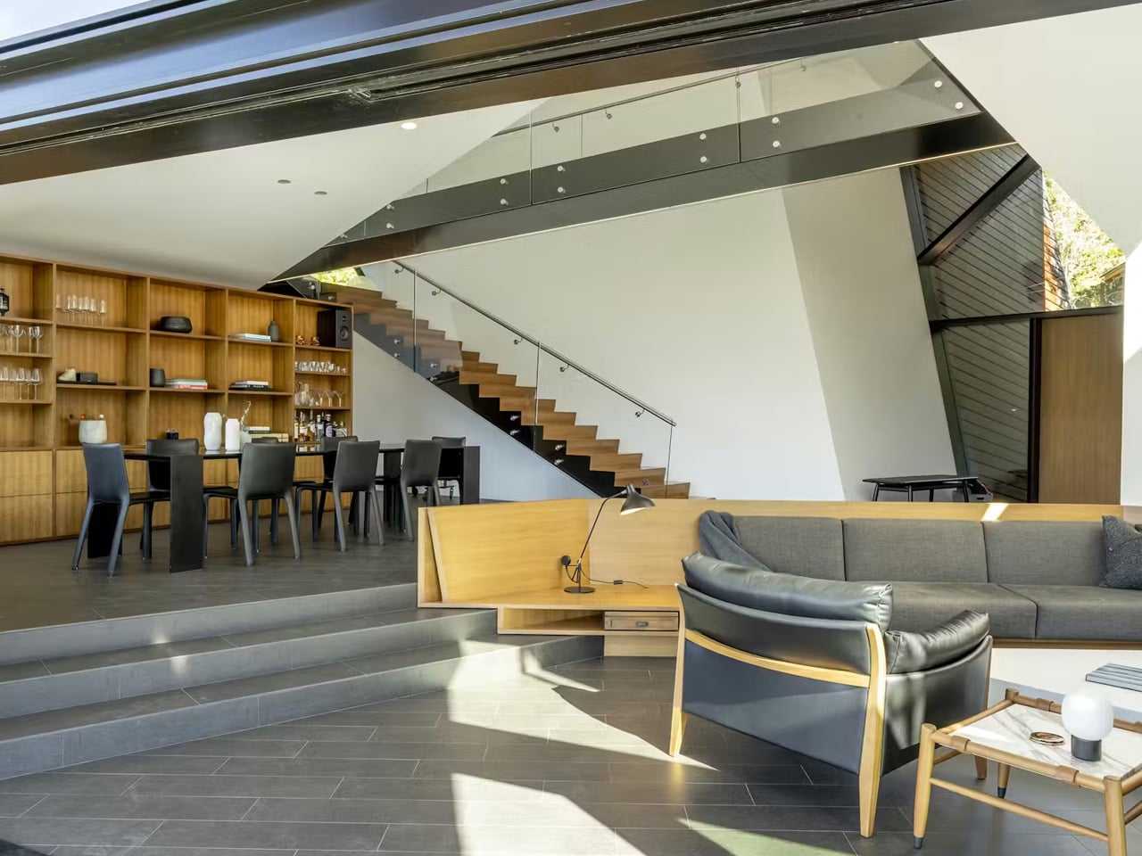 Inside, the home opens up in ways the exterior doesn’t telegraph. Soaring ceilings give the living spaces an almost civic scale, while expansive walls of glass frame panoramic views across Whistler Valley that shift with the light throughout the day. A glassy staircase rises to a catwalk above the main living area, adding a vertical drama that keeps the interior feeling animated. Glass sliders connect the living room to a large covered deck, making the boundary between inside and outside feel like a suggestion rather than a rule.