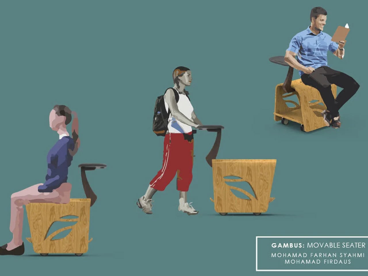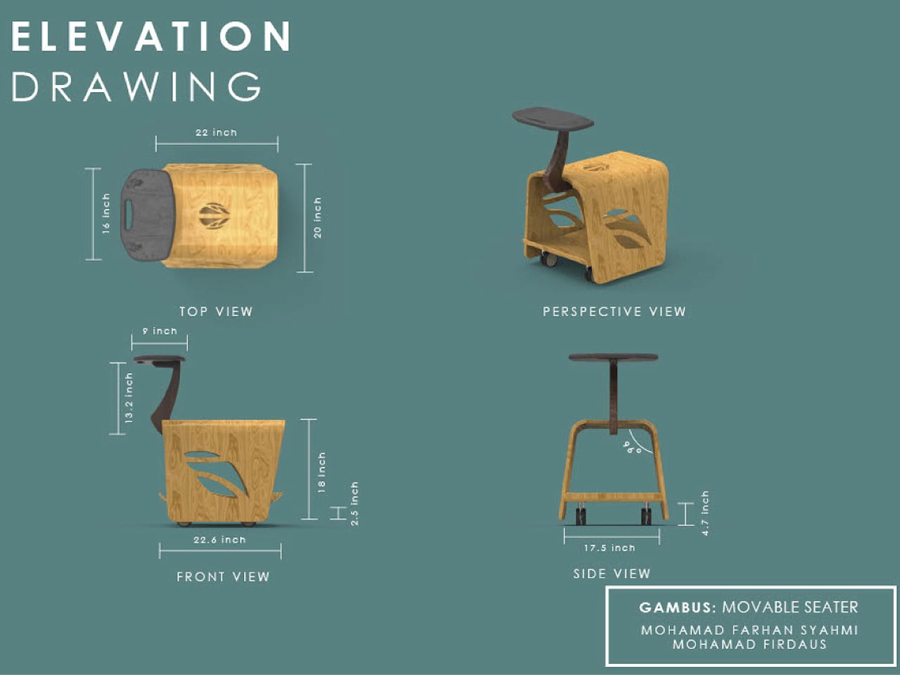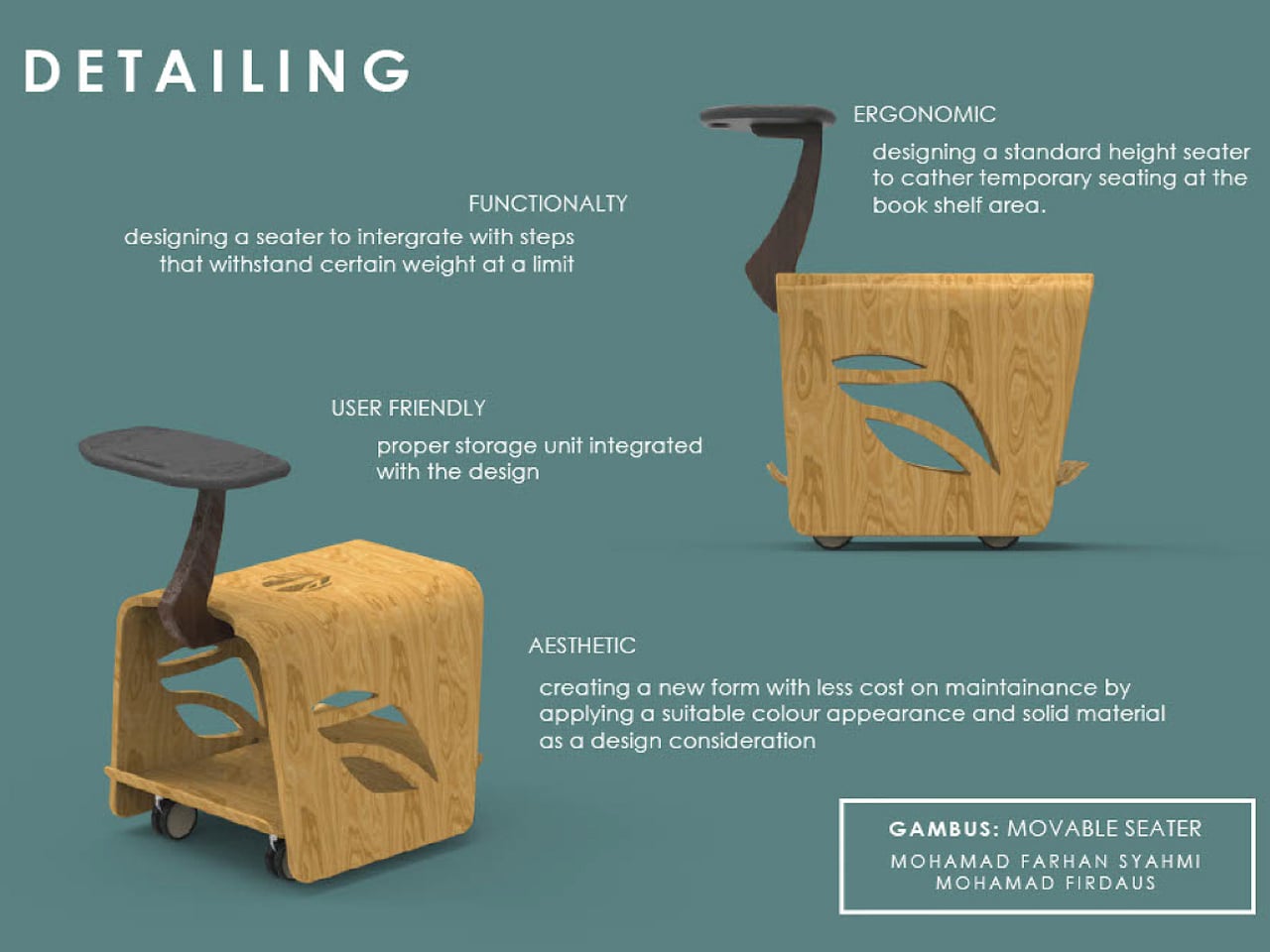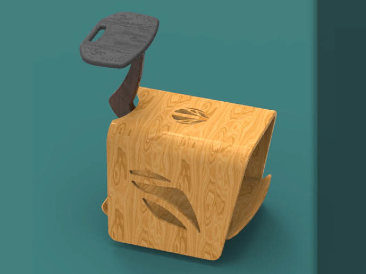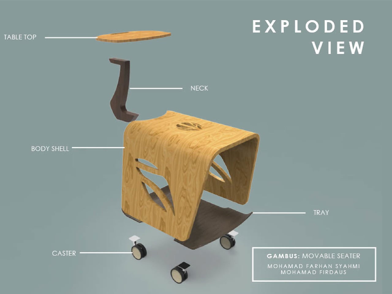 Inspired by the pear-shaped gambus instrument, the wooden body holds several books while doubling as a seat. A curved stem rises to form a small tabletop for resting your current read and helps guide the cart across the floor. Designed as a personal, movable reading nook, it encourages quieter, more intimate moments with books, even in busy shared spaces.