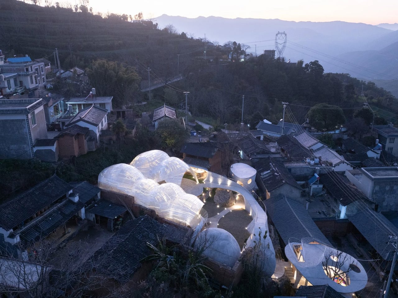 Stalk-like arches and mushroom-inspired canopies form a playful shelter for the Mushroom Library, a children’s reading space in Yanzitou Village, rural China. Envisioned as a “fantastical village landmark,” the library acts as a welcoming gateway to a future community centre and a lively gathering point. Inspired by the fungi found in nearby forests, the structure blends gently into its landscape while standing out as a symbol of cultural continuity. In a village facing depopulation, the library becomes a place where returning children and residents reconnect, turning weekends into moments of shared learning and intergenerational exchange.